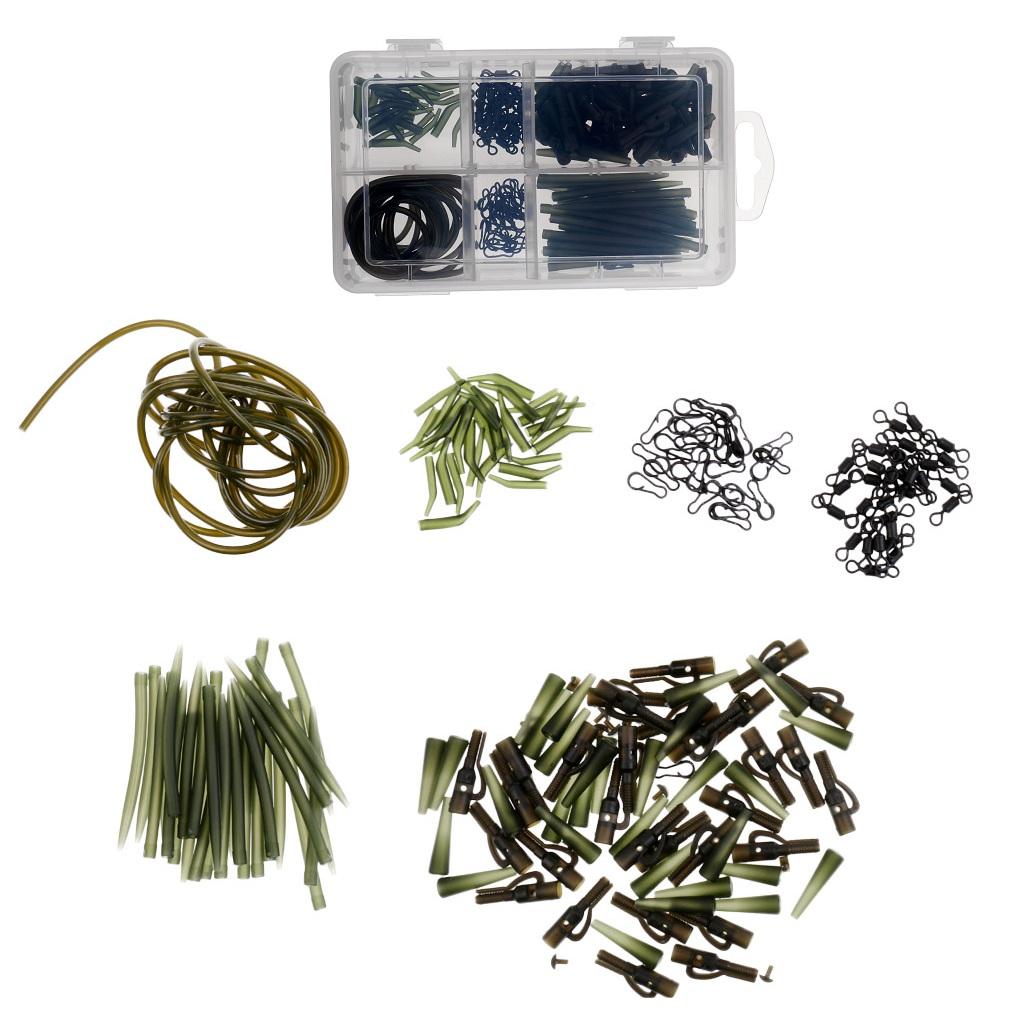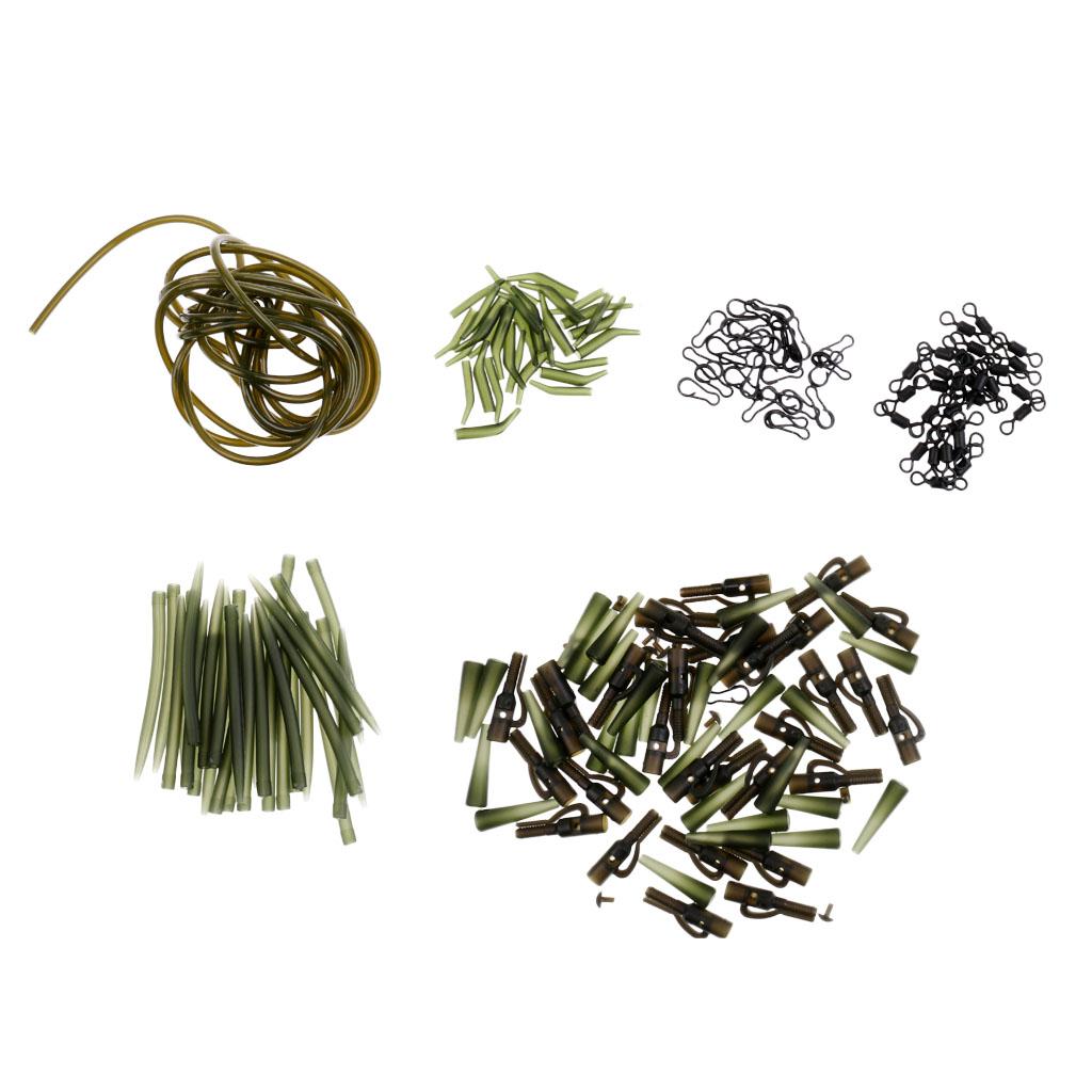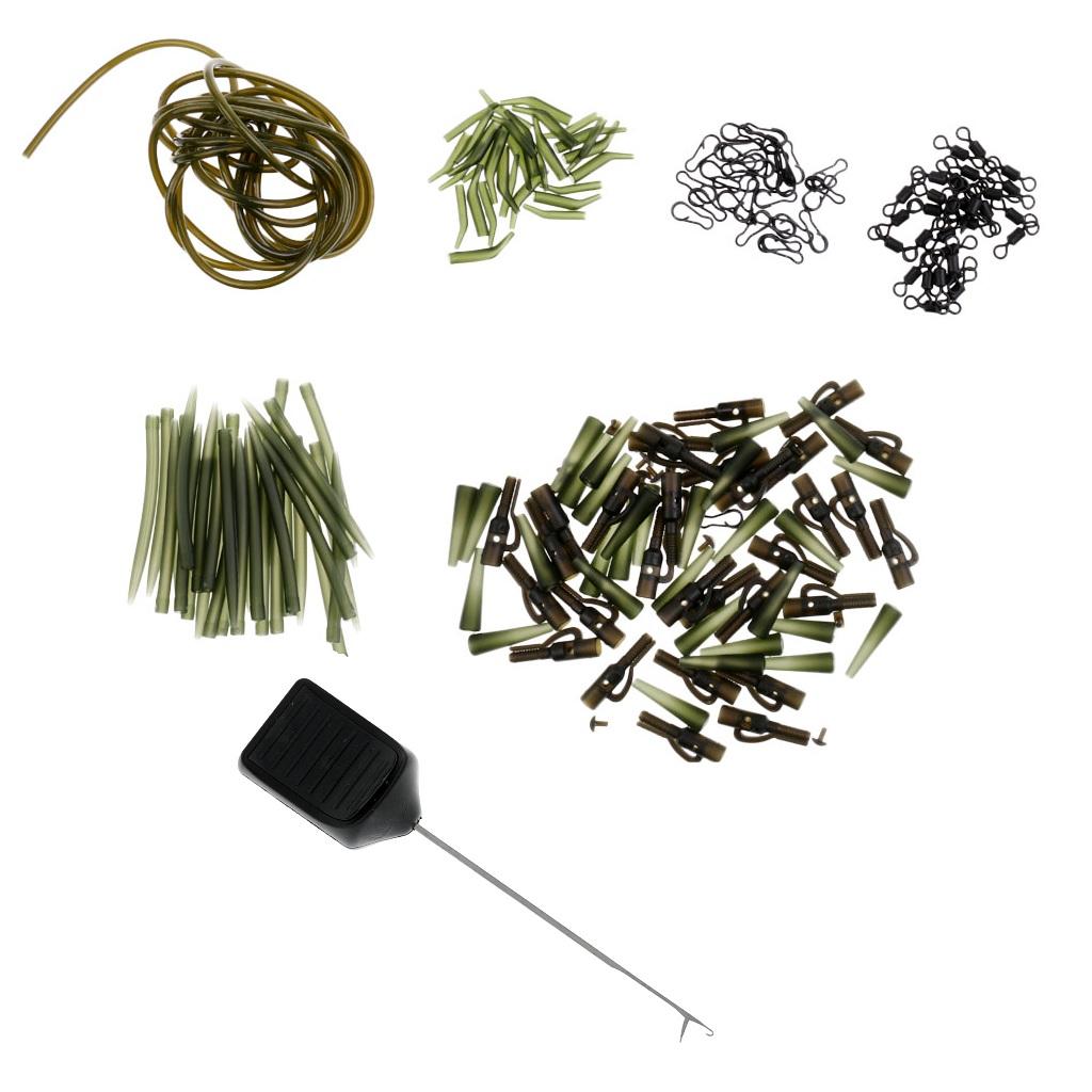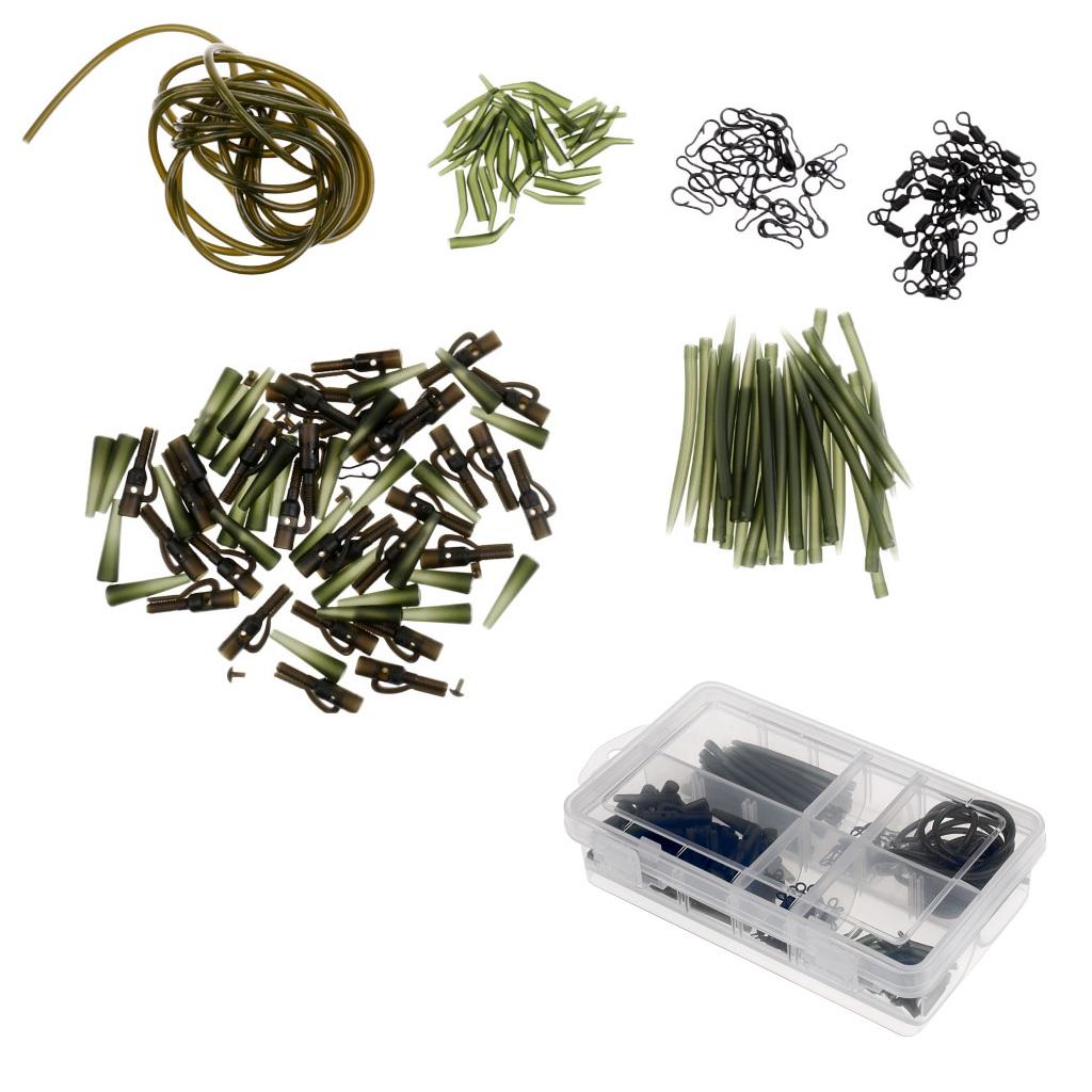 Set includes anti-tangle sleeves(2 type of size), locking cones, carp safety clips, rolling swivels, rig tube(2 meters long) and 1 baiting needle.