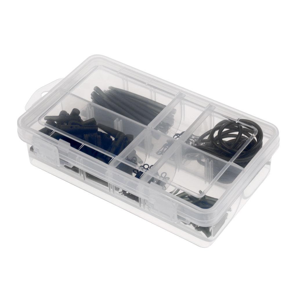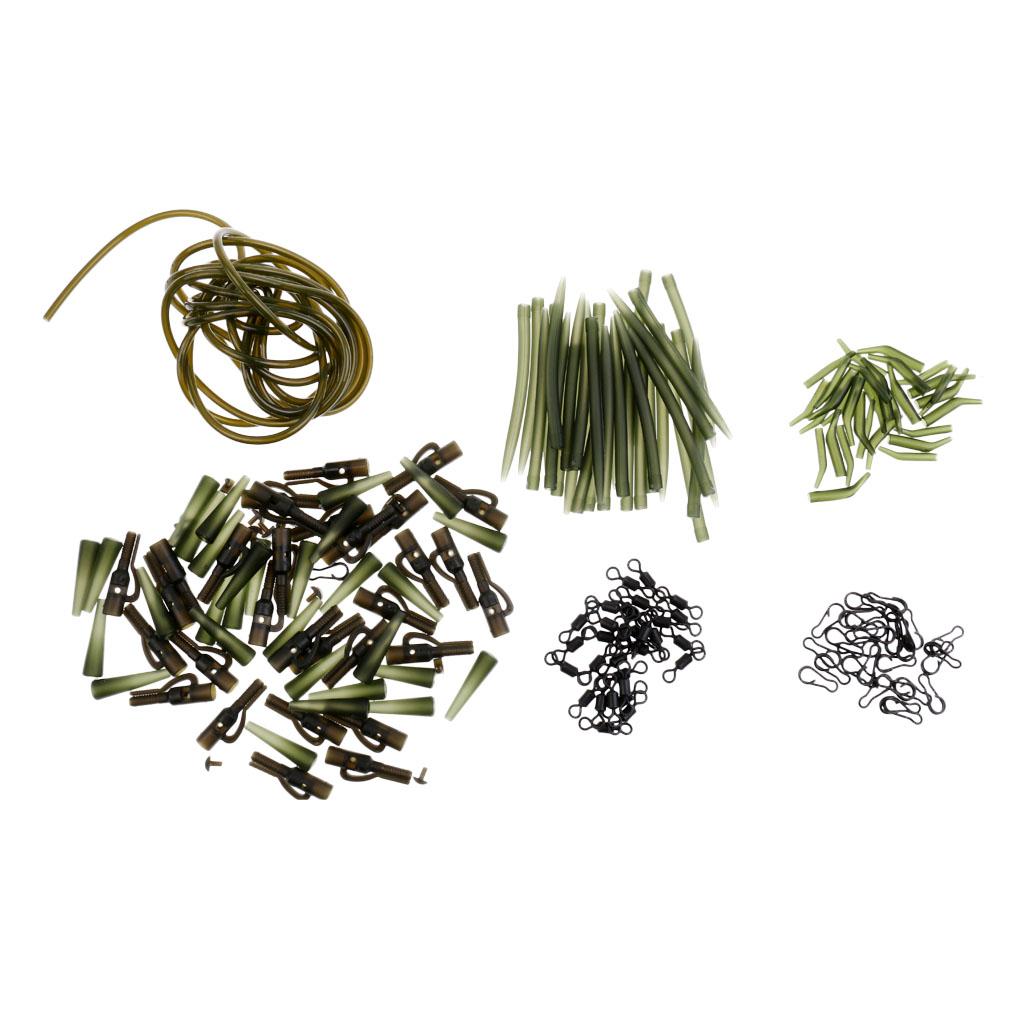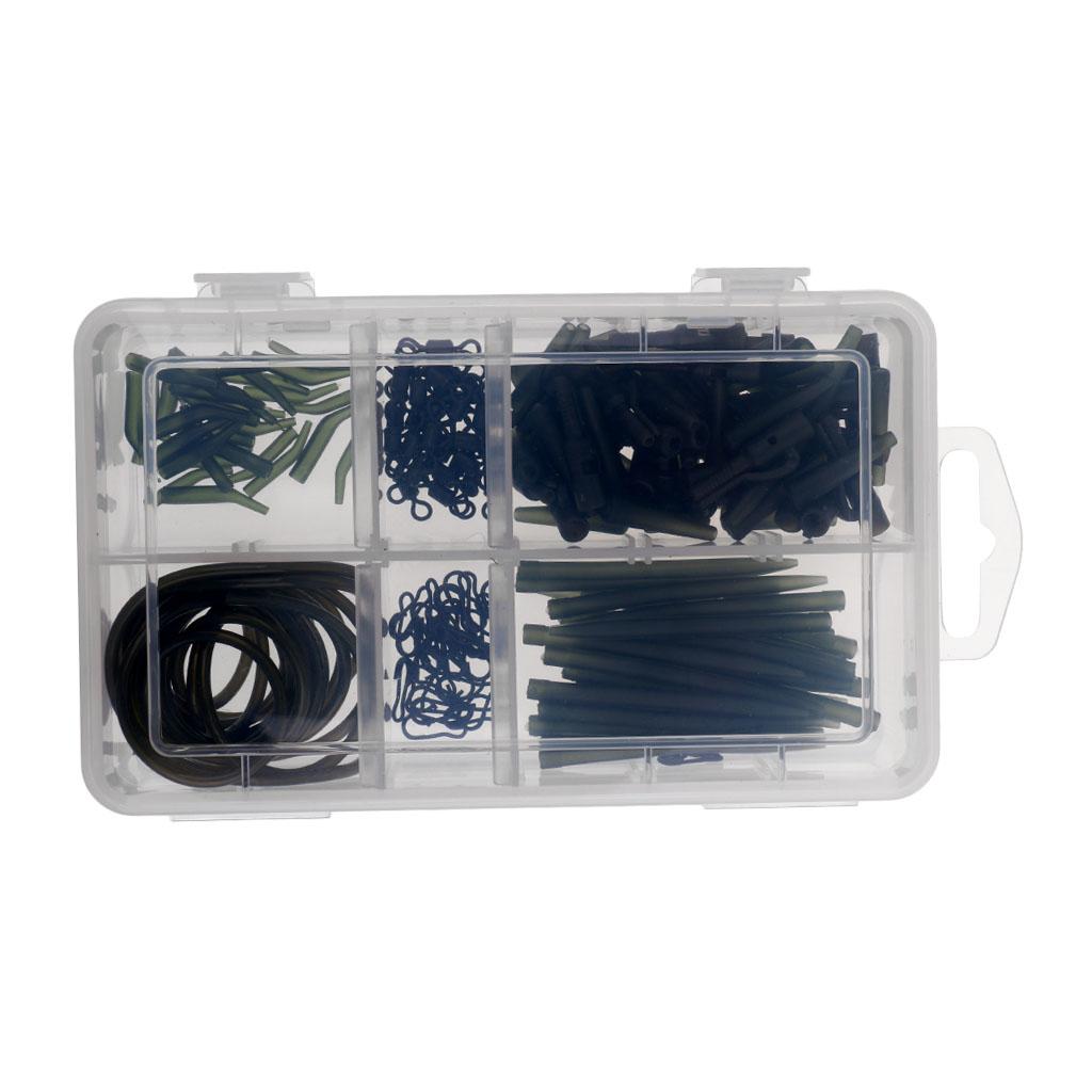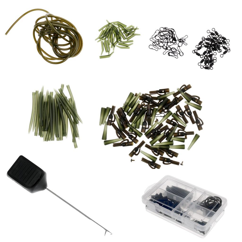 Set includes anti-tangle sleeves(2 type of size), locking cones, carp safety clips, rolling swivels, rig tube(2 meters long) and 1 baiting needle.