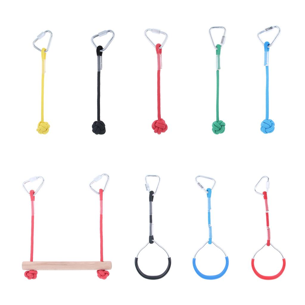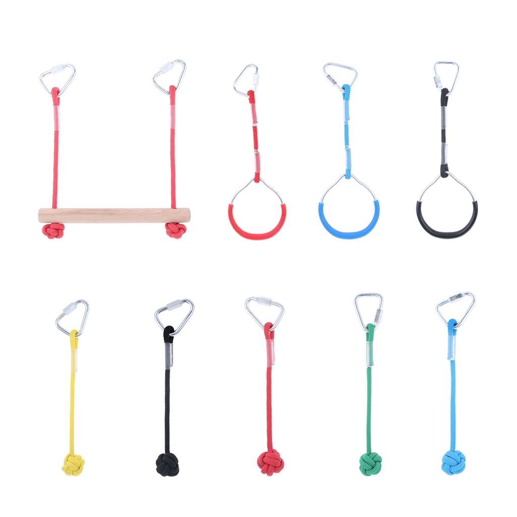 Gymnastic ring obstacle course attachments are heavy duty iron with super strong nylon rope with stitched loops.