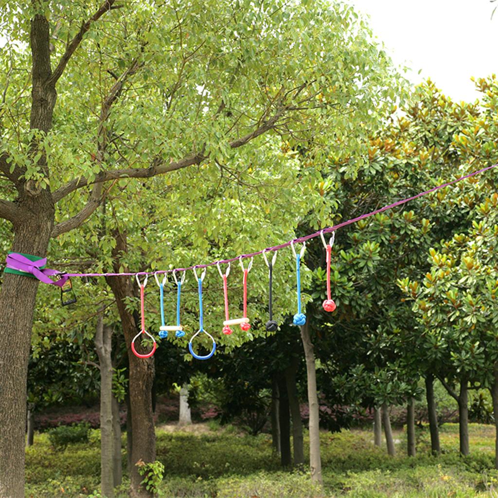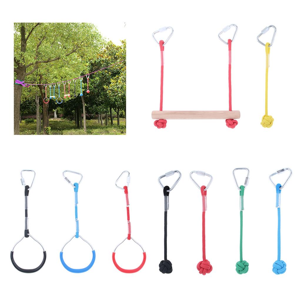 Gymnastic ring obstacle course attachments are heavy duty iron with super strong nylon rope with stitched loops.