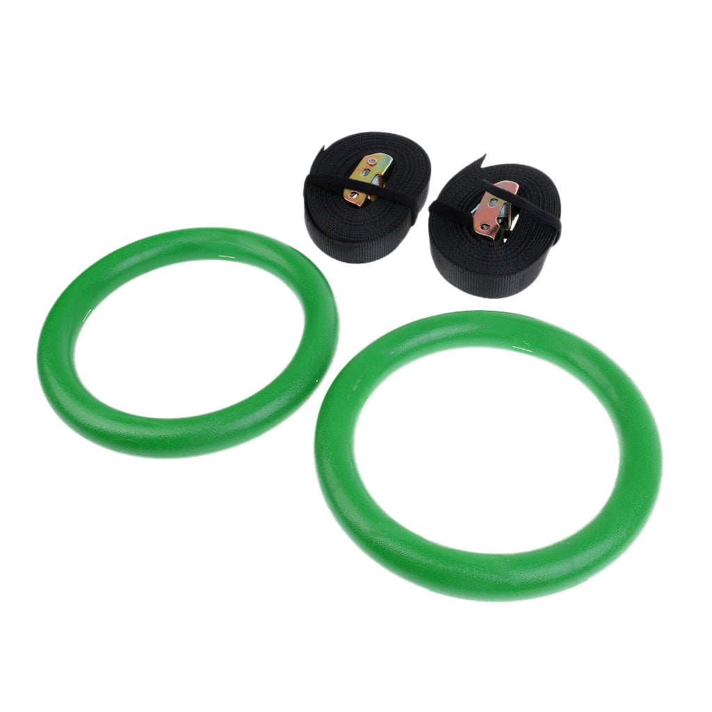 2 gymnastic rings with straps and adjusting buckles, rings are made of textured grippable plastic, more stronger and durable.