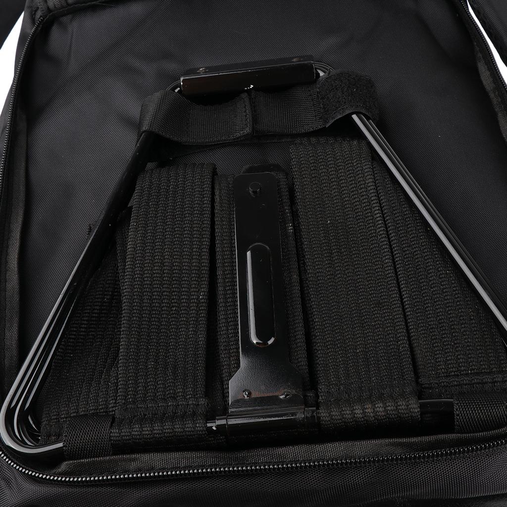 A small stool with padded seat folded at the backpack back