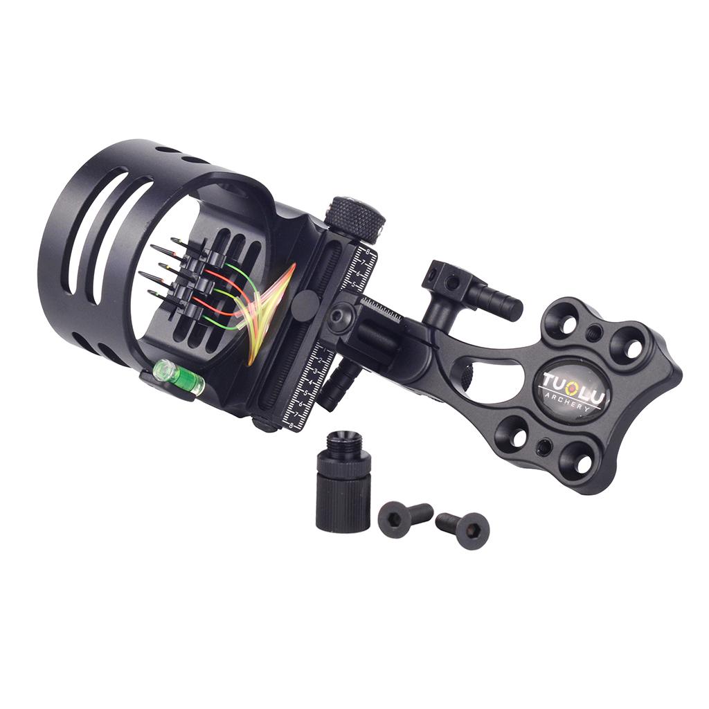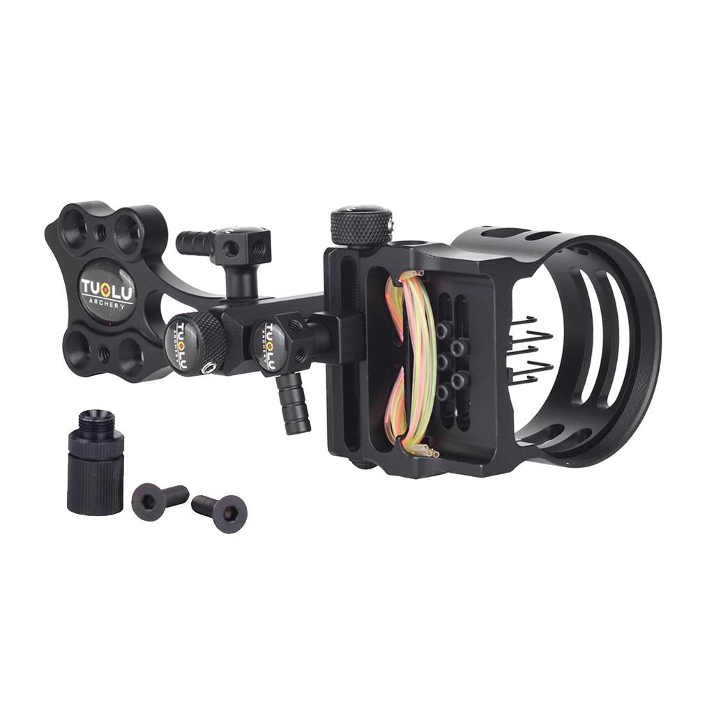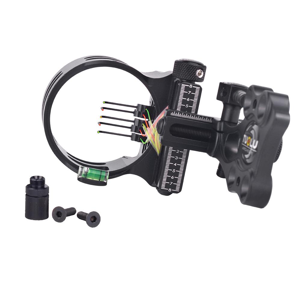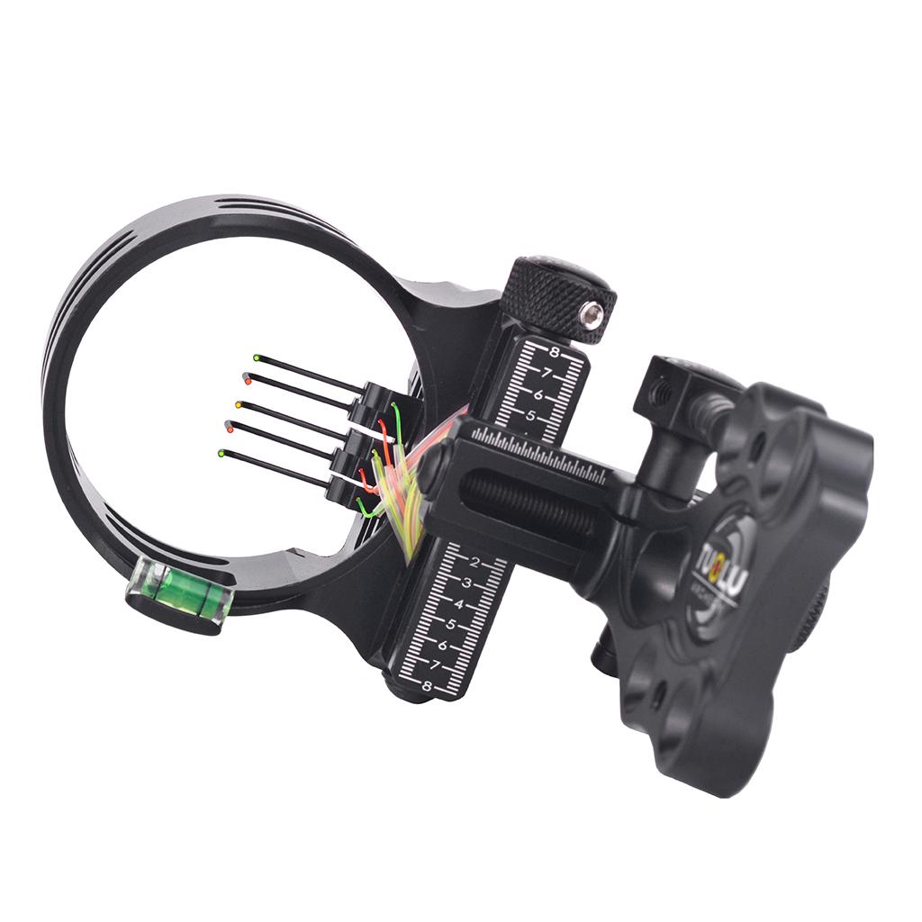5 pins - .019 fiber optic pins. Stack tight pins, built-in sight level