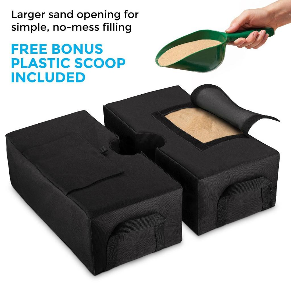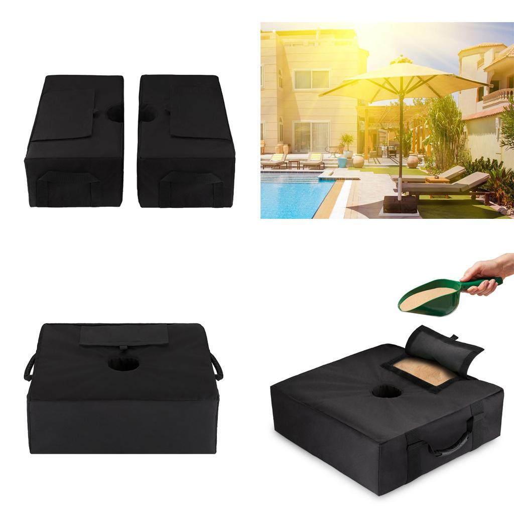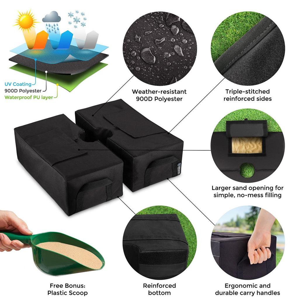 The square bag can be filled in about 50 pounds sand, safe enough to hold firmly the tent or umbrella, prevent it from falling down when there is big wind especially in summer days, keep you and your family and belongings safe, just sitting down under the sun shade enjoy your time in the beach, backyard, garden, etc.
