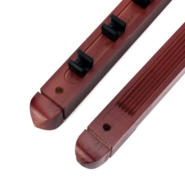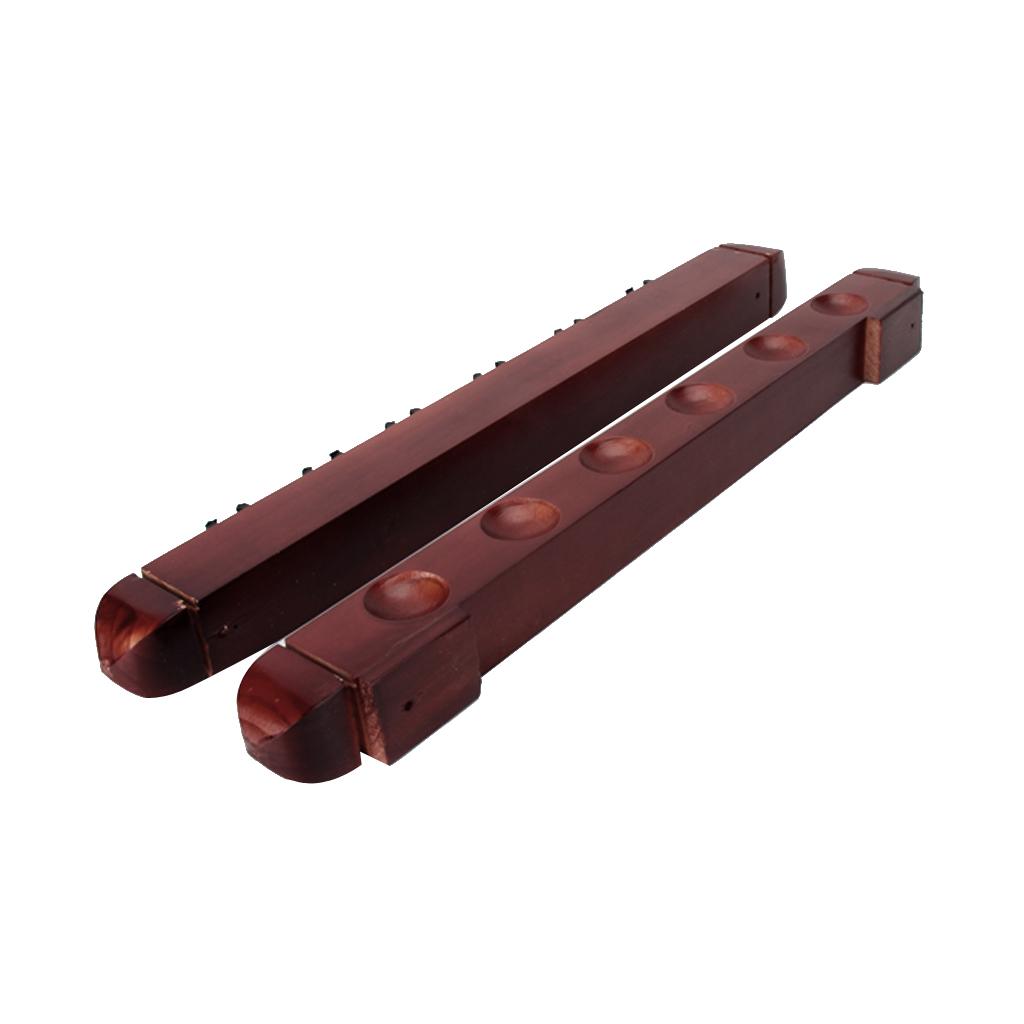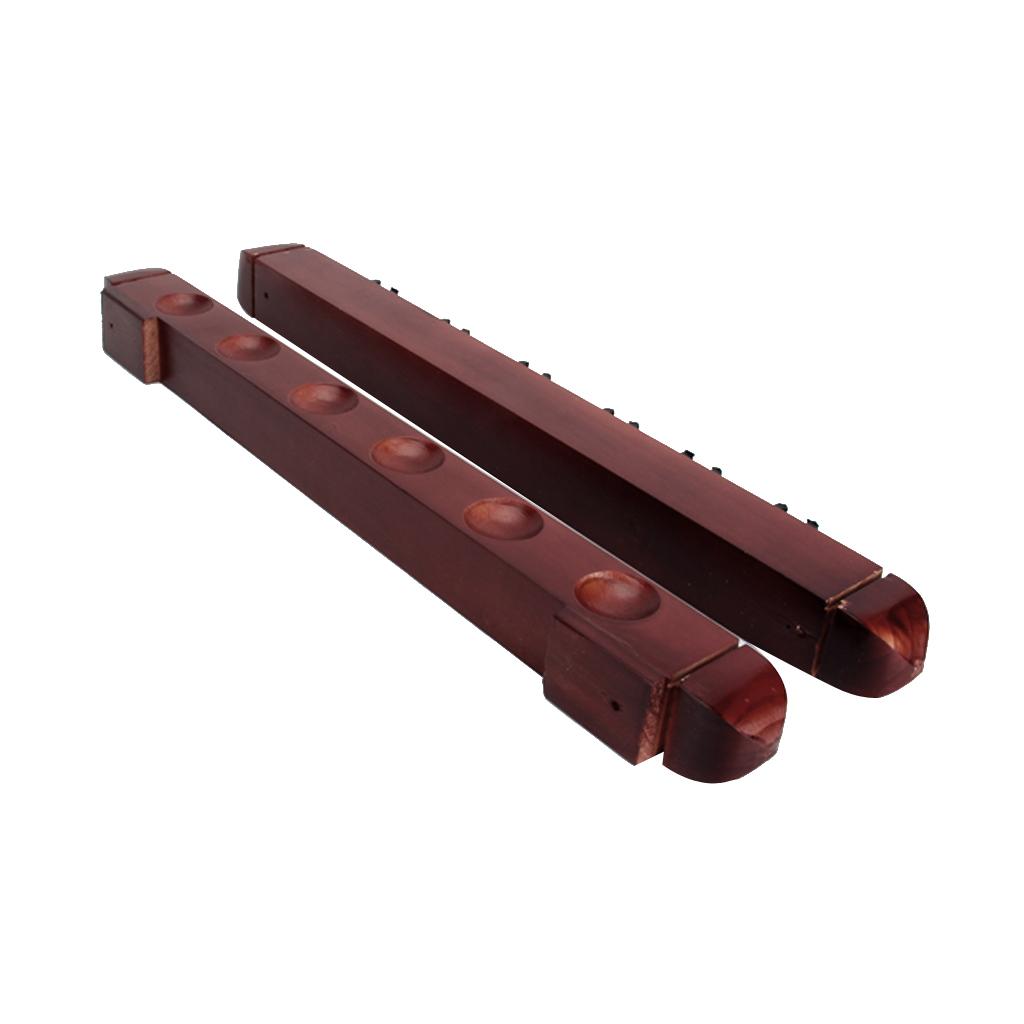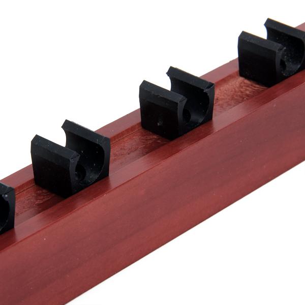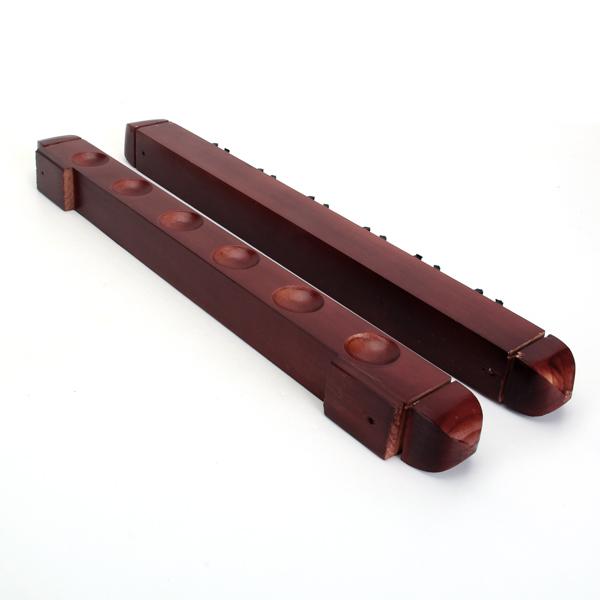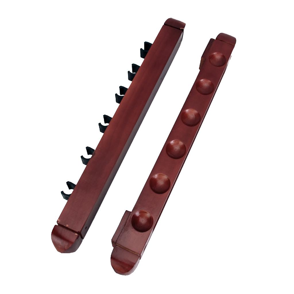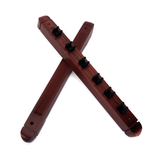 6-Cue Roman-Style Wall Rack will look great and work great with your pool table! This Wall Cue Rack holder holds 6 cues. This 6-Cue Roman-Style Wall Rack is made of solid hard wood, has gentle clips that won't hurt the cues.