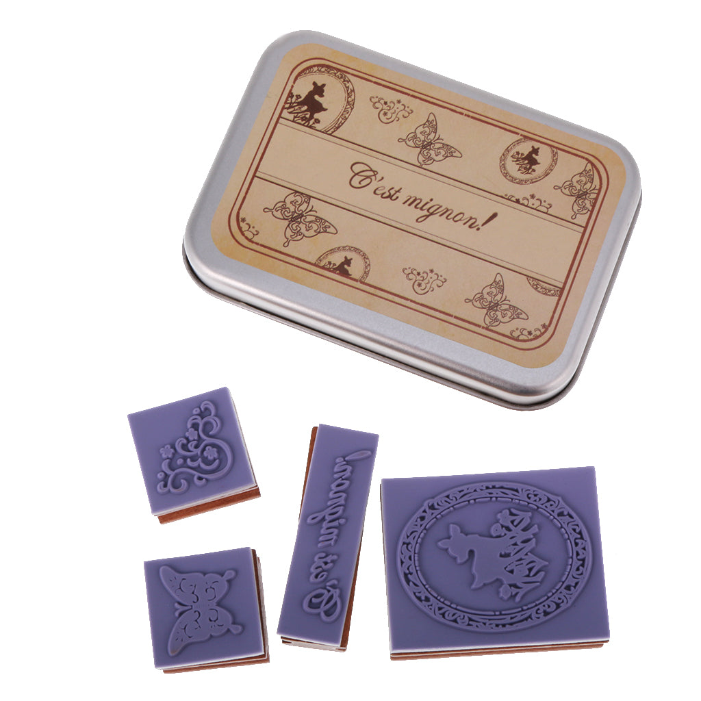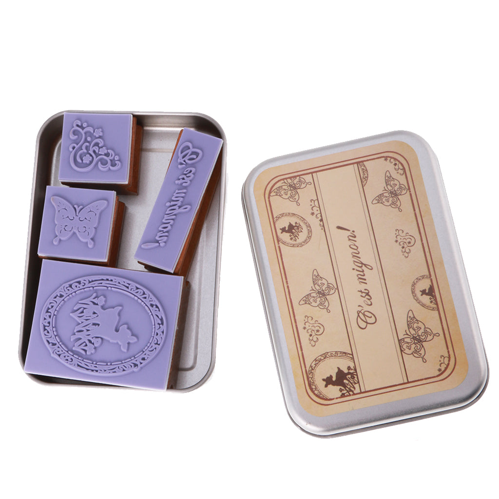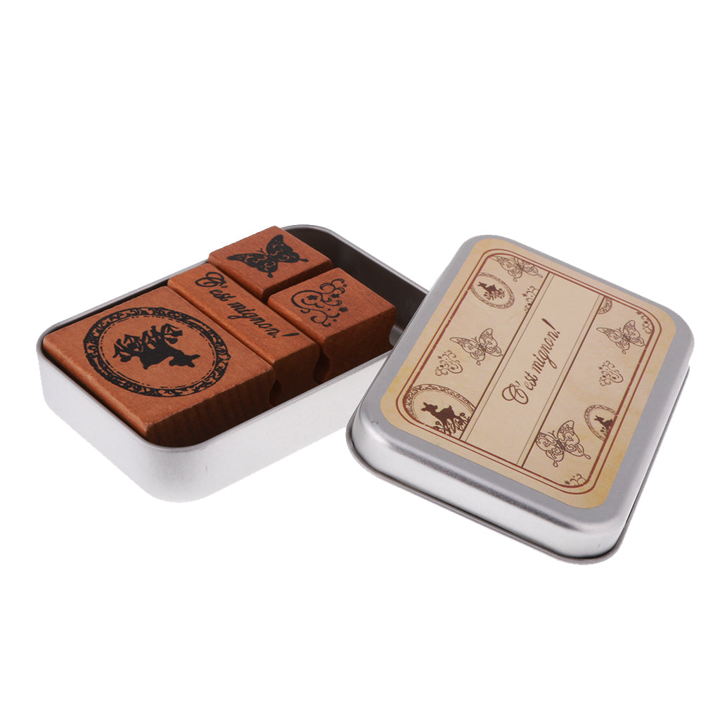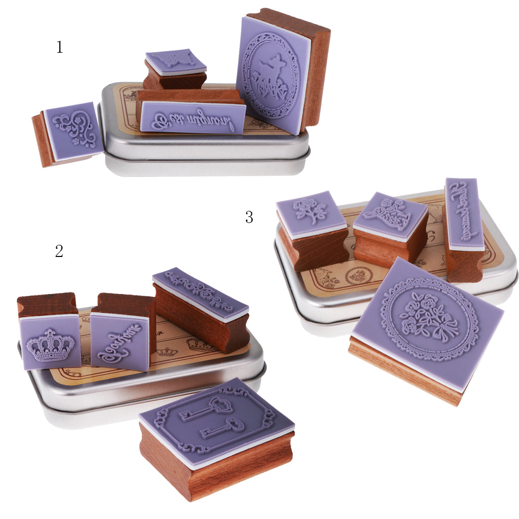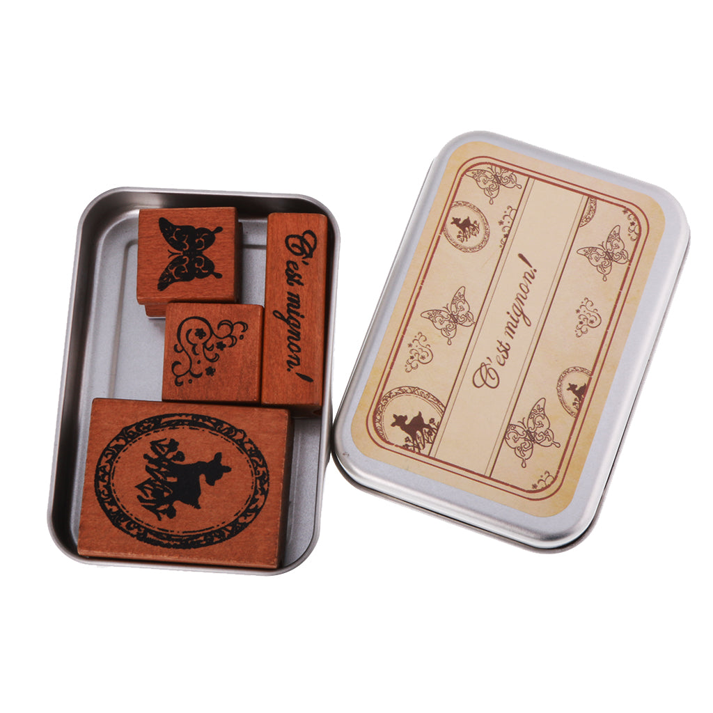 4pcs/ Set Retro Wood Stamp Scrapbooking DIY Card Making w Iron Box #1