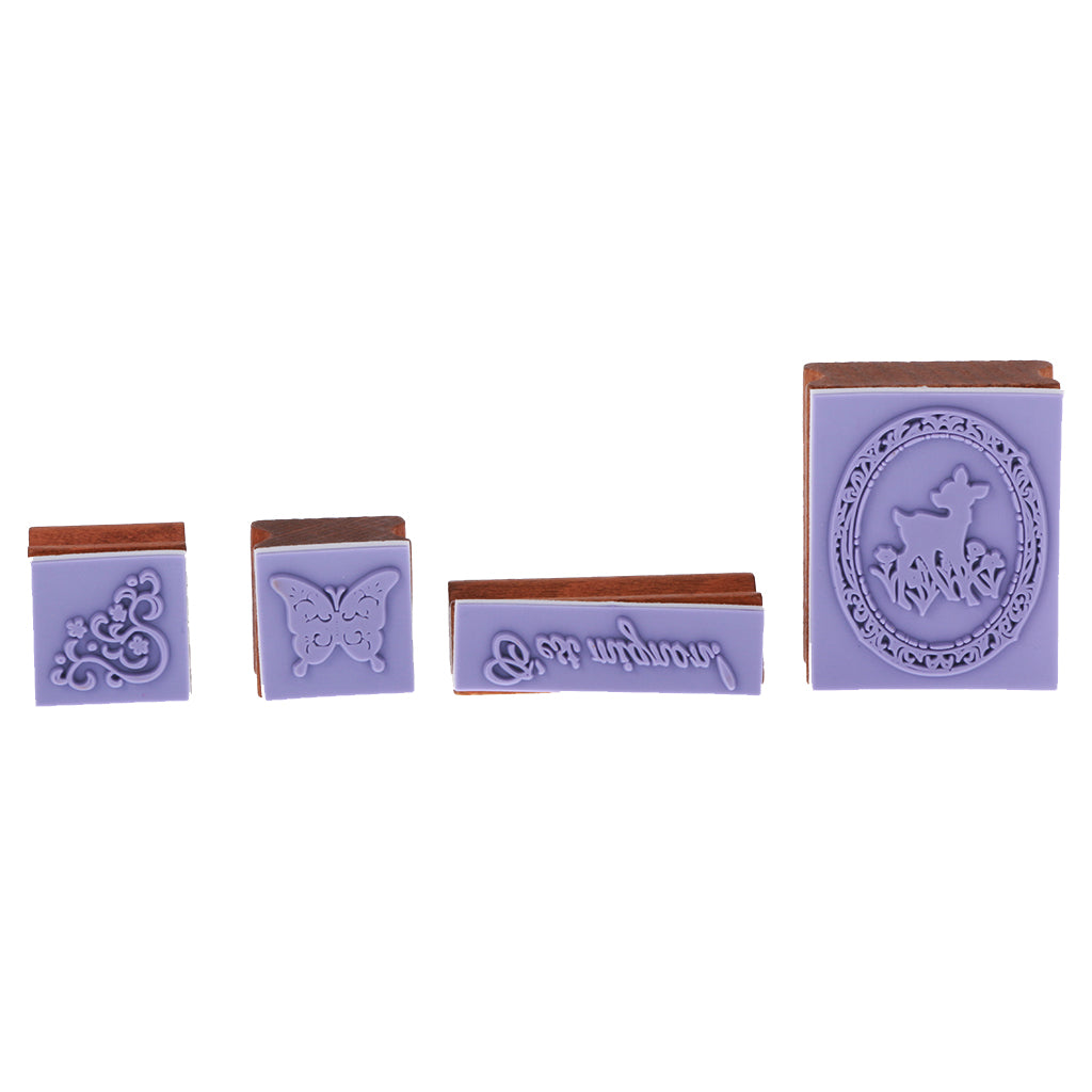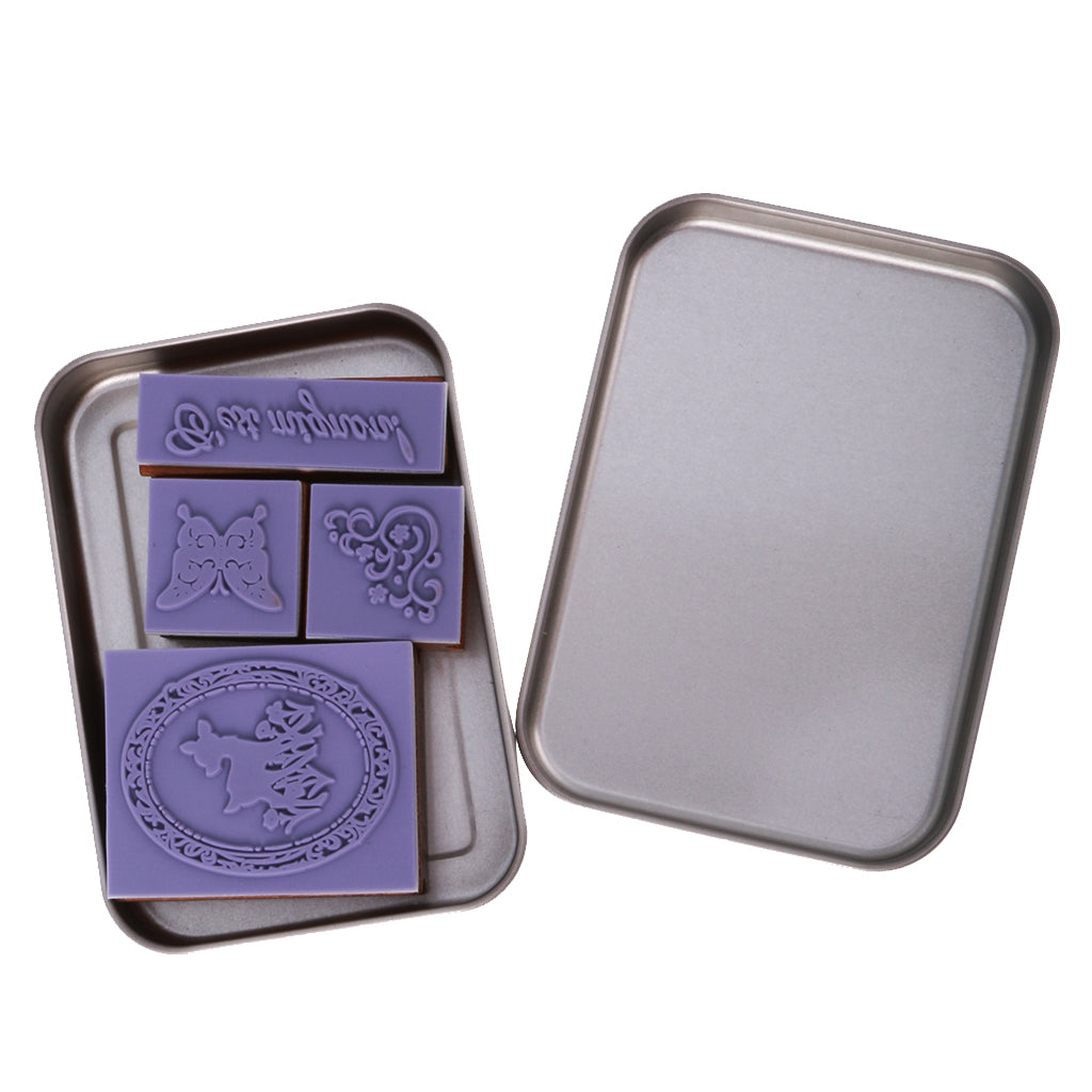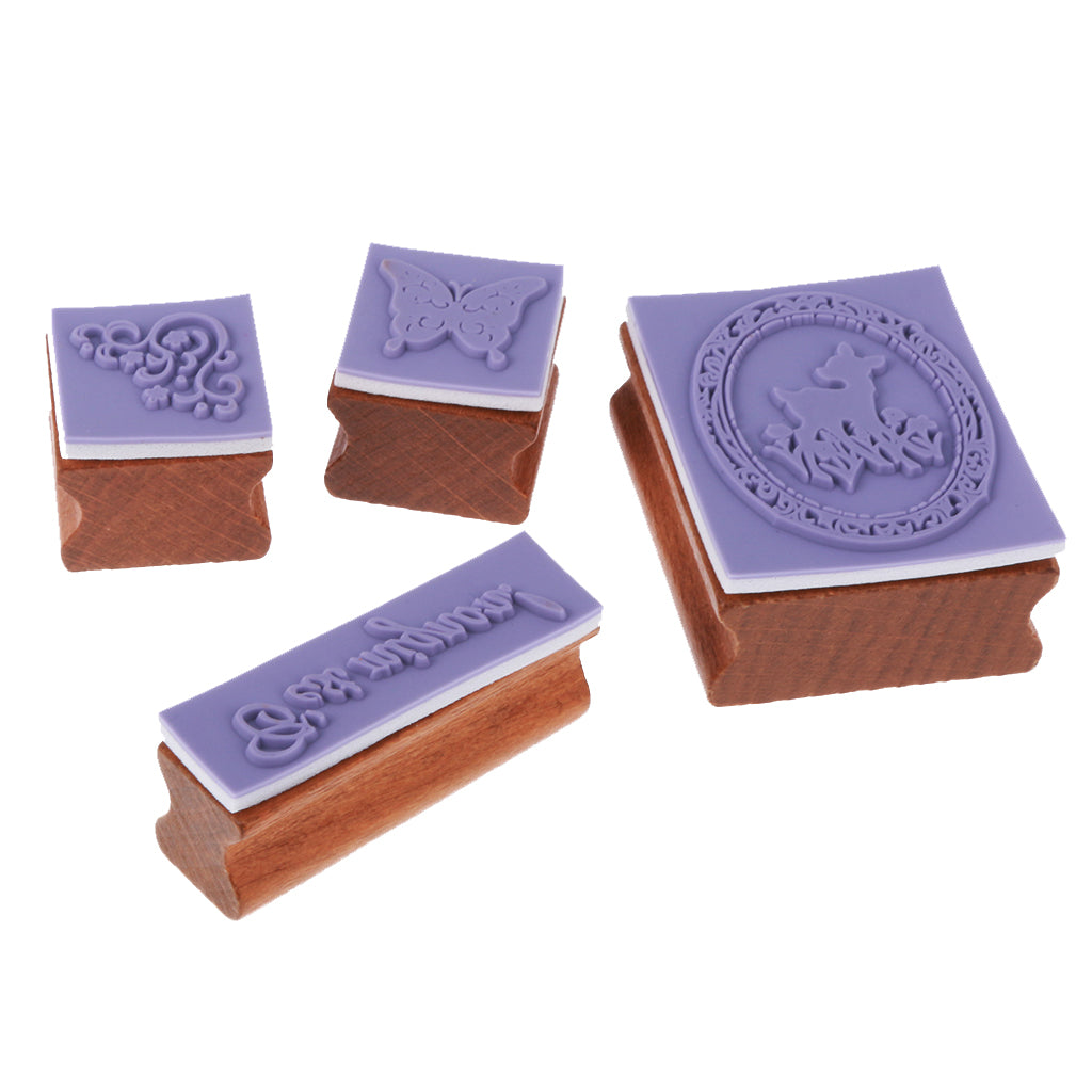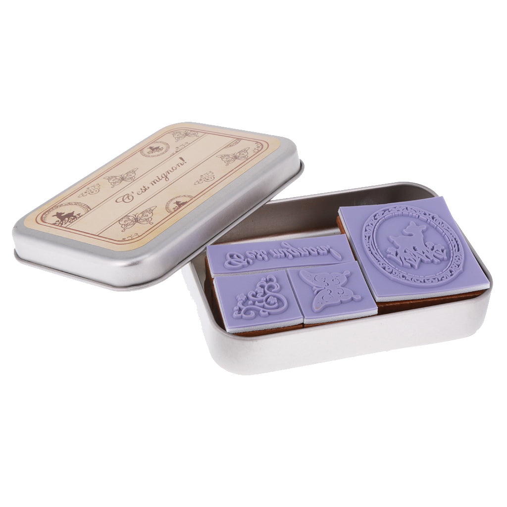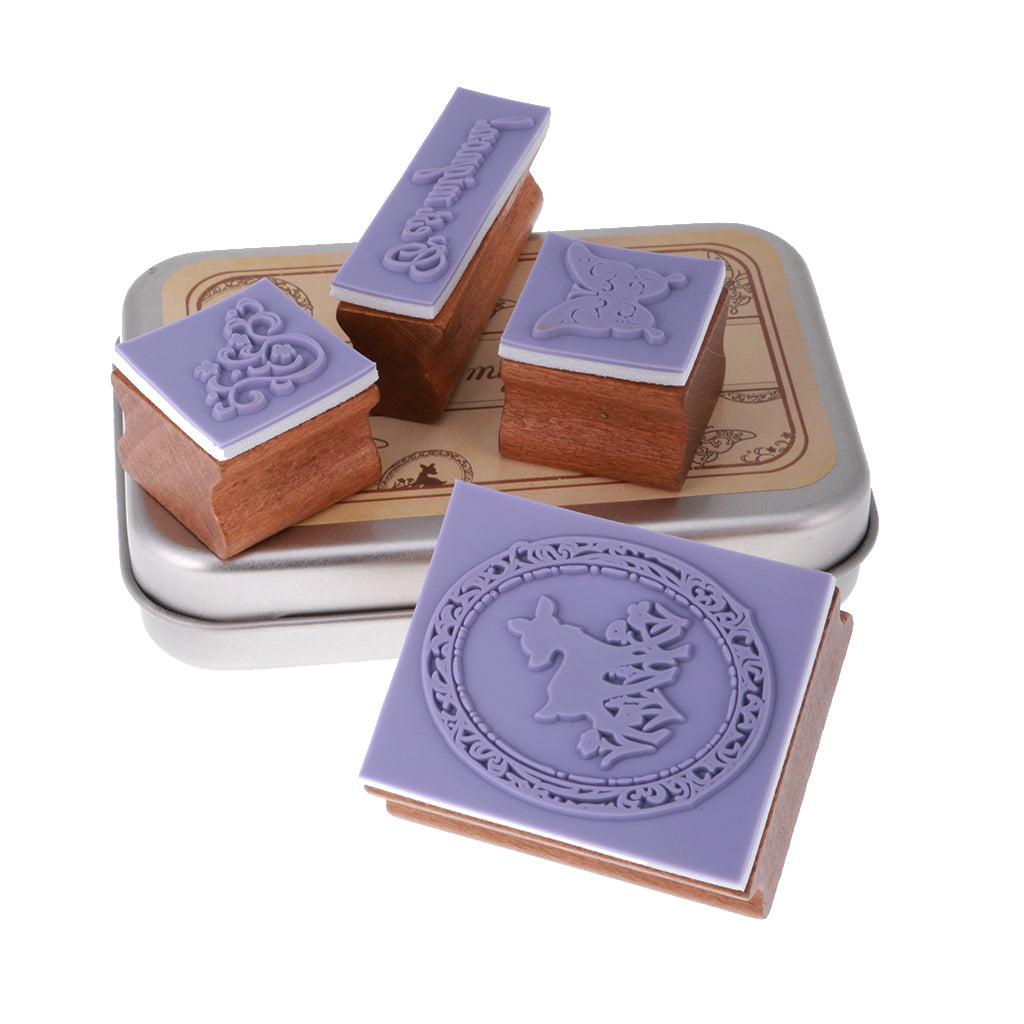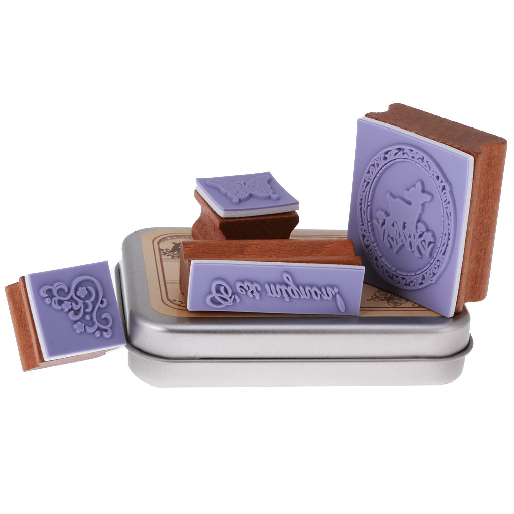 4pcs/ Set Retro Wood Stamp Scrapbooking DIY Card Making w Iron Box #1
