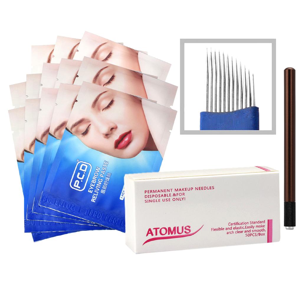 1pcs Coffee Eyebrow Permanent Tattoo Manual Pen +12pcs Eyebrow Relieving Paster Pain Relief+50pcs Microblading Needles