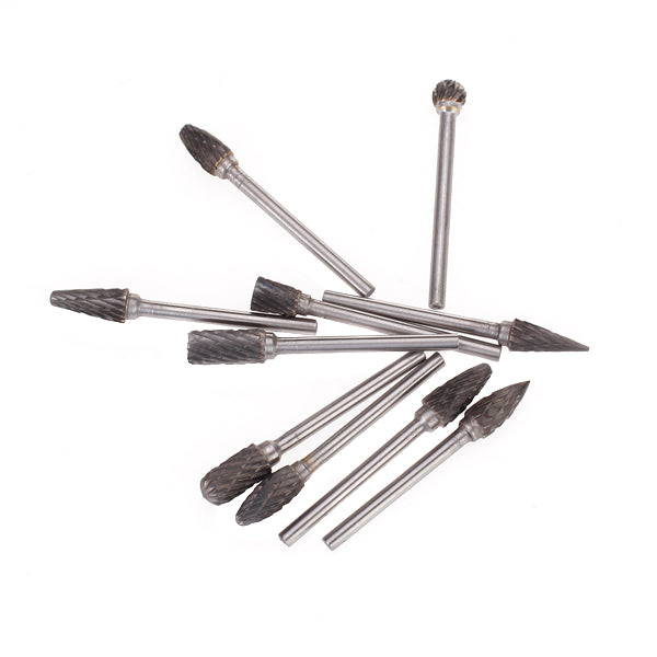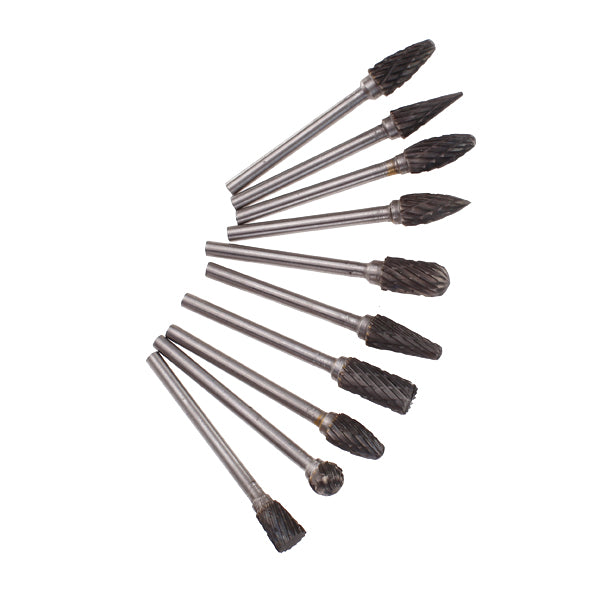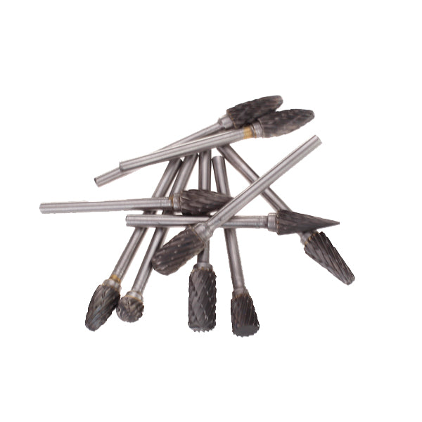 10pcs assorted carbide burrs are preferred for accurate metal removal when shaping, leveling, or porting cast iron, steel, and other nonmetal materials. These carbide burrs come with approx. 6mm head diameter and 3mm shank.