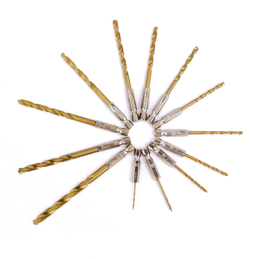 Titanium coated HSS drill set with standard 1/4" hex shank that will fit cordless screwdrivers, drills etc or use in standard drill chuck.