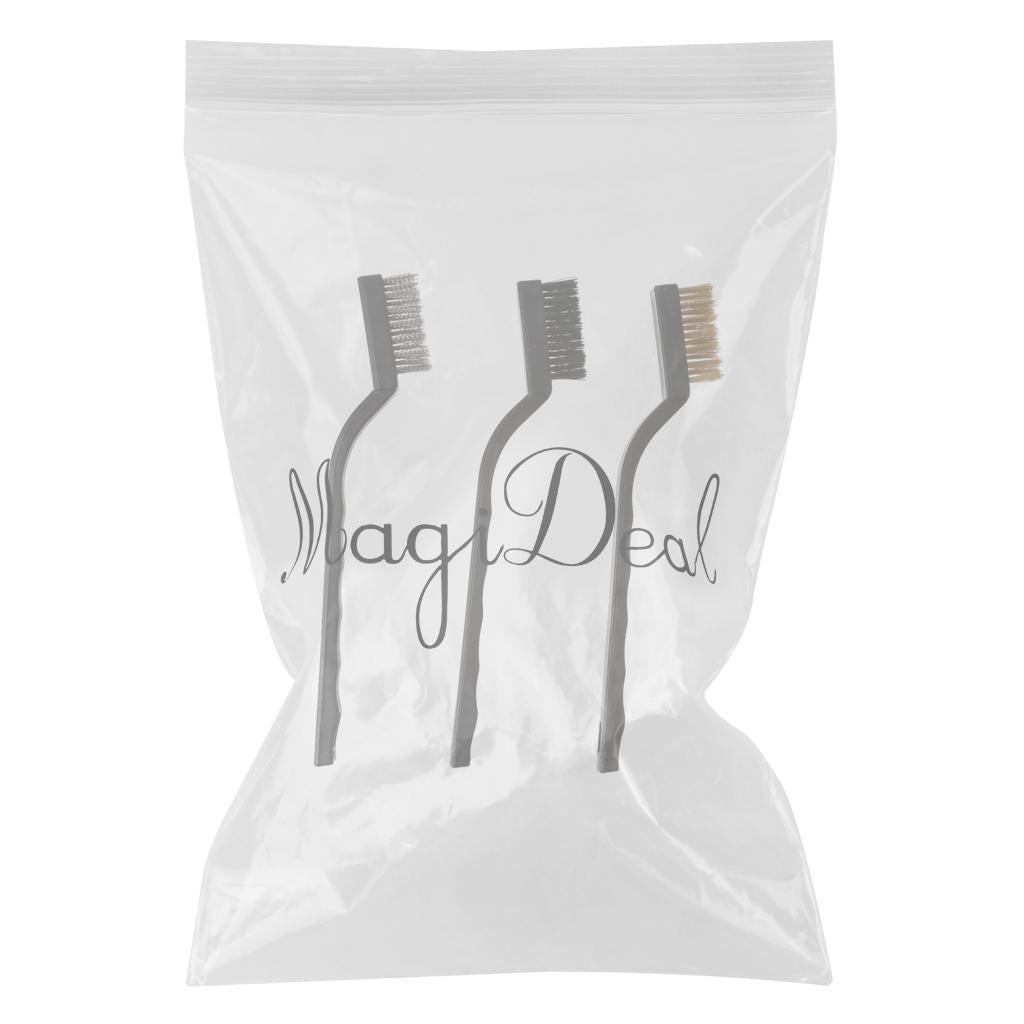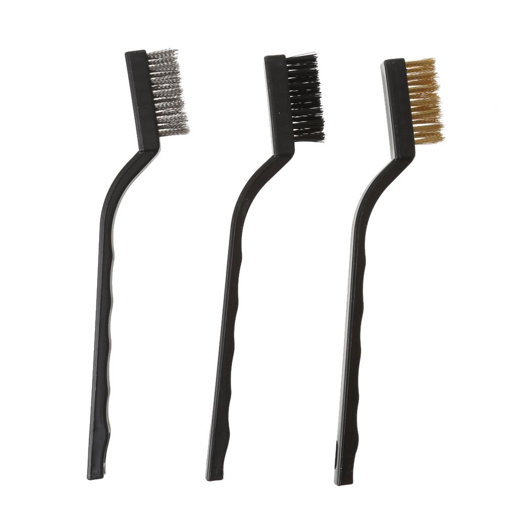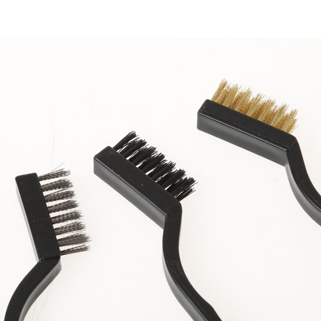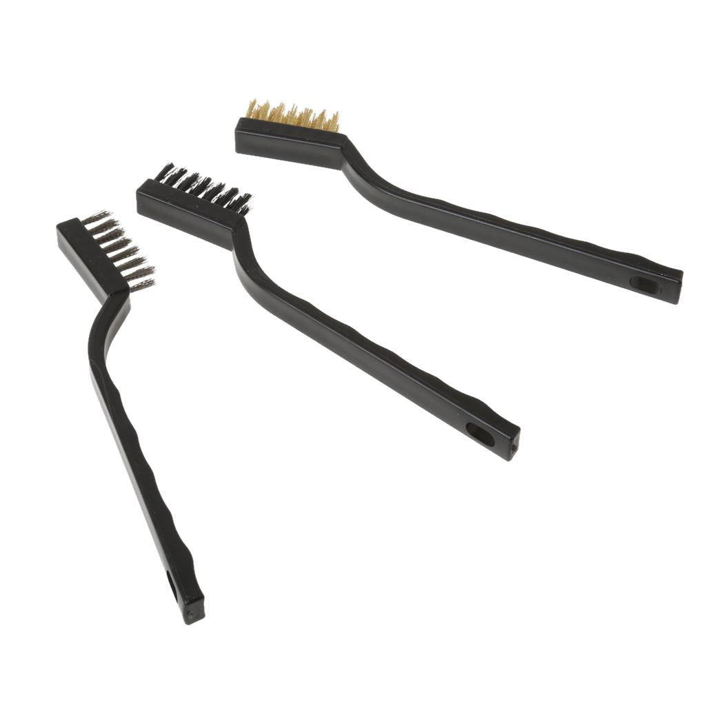 Clean small parts and in tight, hard-to-reach spaces with the toothbrush-sized 3-pcs. Mini Wire Brush Set. Three different bristle materials cover a wide variety of surfaces and applications. Nylon bristles are easy on finished surfaces making them ideal for sweeping away dirt and debris from around interior door panels, trim pieces, dashboards, and crevices where panels meet. Soft brass bristles clean unfinished metal parts like screw threads, connection terminals, and cutting tools without damaging surfaces or fine features. Stiff and aggressive, stainless steel bristles deliver scrubbing power for removing loose paint, scale, and rust from metal parts. Comfortable and easy to hold, the fingergrip polymer handles offer sure control, even with wet hands.