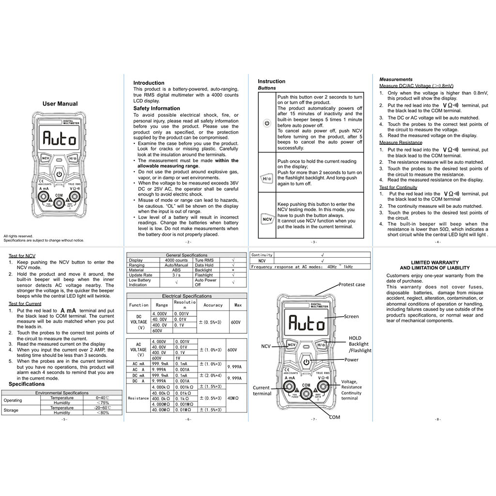 Automatic Digital Multimeter intelligent NCV 4000 Counts AC/DC Voltage Ammeter Current Ohm Auto/Manual