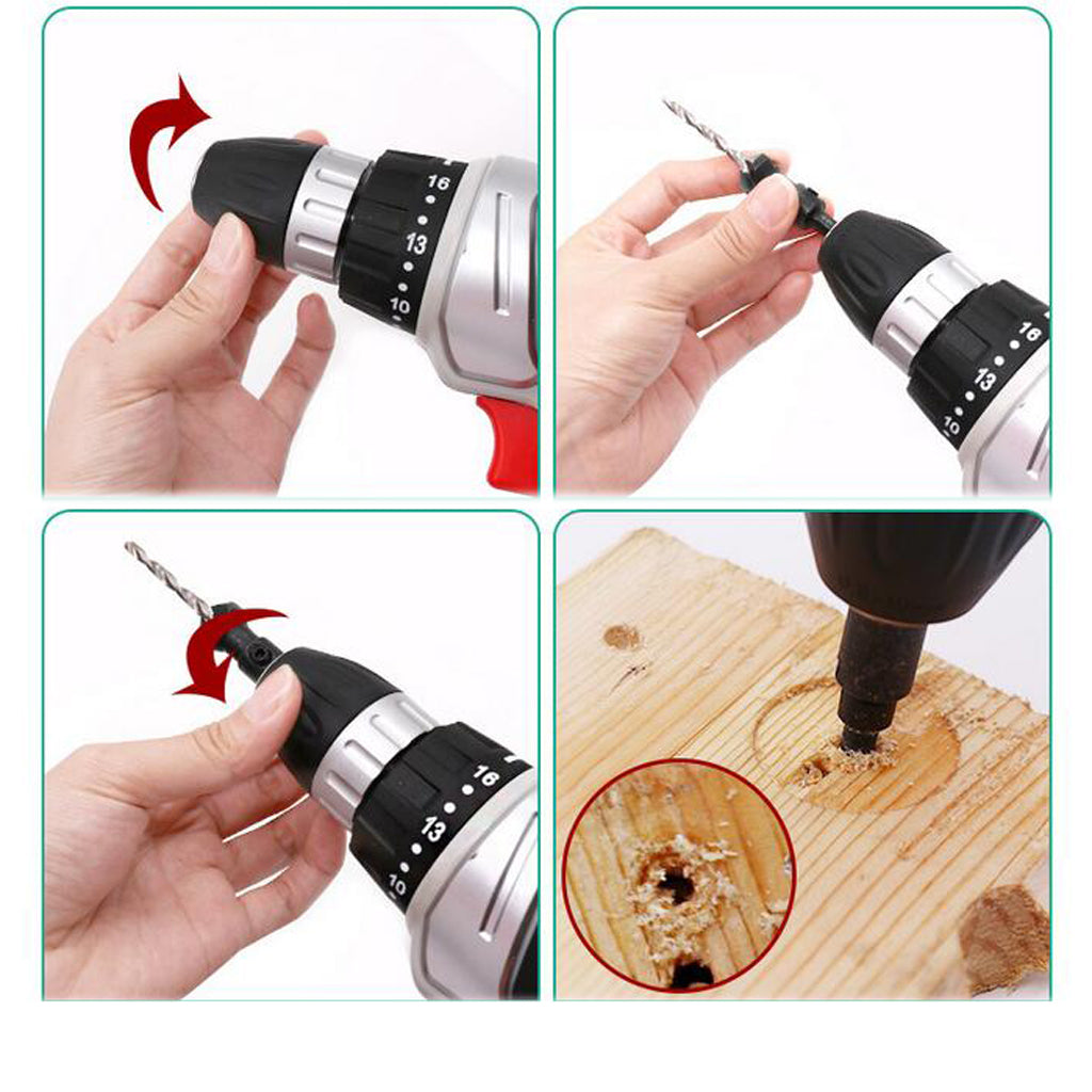 Adjustable Countersink Drill Bit length for various length screws simply by loosening and tightening the screw.
