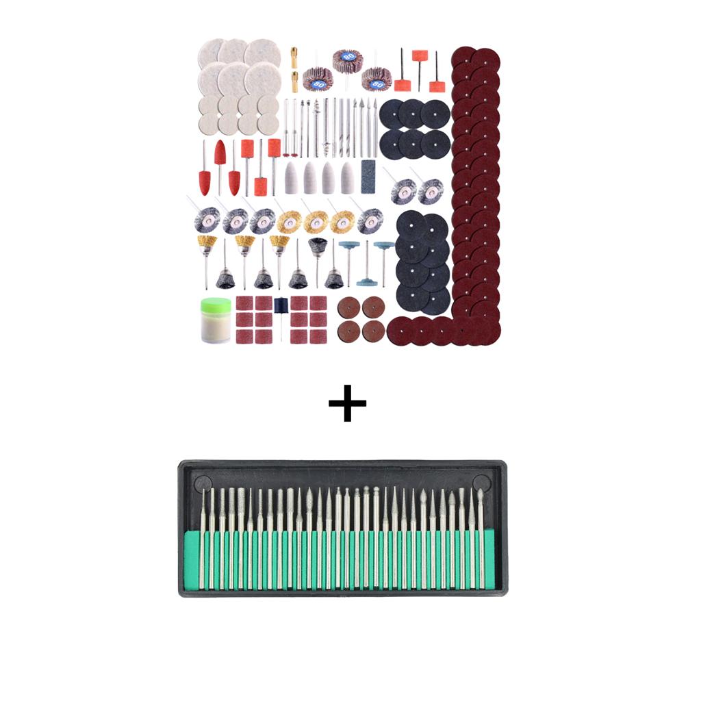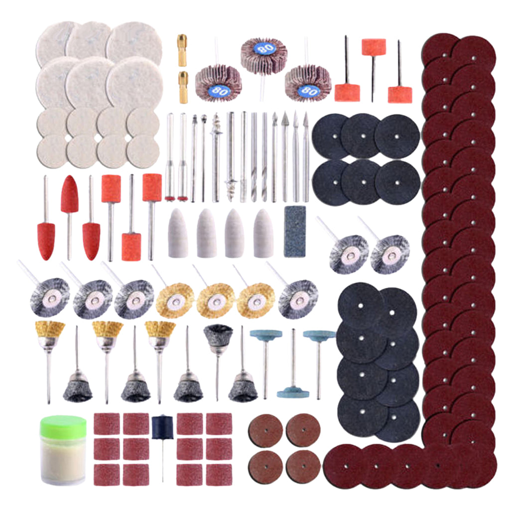 Accessories kit include: sanding discs, grinding stone, cutting discs, sanding drums, mandrel, polishing wheels, steel/brass cup, colletts, abrasive wheel, etc.