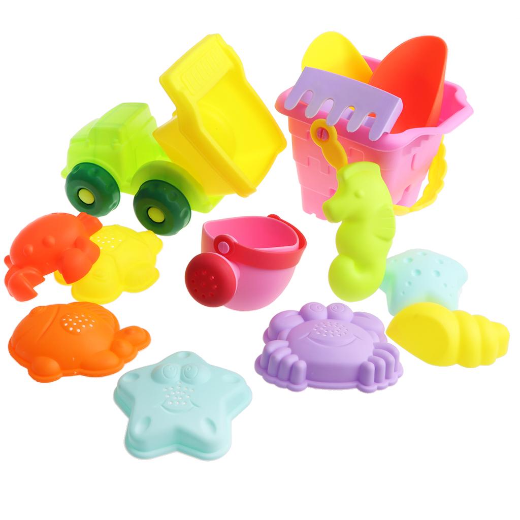 Includes 1x truck, 1x bucket, 2x sand shovel, 1x sand rake, 1x watering can, 8x sea animal shape molds (Crab, Turtle, Fish, Sea Horse, Conch and Starfish)