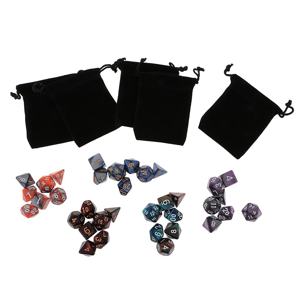 35 polyhedral dices in 5 complete sets, Each 7-die set contains one D20, one D12, two D10 (00-90 and 0-9), one D8, one D6, and one D4.
