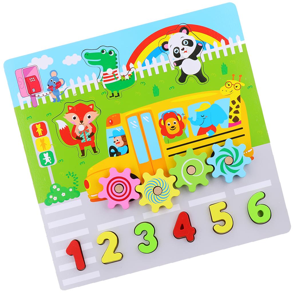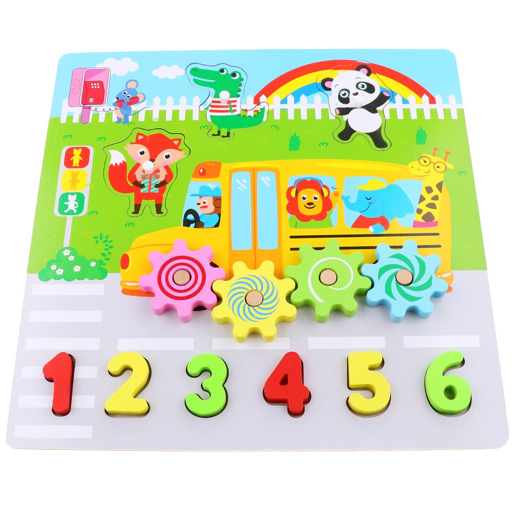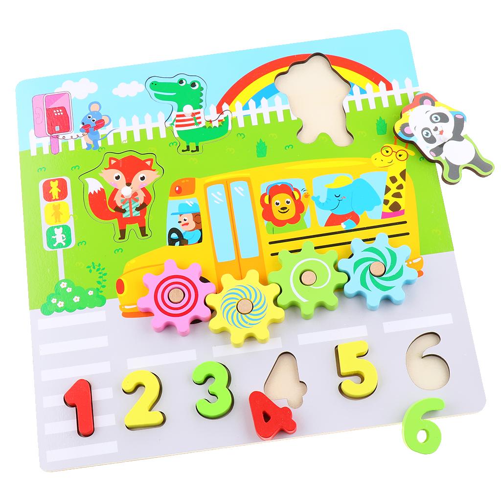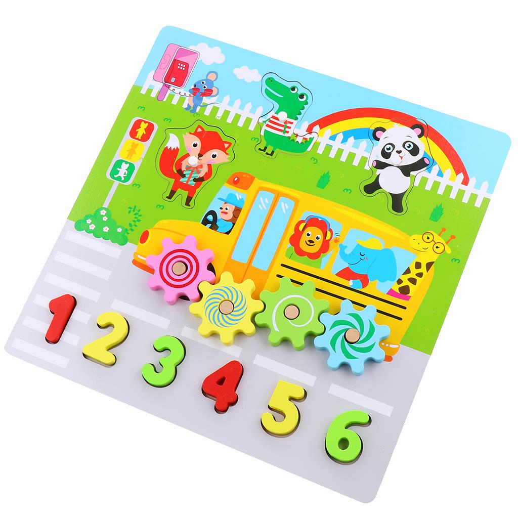 Wooden puzzles toy, grab board, including animal gear and number shape, for kids and kindergarteners.
