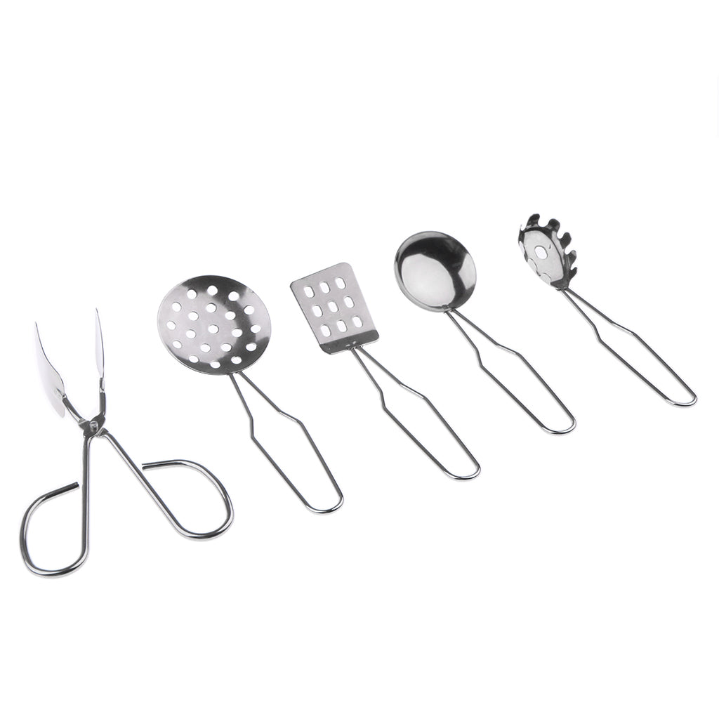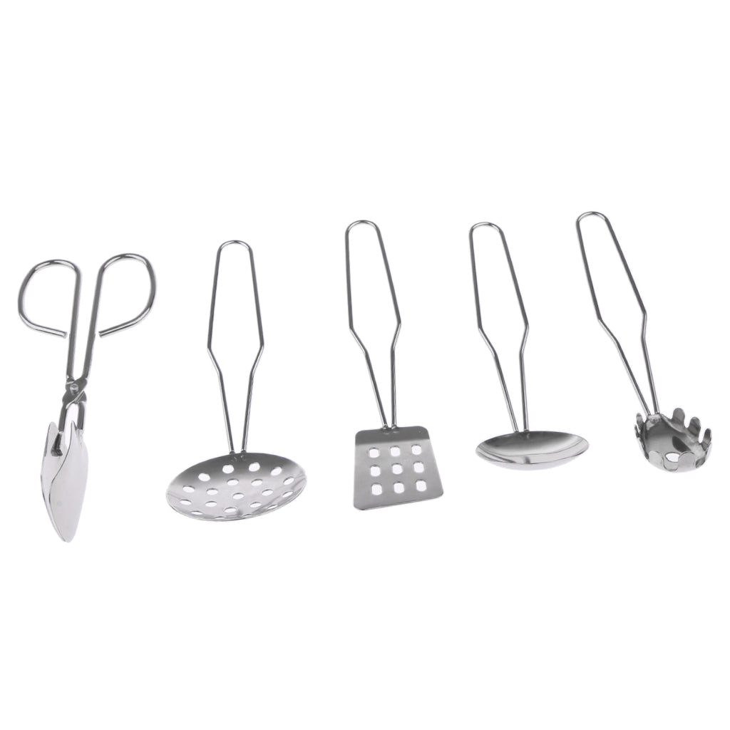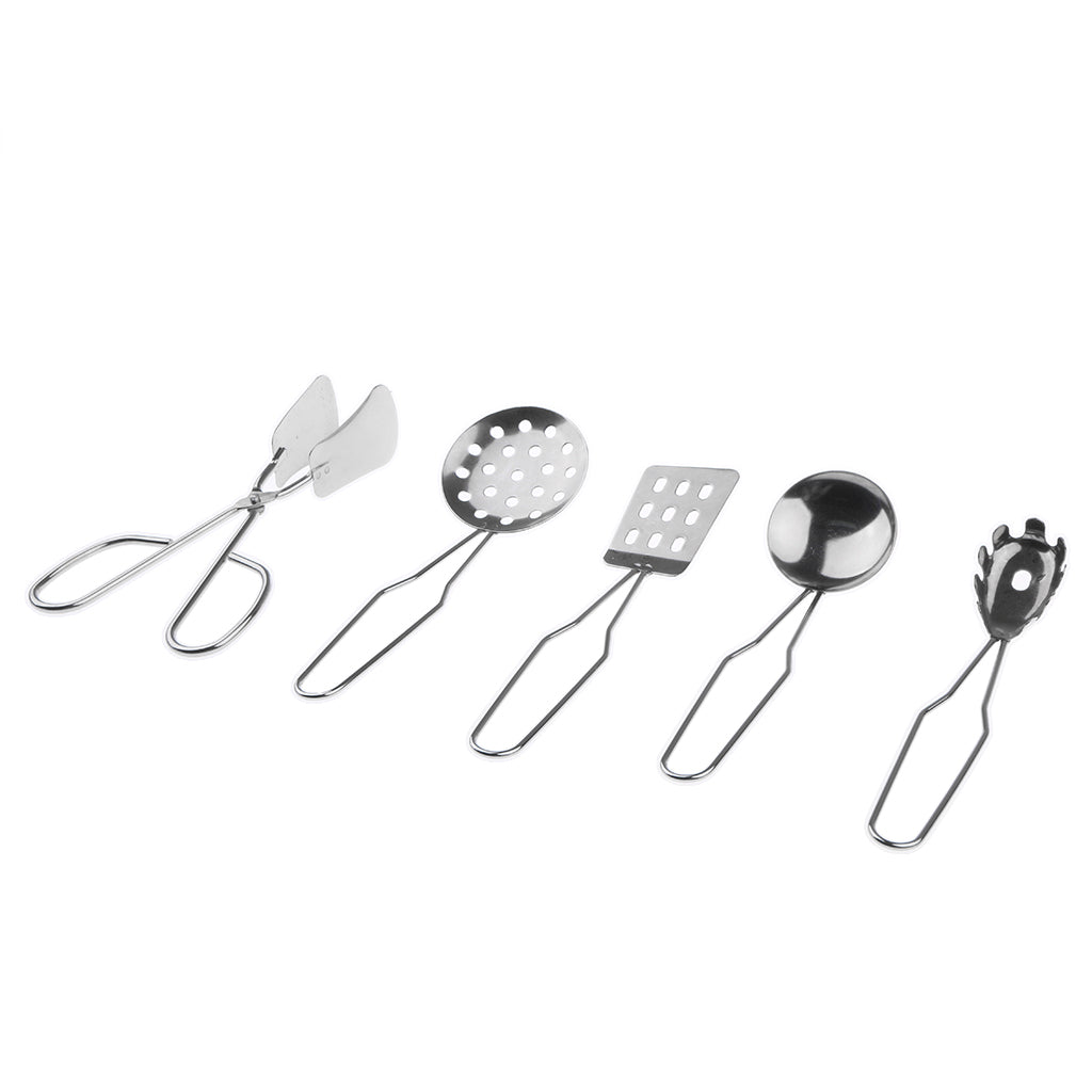 Kids Stainless Steel Kitchen Cooking Utensils Toy Pretend Play Toy - F (Pack of 5, includes ladle, spatula, slotted spoon, spaghetti server, serving tongs)