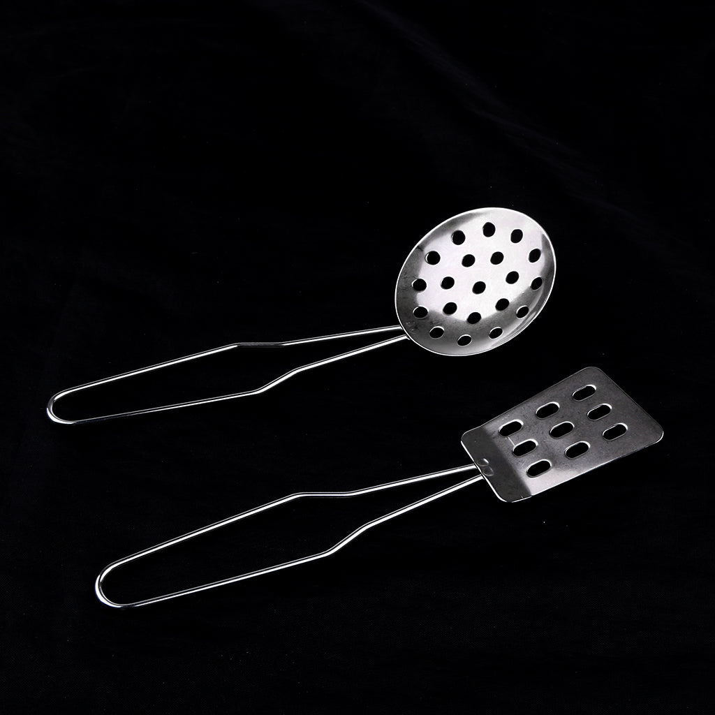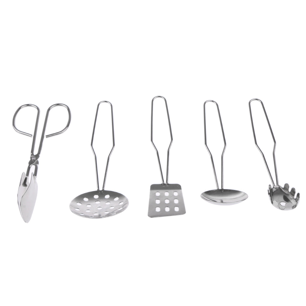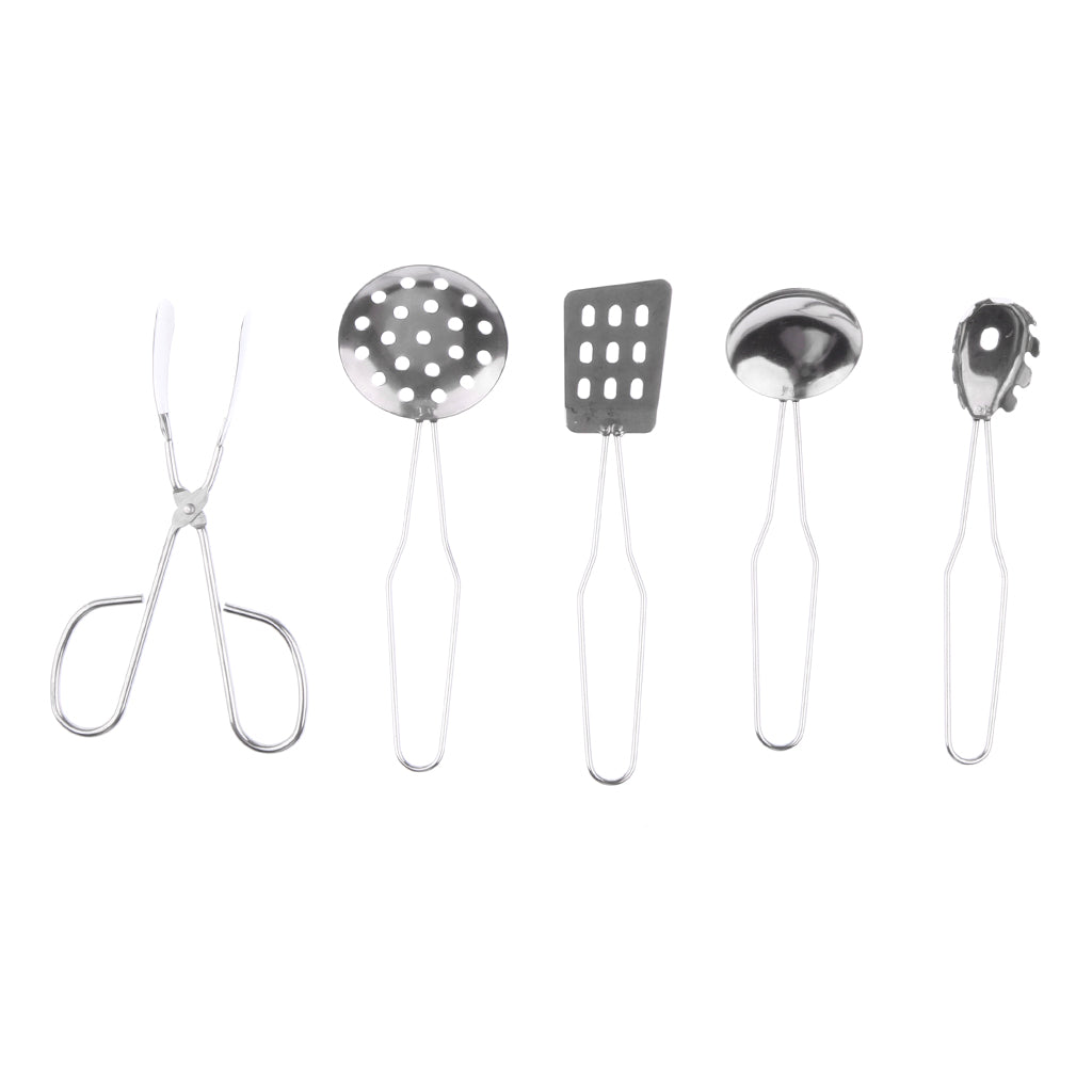 Kids Stainless Steel Kitchen Cooking Utensils Toy Pretend Play Toy - F (Pack of 5, includes ladle, spatula, slotted spoon, spaghetti server, serving tongs)