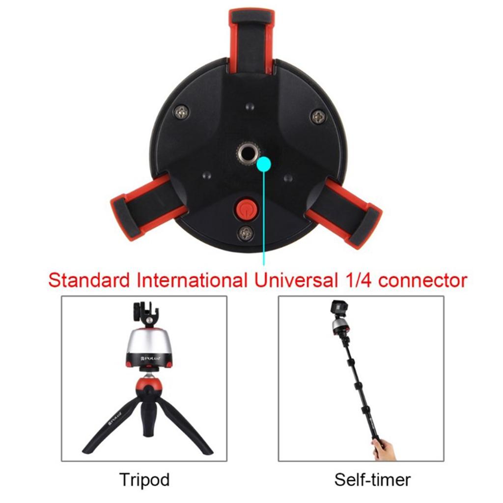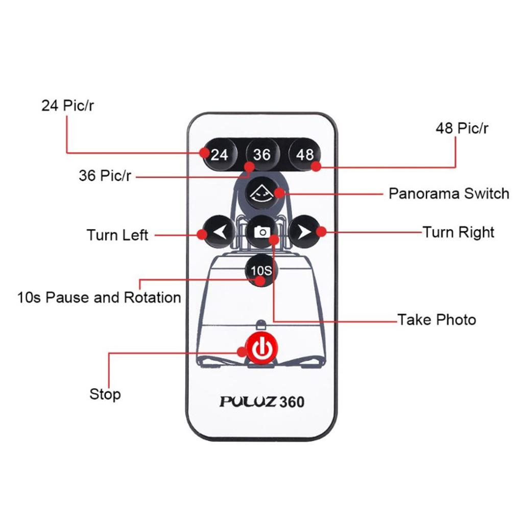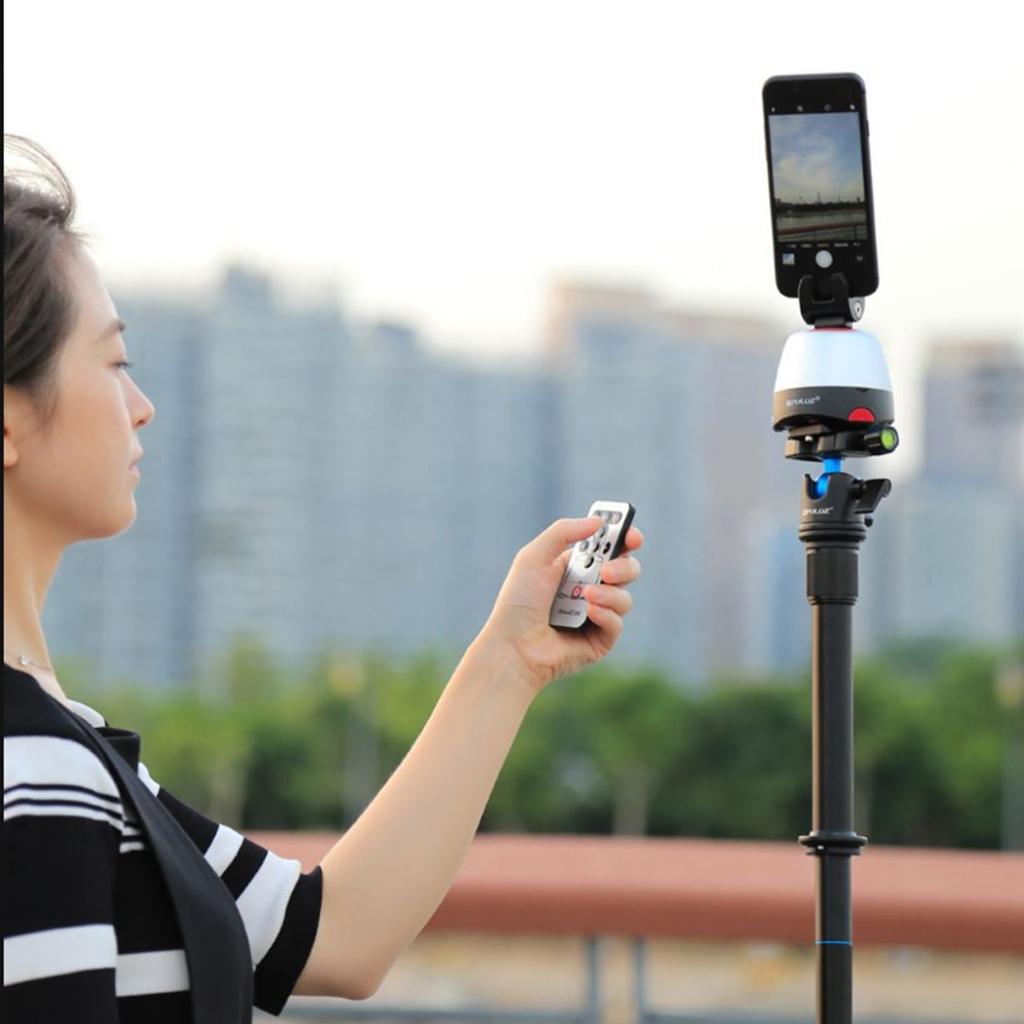Panning action is controlled by the supplied infrared controller instead of the smart phone. The base only has power on/off switch. The remote control can be paired to your smartphone, given that the smartphone system is above Android 3.0 or iOS 4.0. Take a picture press the photo capture button on the remote control to trigger the smartphone.