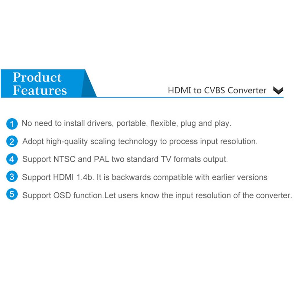 Convert high quality of HDMI video signal to normal CVBS(AV) signal (standard-definition 480i, ).Enables you to play on TV, VHS VCR, DVD recorders, etc.