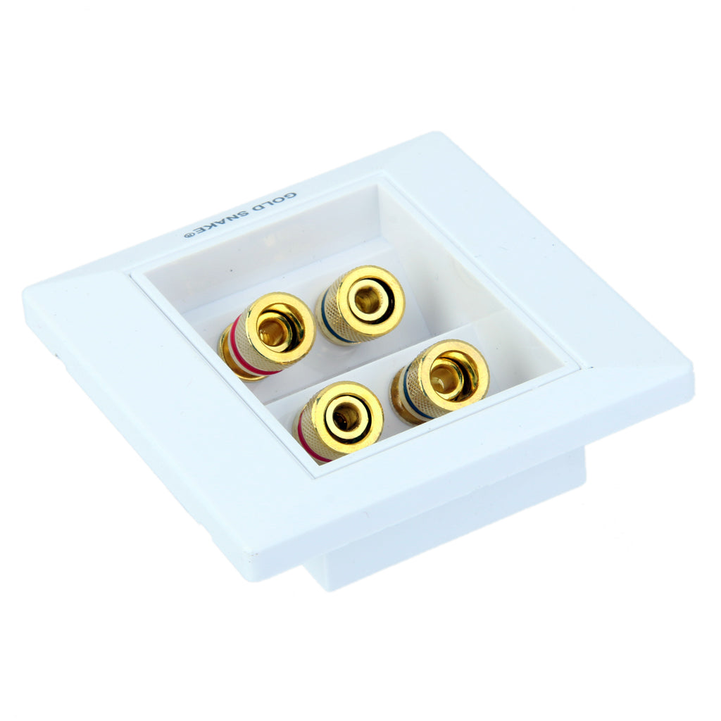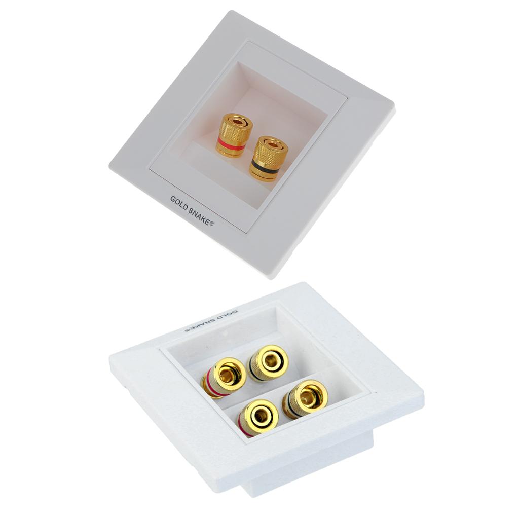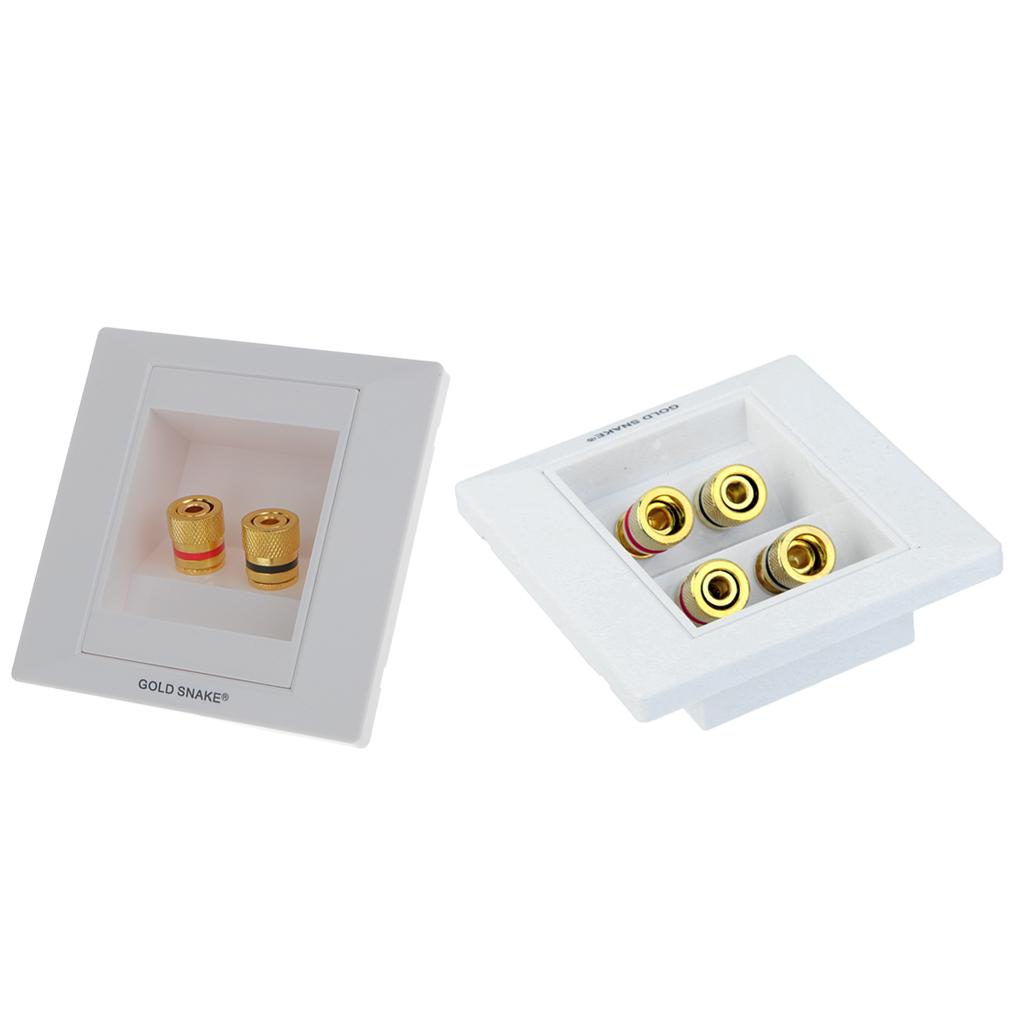 Speaker cable can be inserted through walls and easily connected to these face plates. The face plate has 2 protruding gold plated solder tags (with holes) on the back. The speaker cable can be connected by inserting through the holes on the solder tags and twisting to achieve a tight connection. The best connection is achieved by soldering the speaker cable to the solder tags.