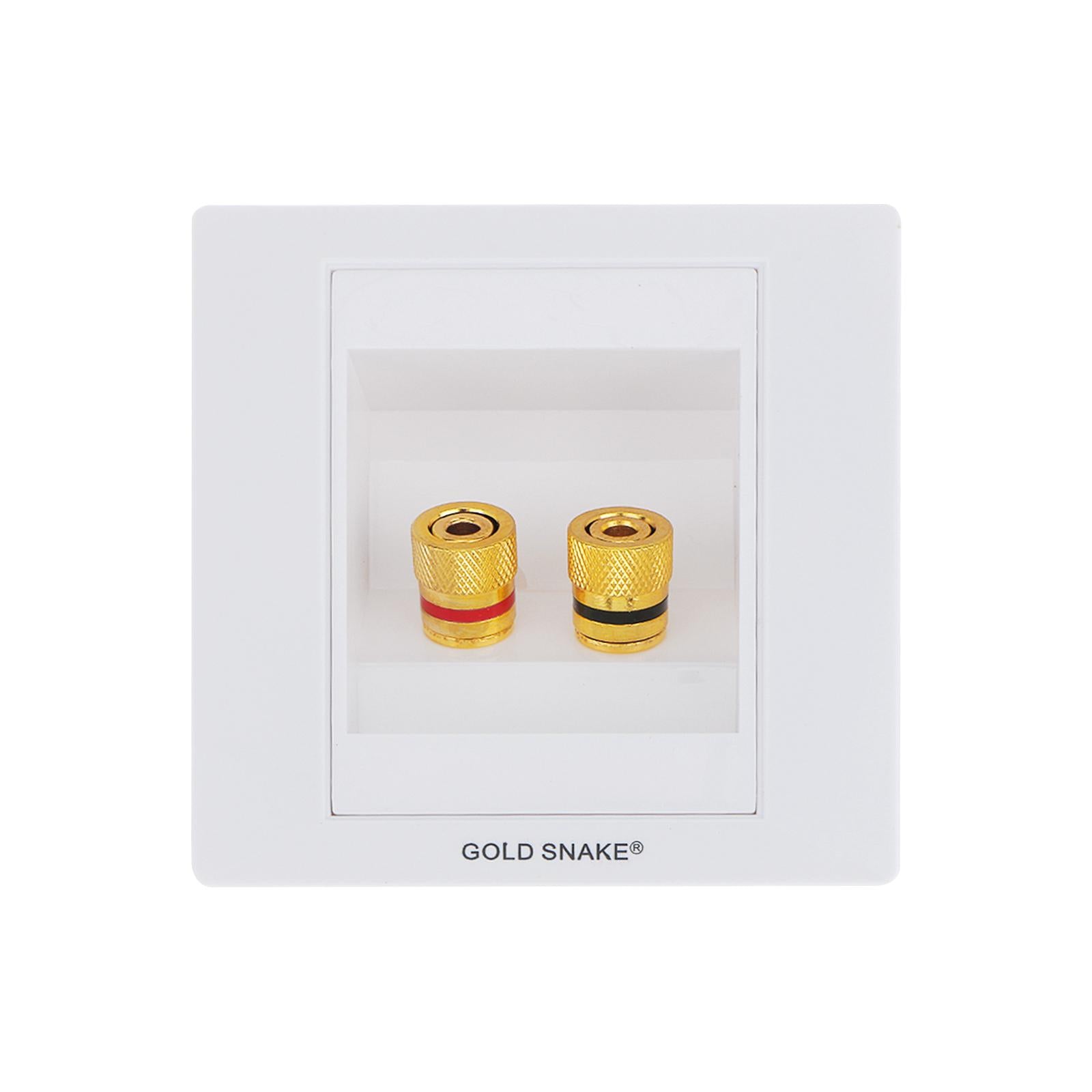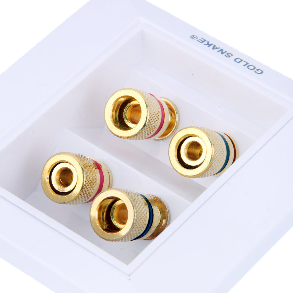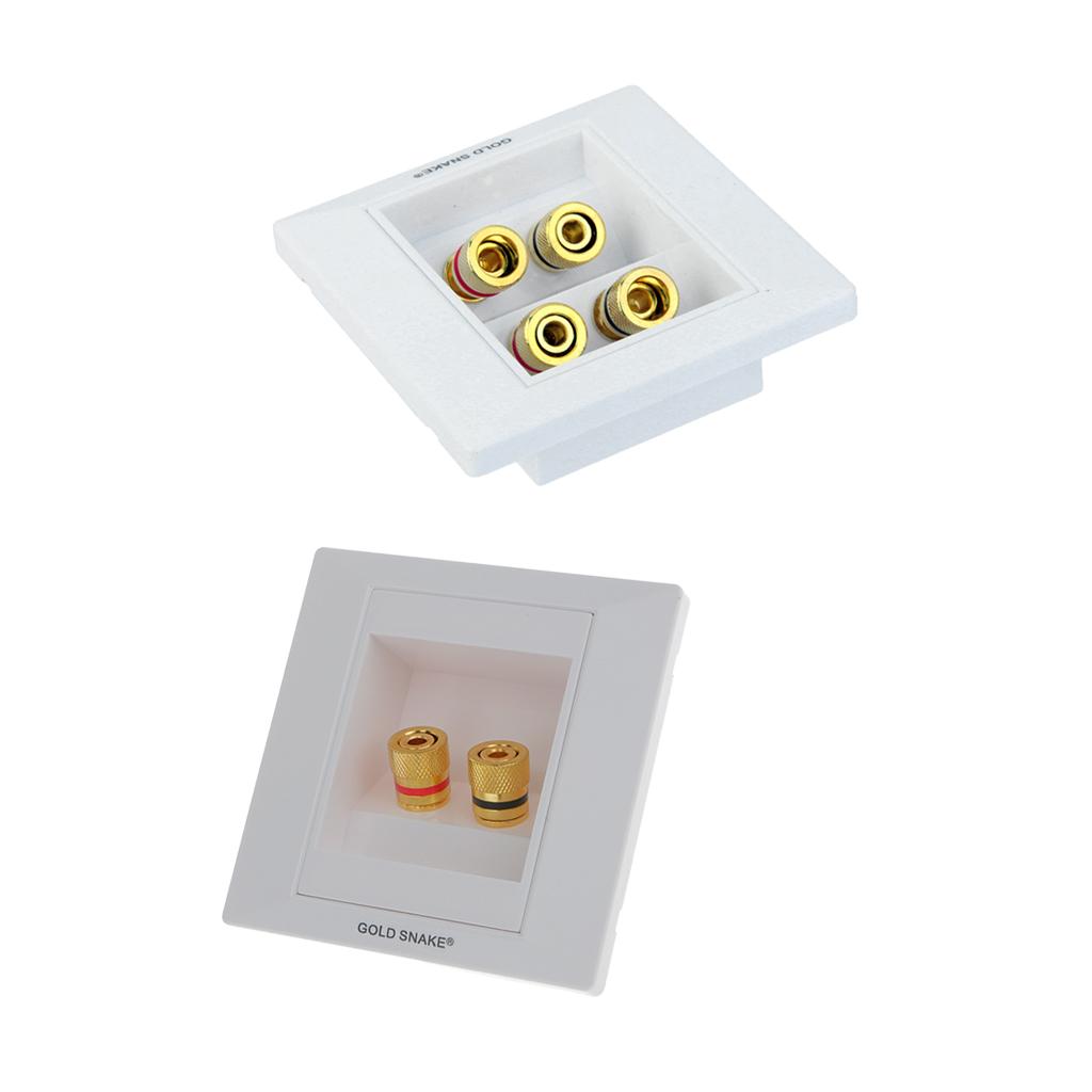 Speaker cable can be inserted through walls and easily connected to these face plates. The face plate has 2 protruding gold plated solder tags (with holes) on the back. The speaker cable can be connected by inserting through the holes on the solder tags and twisting to achieve a tight connection. The best connection is achieved by soldering the speaker cable to the solder tags.