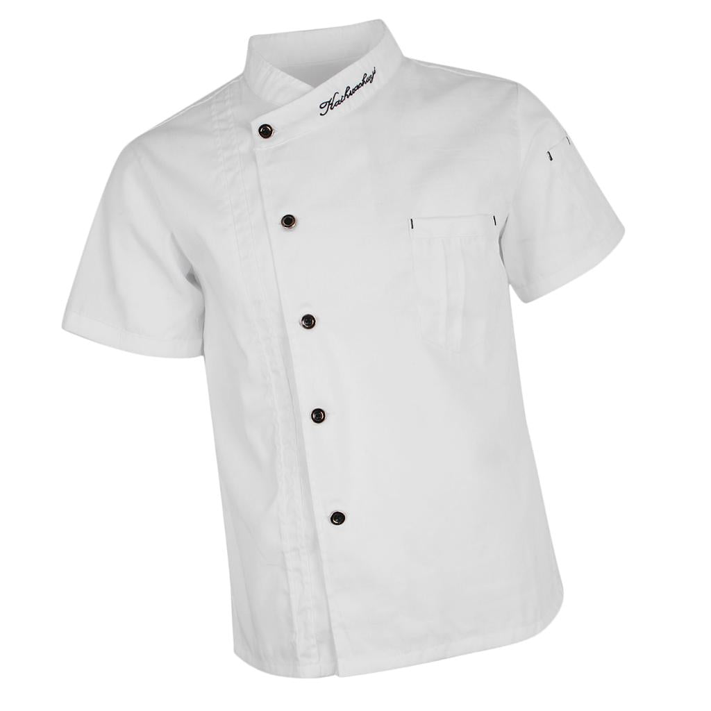 Solid color, single-breasted and short sleeves chef shirt, having left shoulder pockets and left breast pockets, mandarin collar with delicate alphabets embroidery