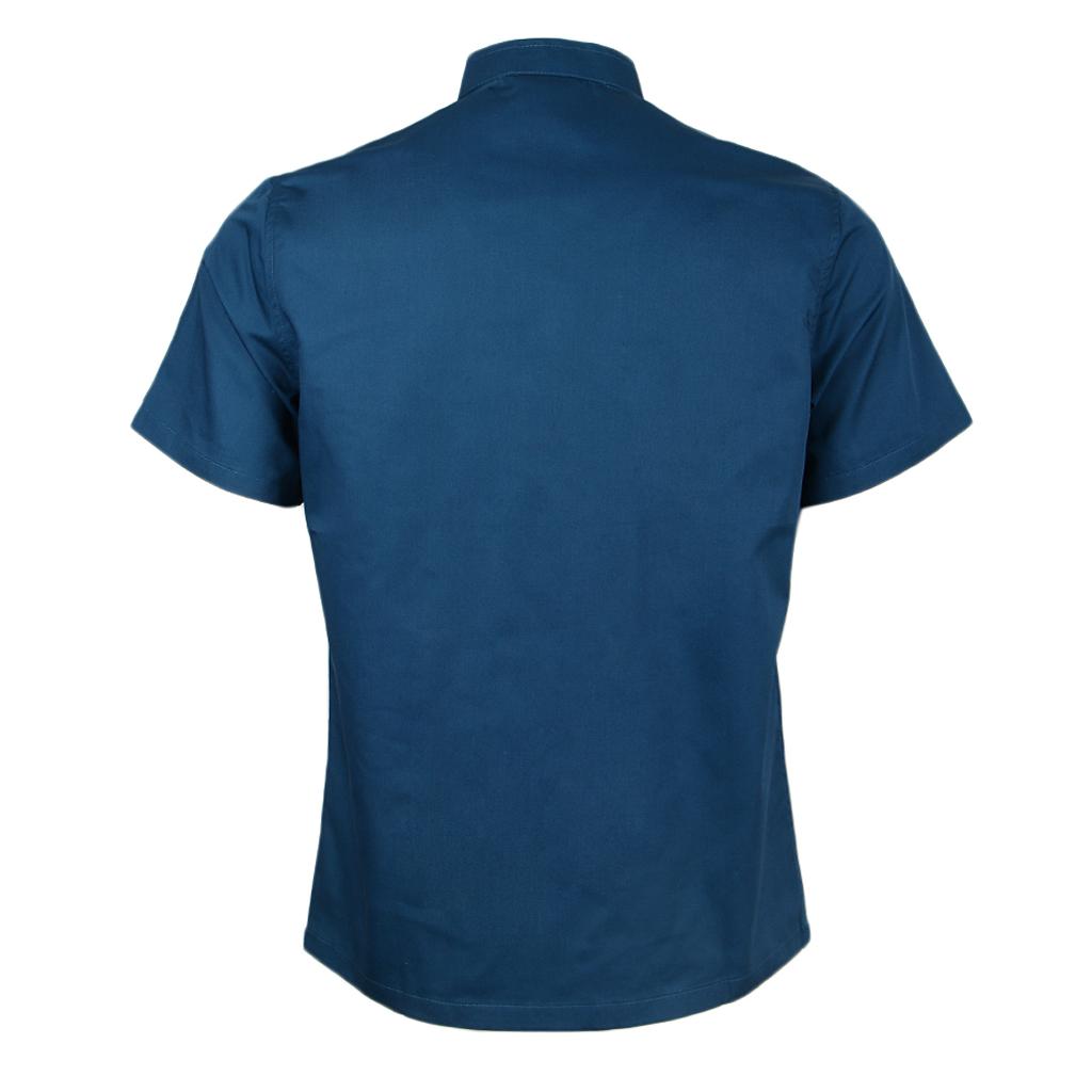 Solid color, double-breasted and short sleeves chef shirt, having left shoulder pockets and left breast pockets, mandarin collar with colorful striped hem