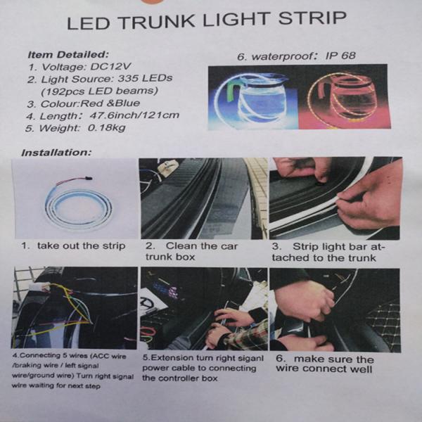1.take out the strip,Clean the car trunk box,Strip light bar attached to the trunk.