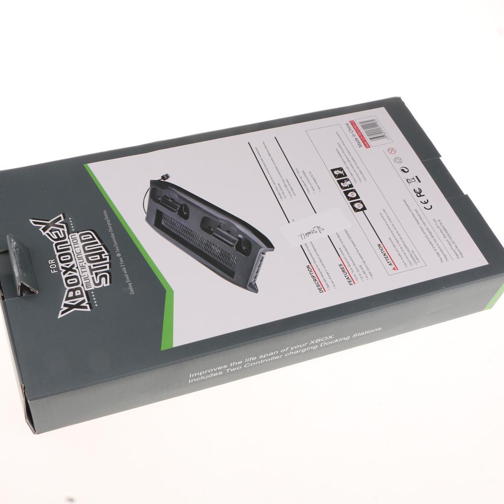 ALL-IN-ONE: Vertical Stand for Xbox One X + Dual Controller Charger + Two Cooling Fans + 4 Extra USB Port