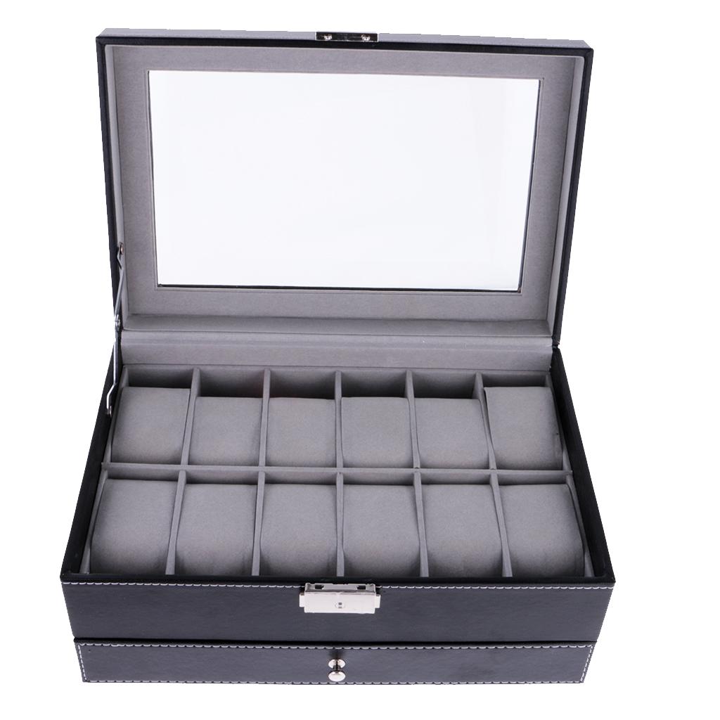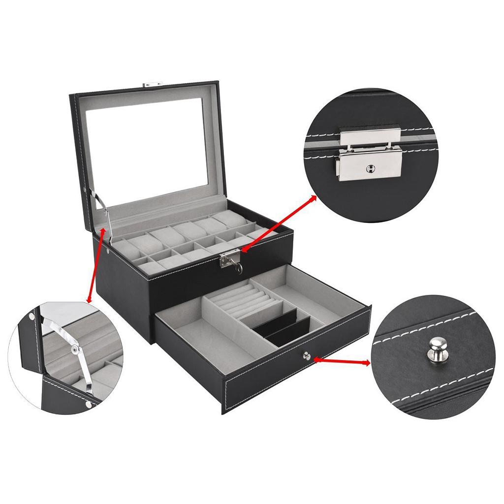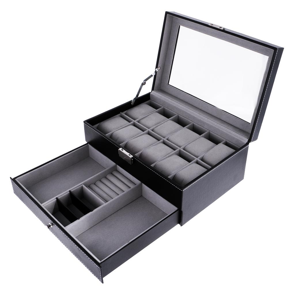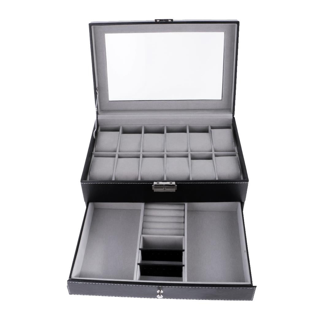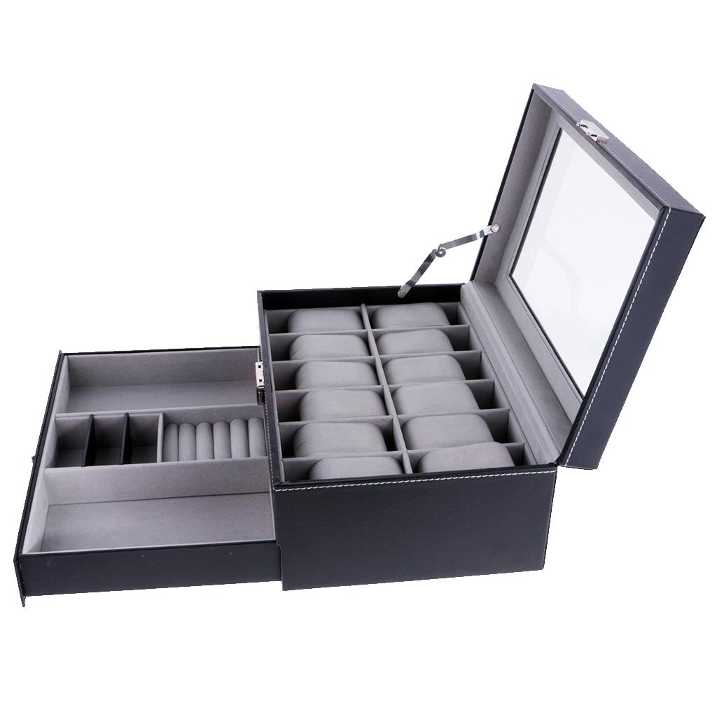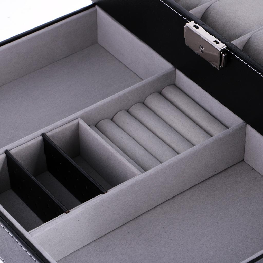 12 watch slots with removable velvet pillows, 1 ring case, 2 stud earring cards, 5 more compartments for necklaces, bracelets, cufflinks, earrings, brooches and other jewelry