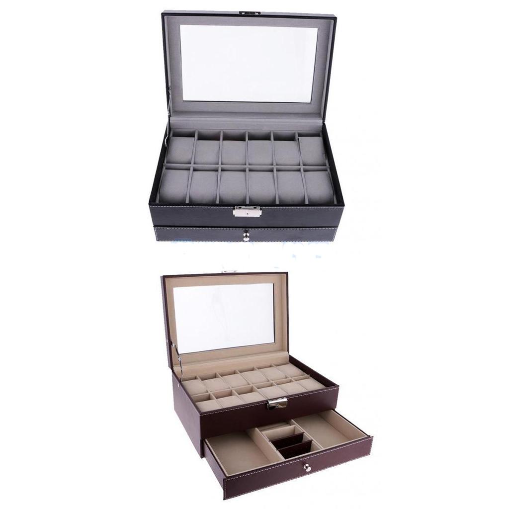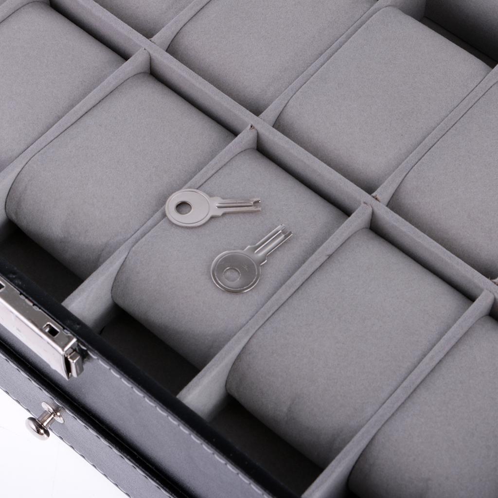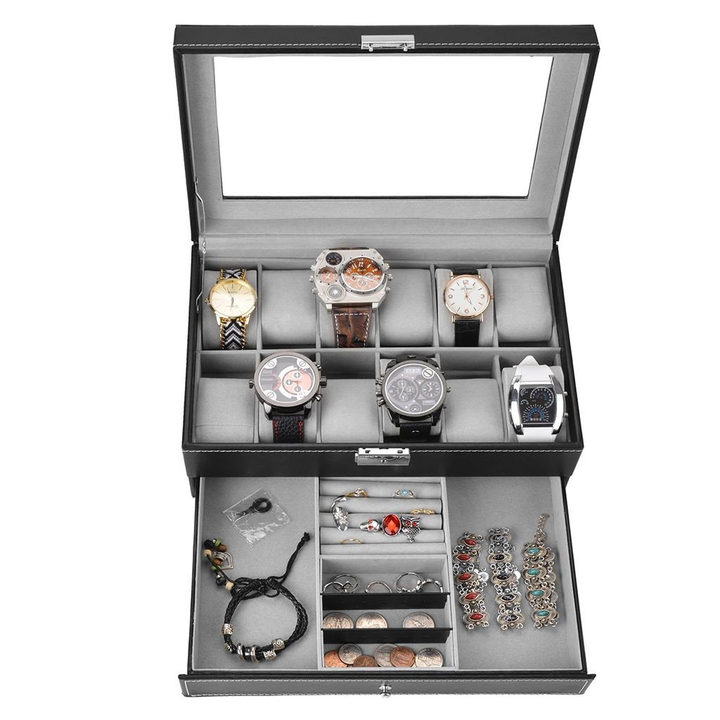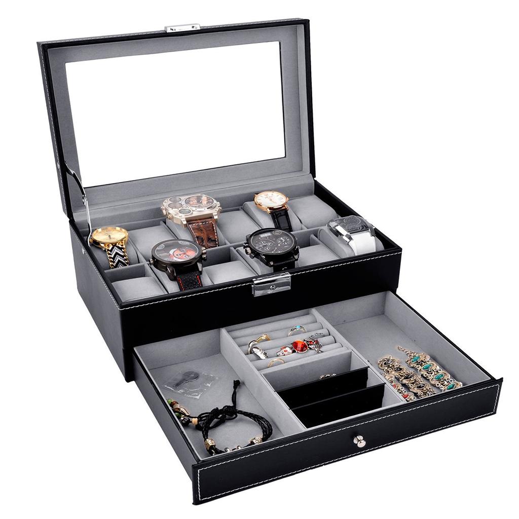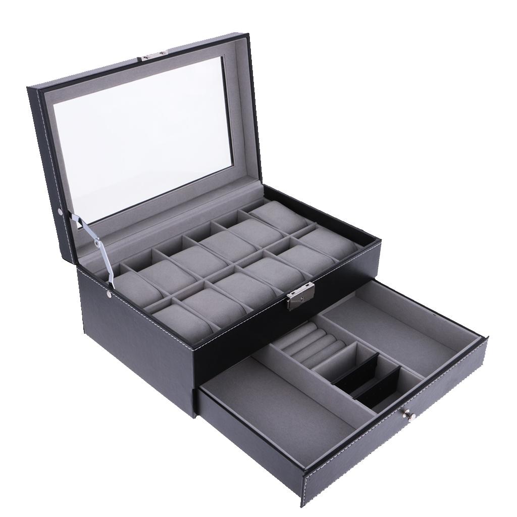 12 watch slots with removable velvet pillows, 1 ring case, 2 stud earring cards, 5 more compartments for necklaces, bracelets, cufflinks, earrings, brooches and other jewelry