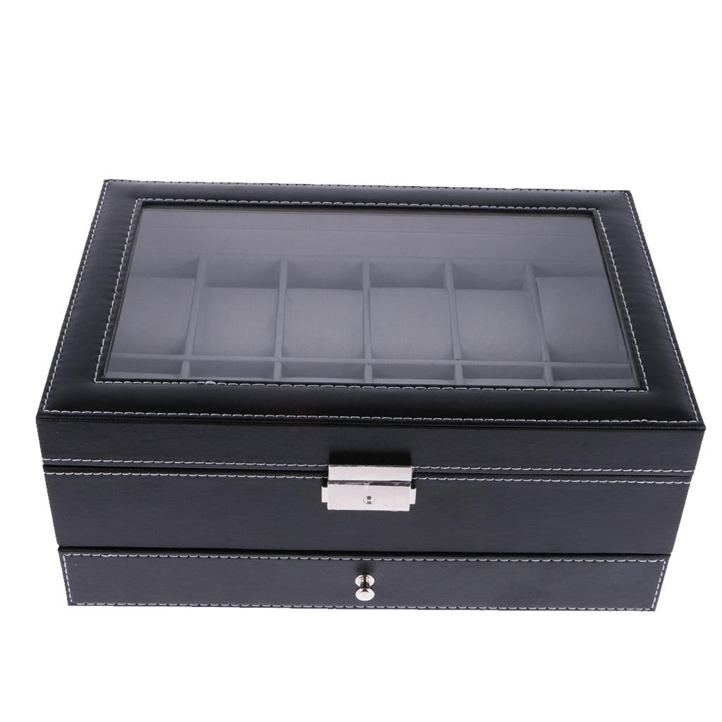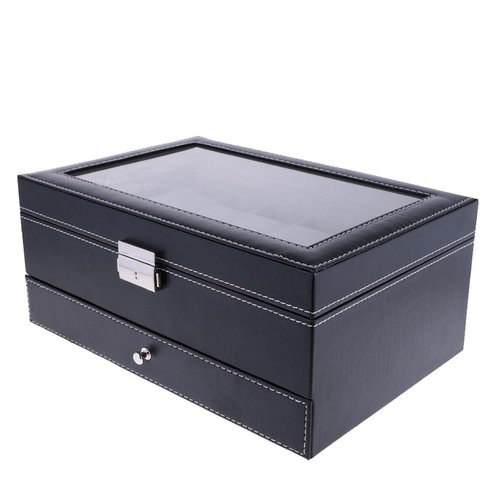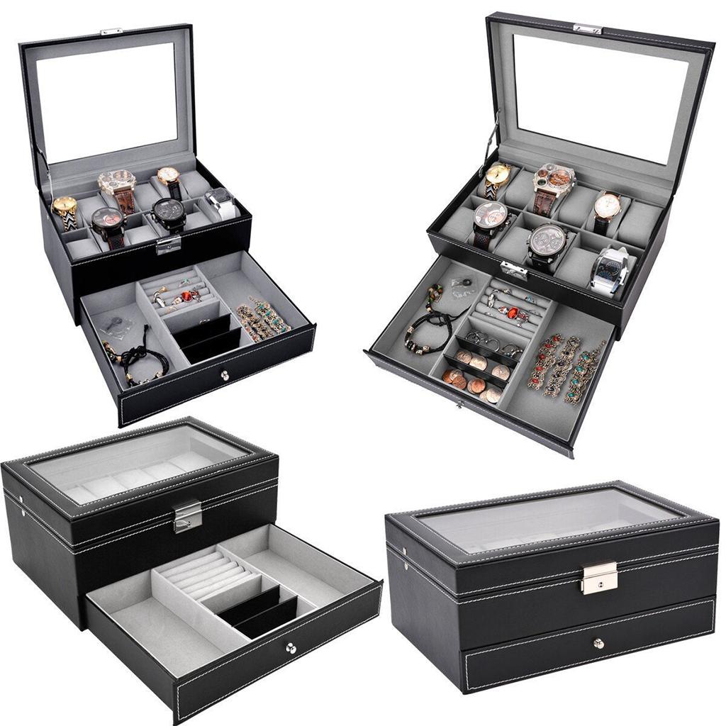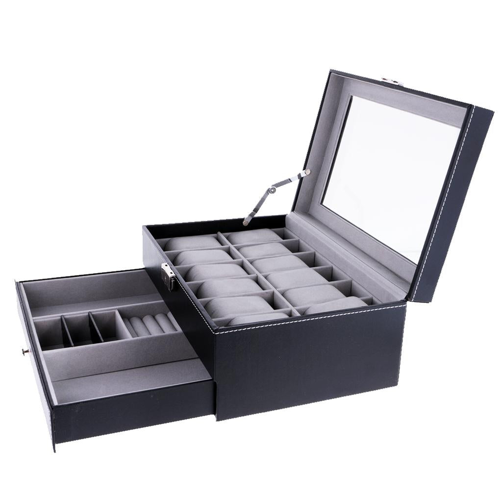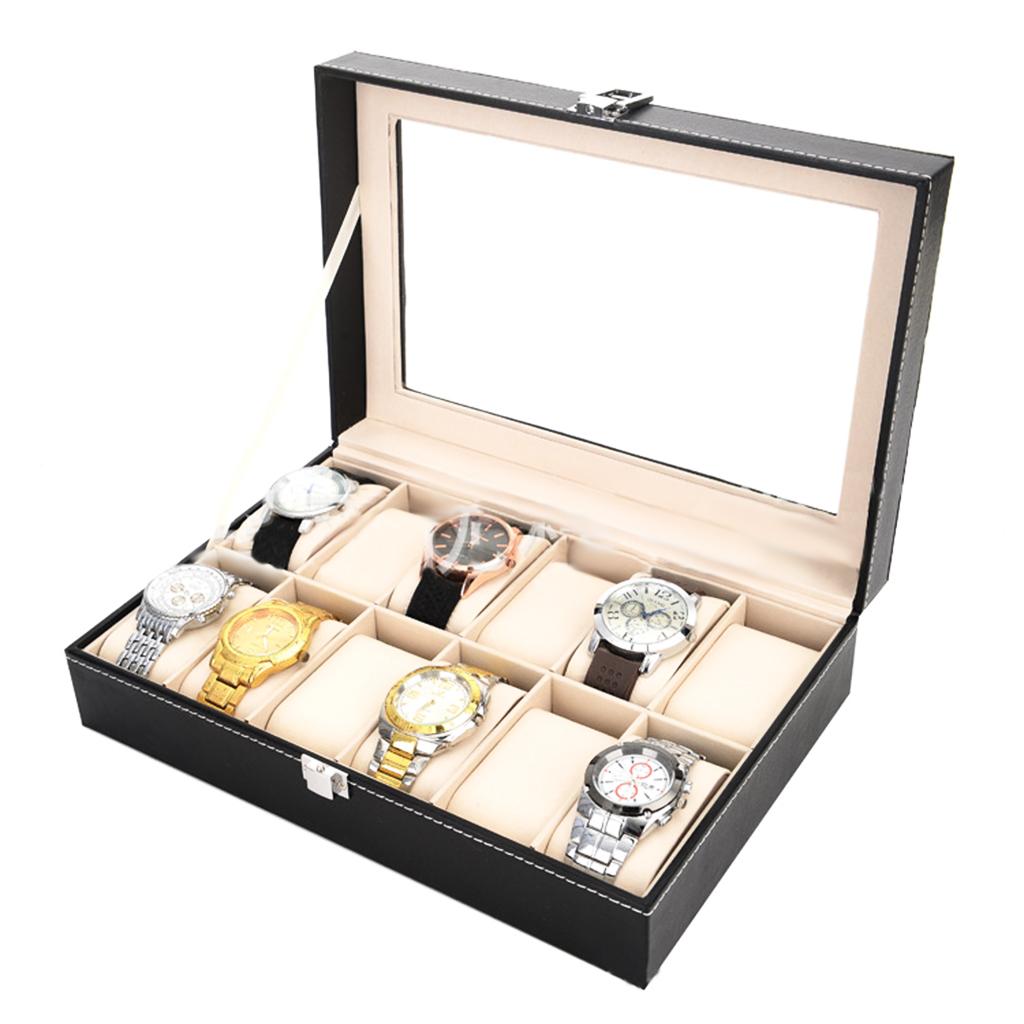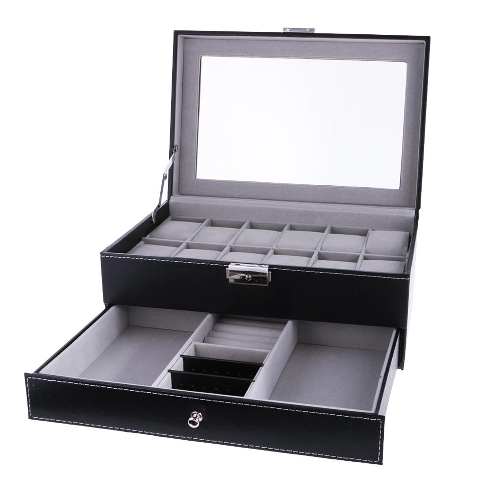 12 watch slots with removable velvet pillows, 1 ring case, 2 stud earring cards, 5 more compartments for necklaces, bracelets, cufflinks, earrings, brooches and other jewelry