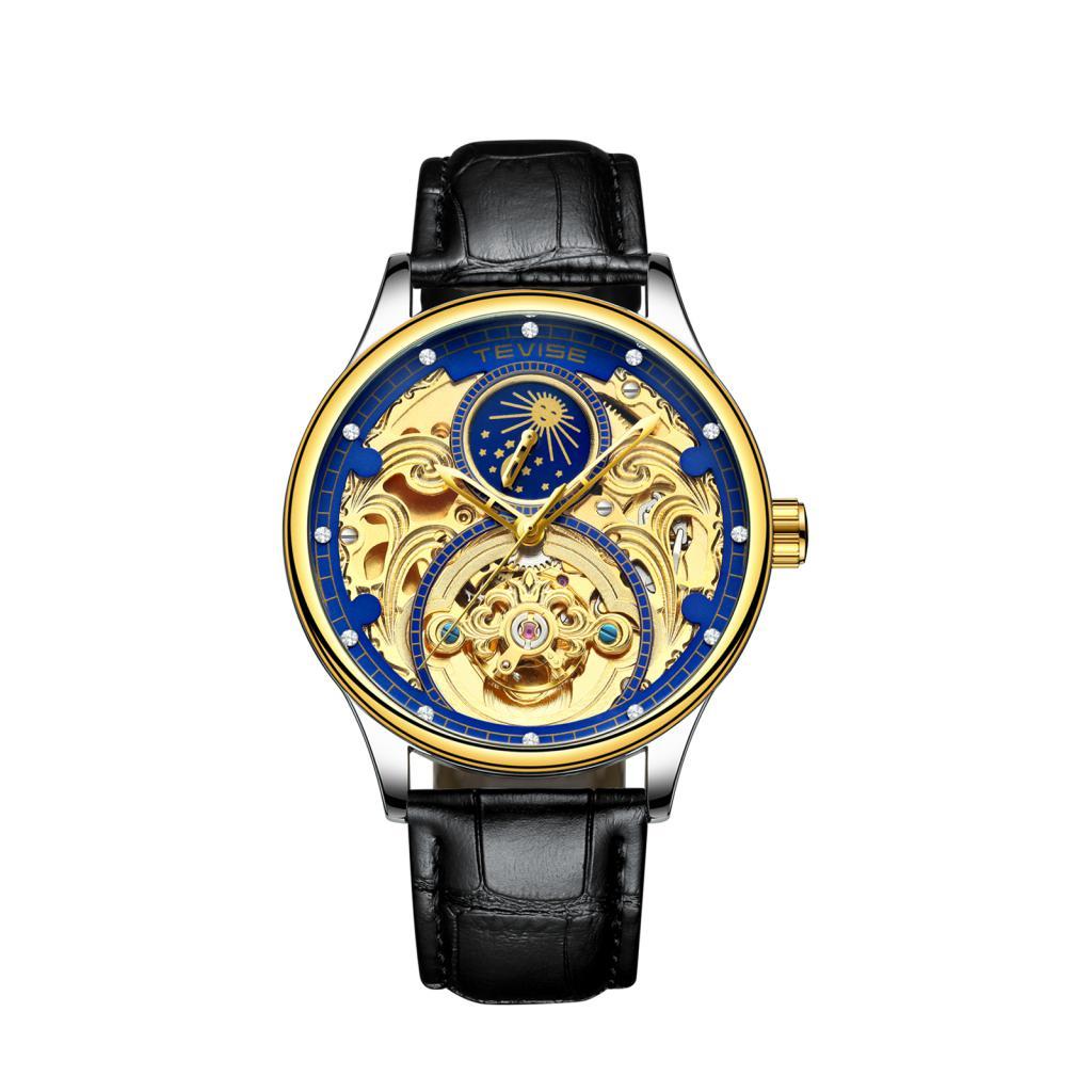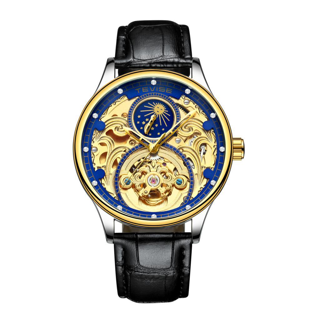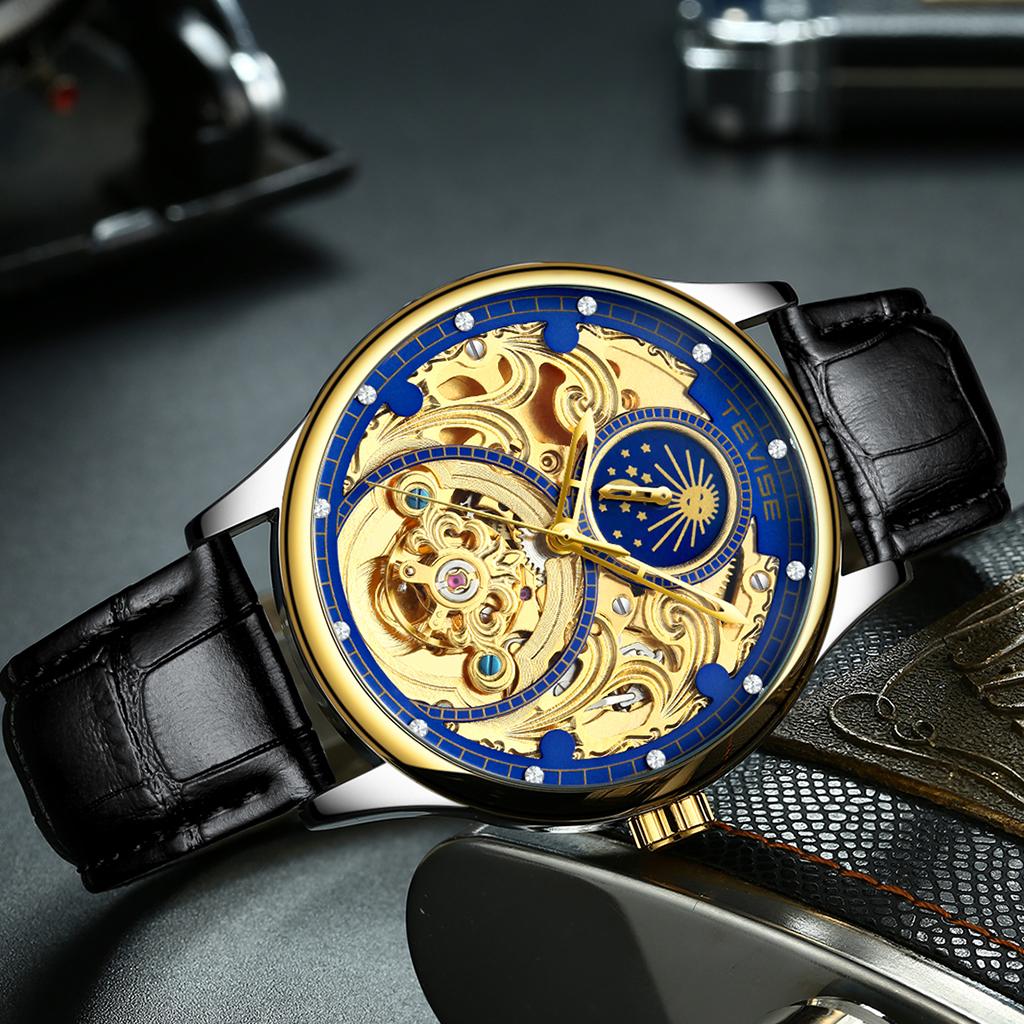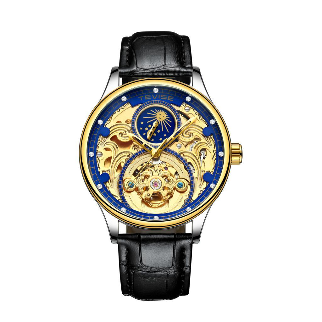 Tevise Skeleton Mechanical Automatic Moon Phase Crystal Watch Gold Blue