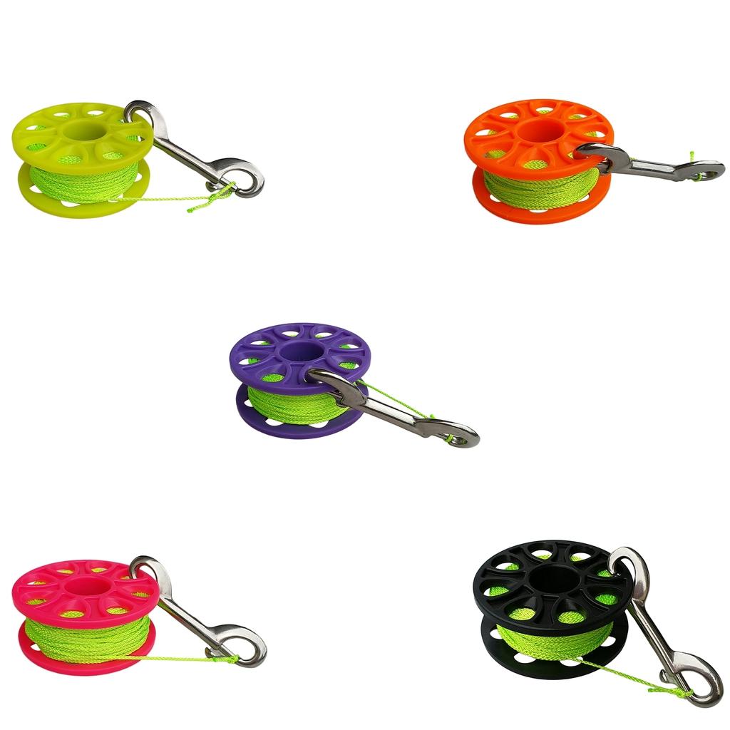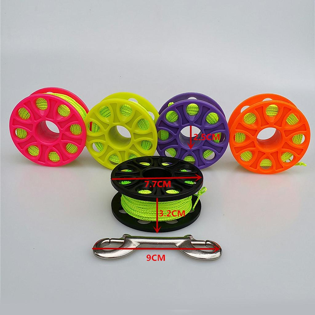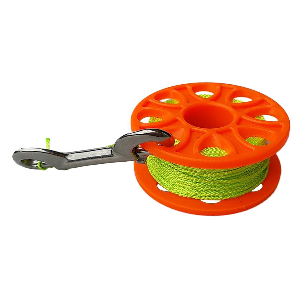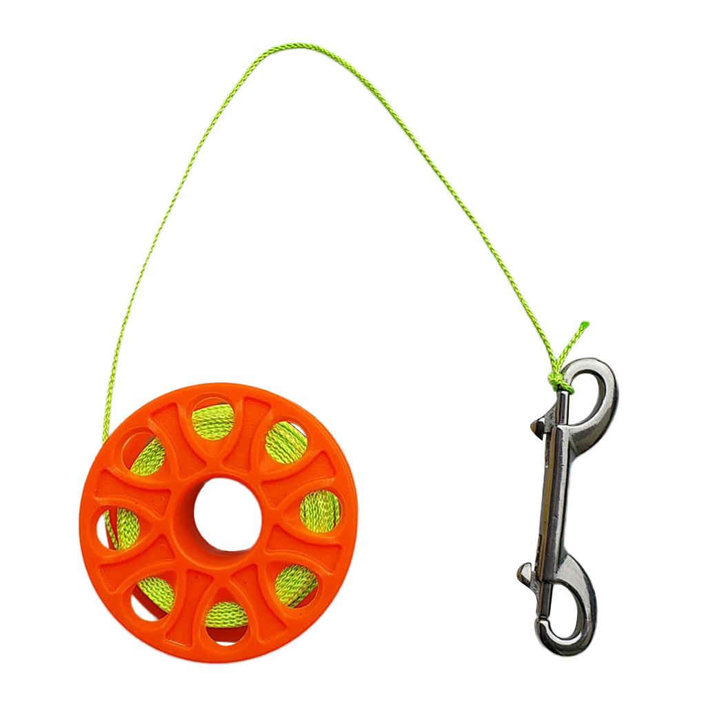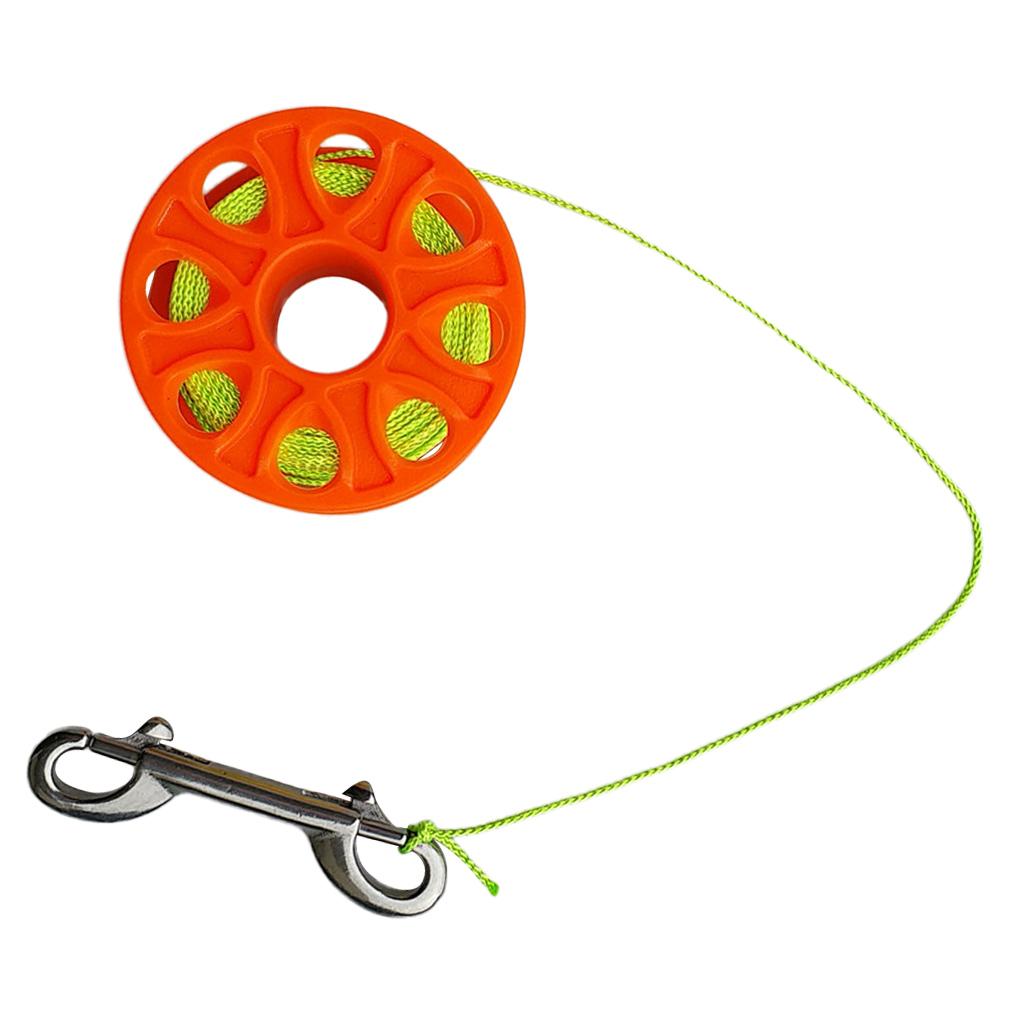 Scuba diving plastic compact finger spool reel with 15m high visibility wear-resistant line.