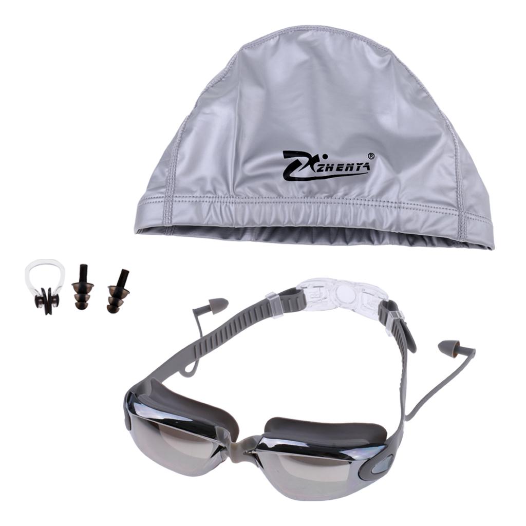 Anti Fog Swimming Goggles with Case + Swim Cap + Nose Clip + Ear Plugs Grey