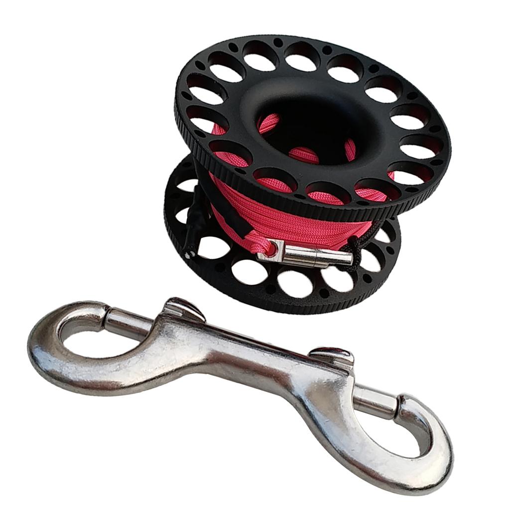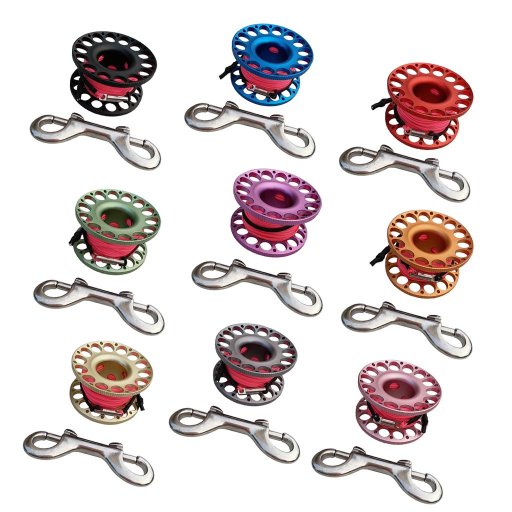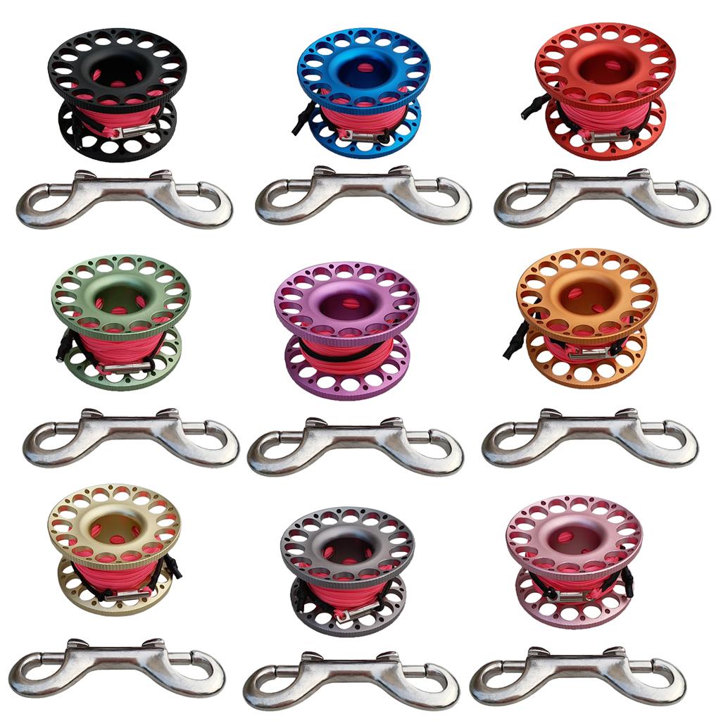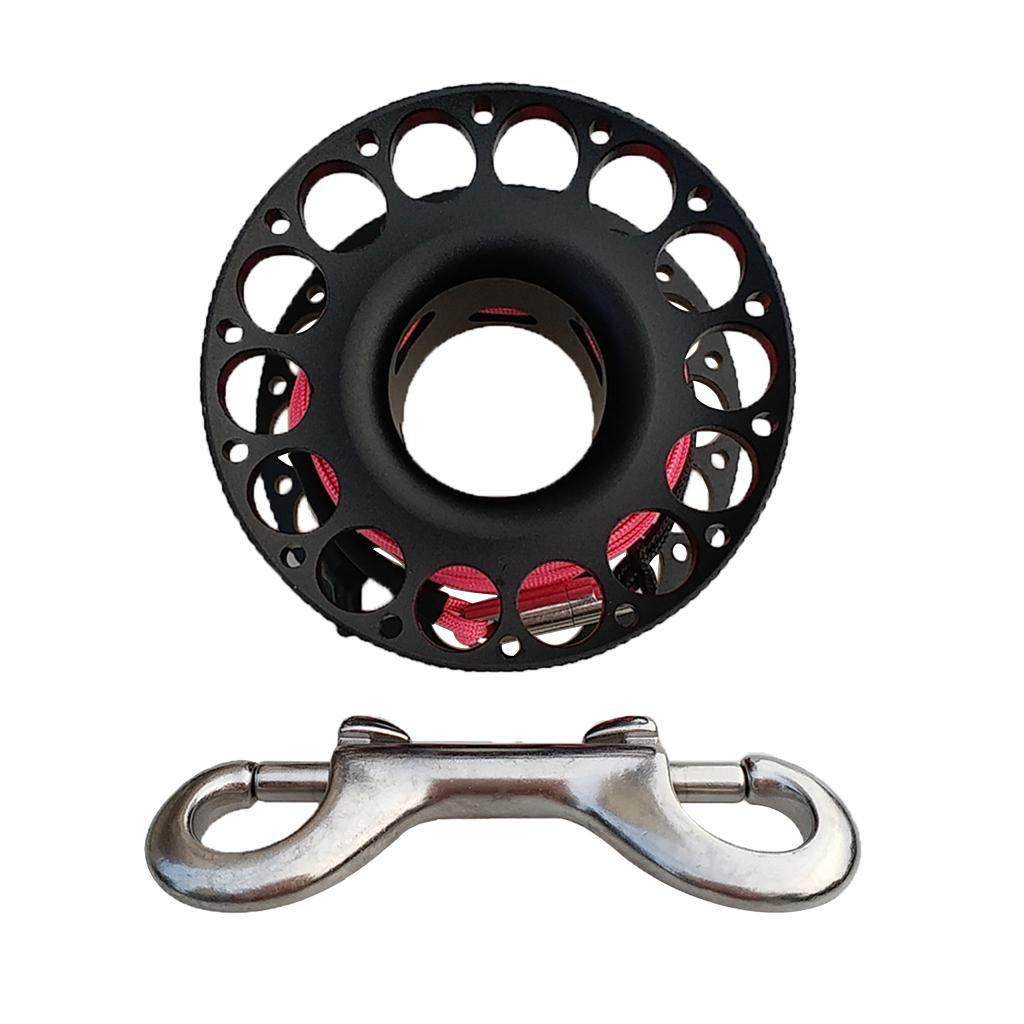 -Scuba diving aluminum alloy compact finger spool reel with 30m/98ft high visibility wear-resistant line.