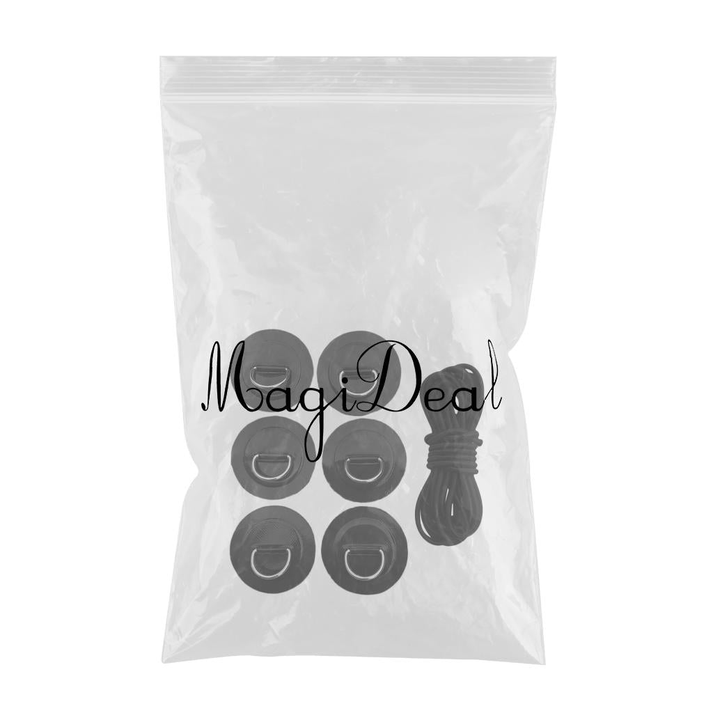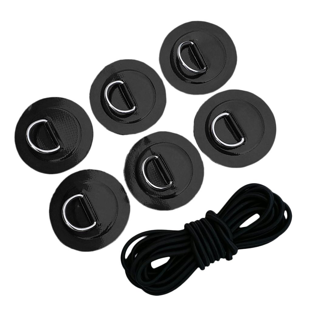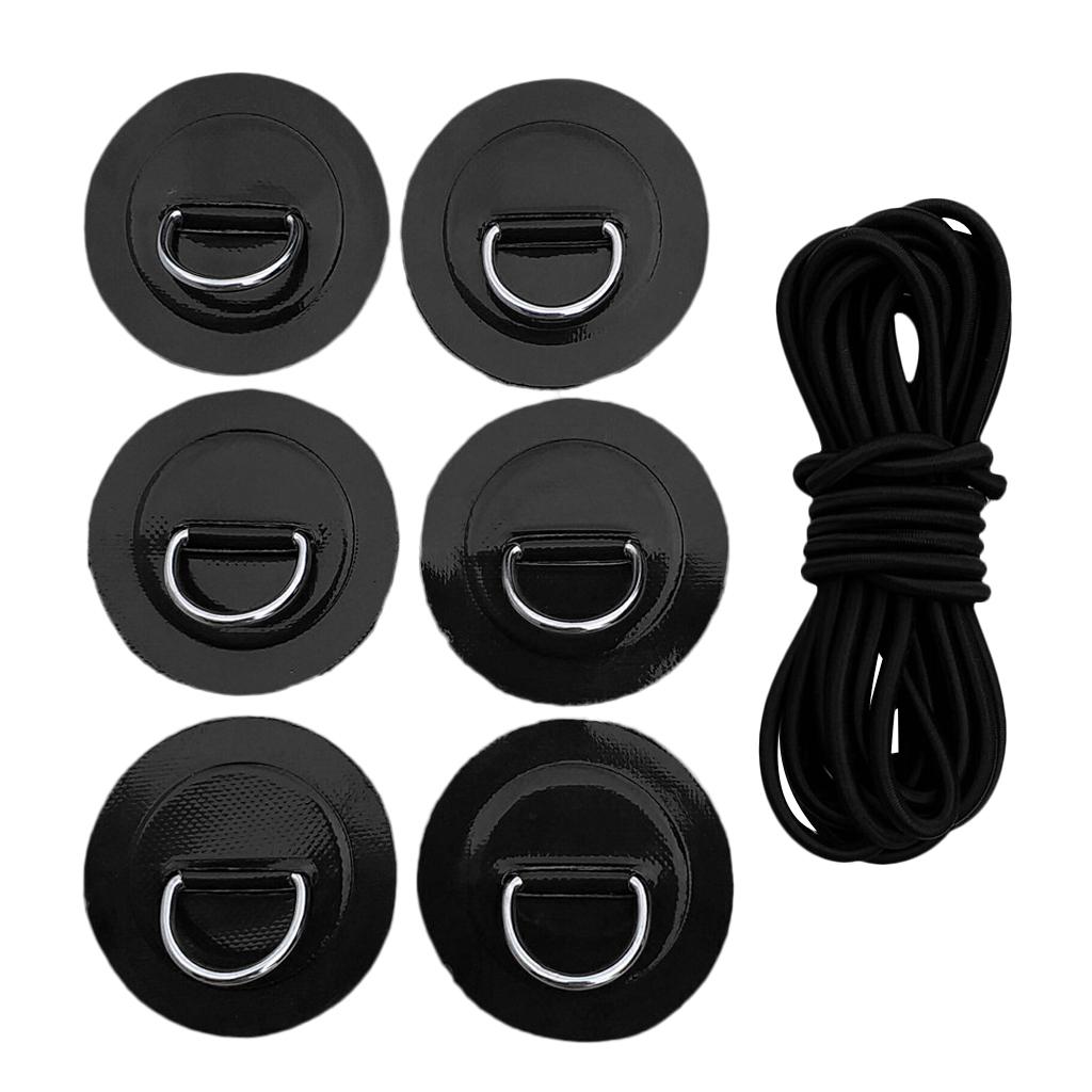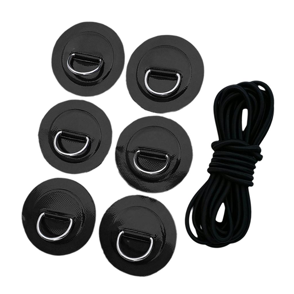 1 Set kit includes: 6 stainless steel D rings patches and 5mm black elastic bungee cord.