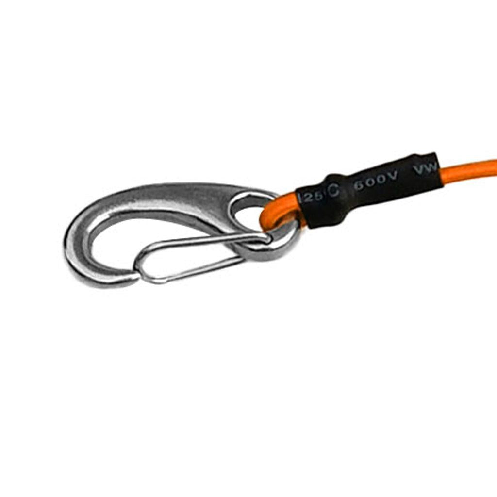 With strong stainless steel spring loaded carabiner clip at one end, can clip to your life jacket, decking rigging pad eye or D ring