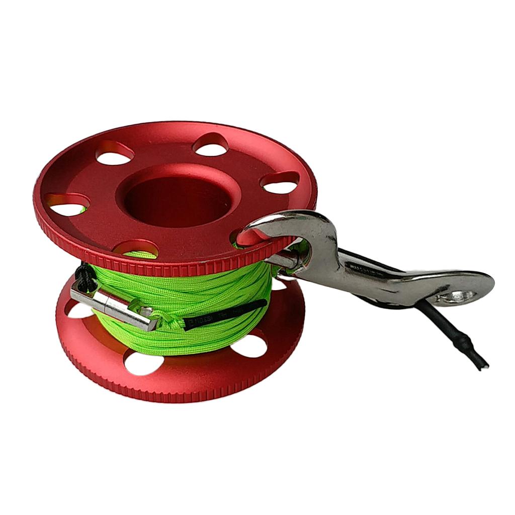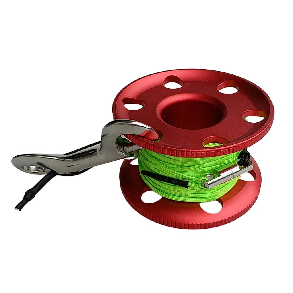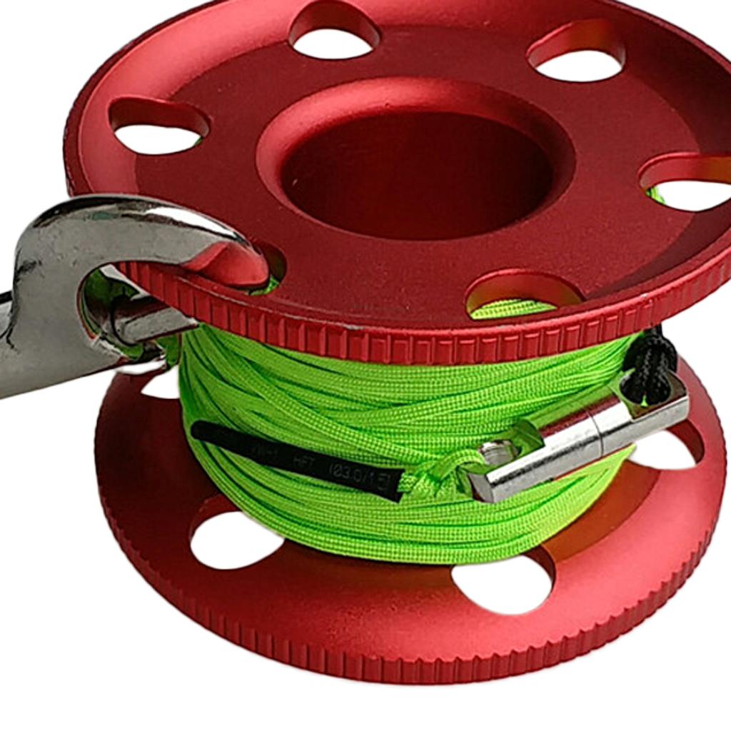 Scuba diving aluminum alloy compact finger spool reel with high visible fluorescent green and orange line.