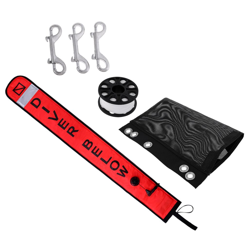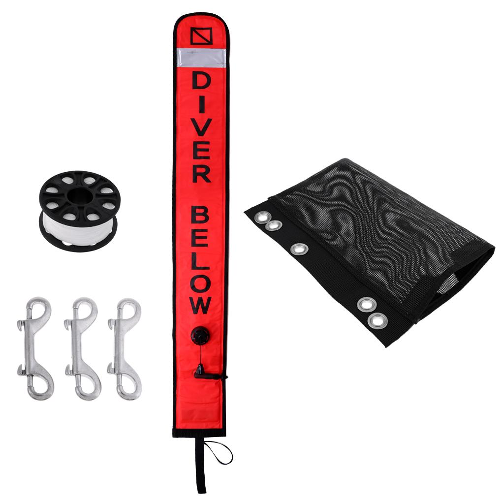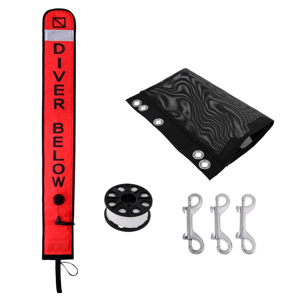1 Set safety underwater scuba diving gear kit ,including 1 diver down surface marker buoy, 1 dive reel spool , 3 double end bolt snap with 1 mesh gear bag