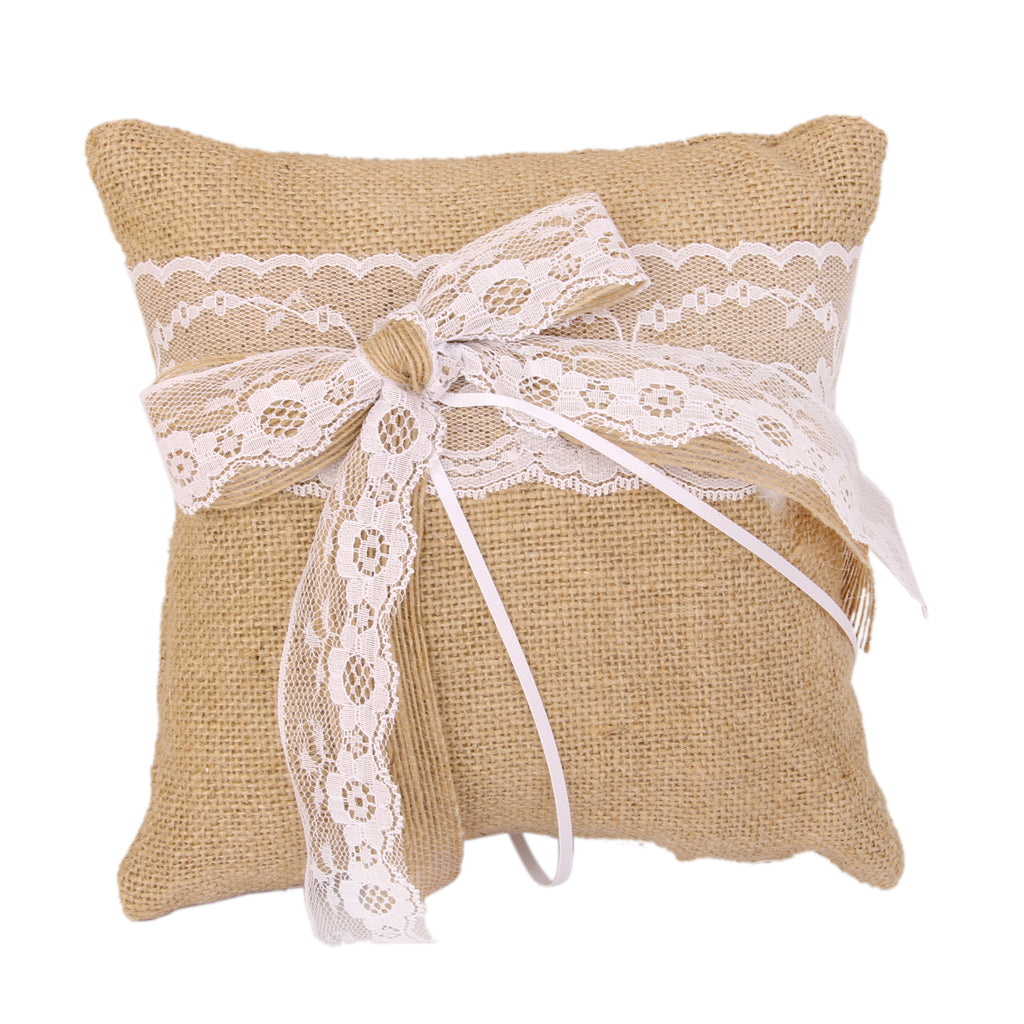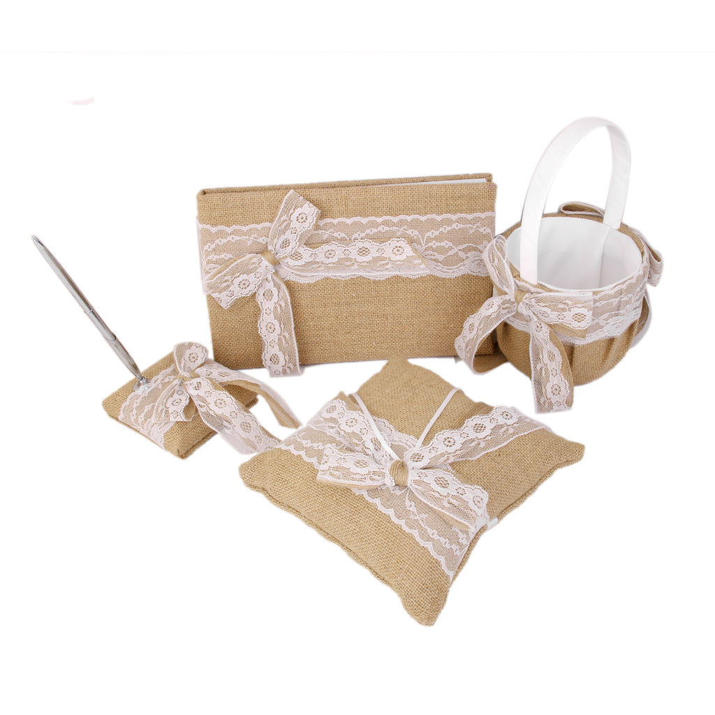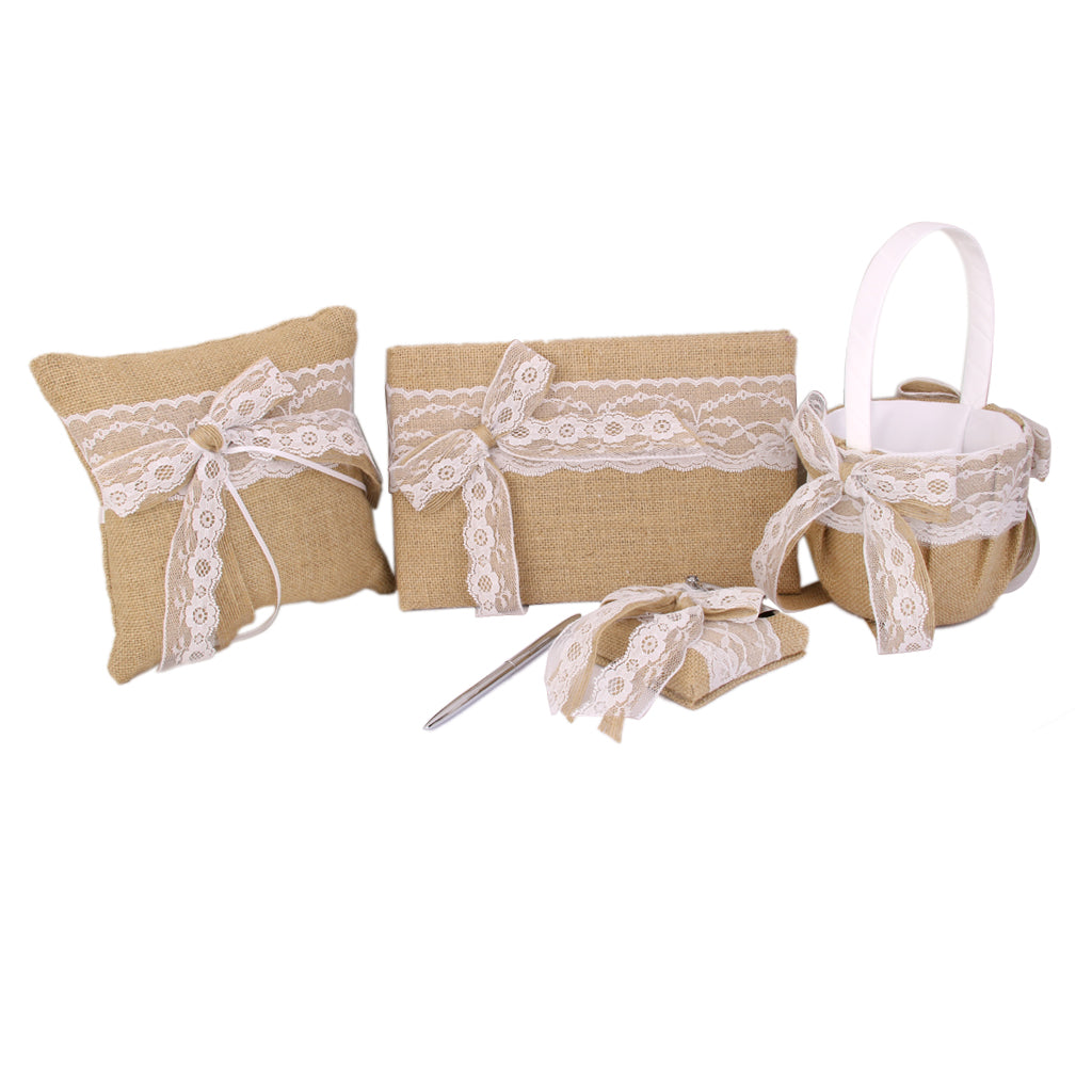 Bring elegance and rustic design together with this burlap collection set decorated in delicate lace.The set is covered in burlap and accented by Bowknot
