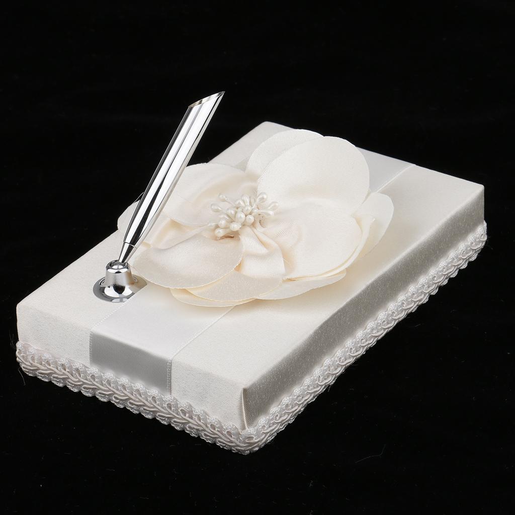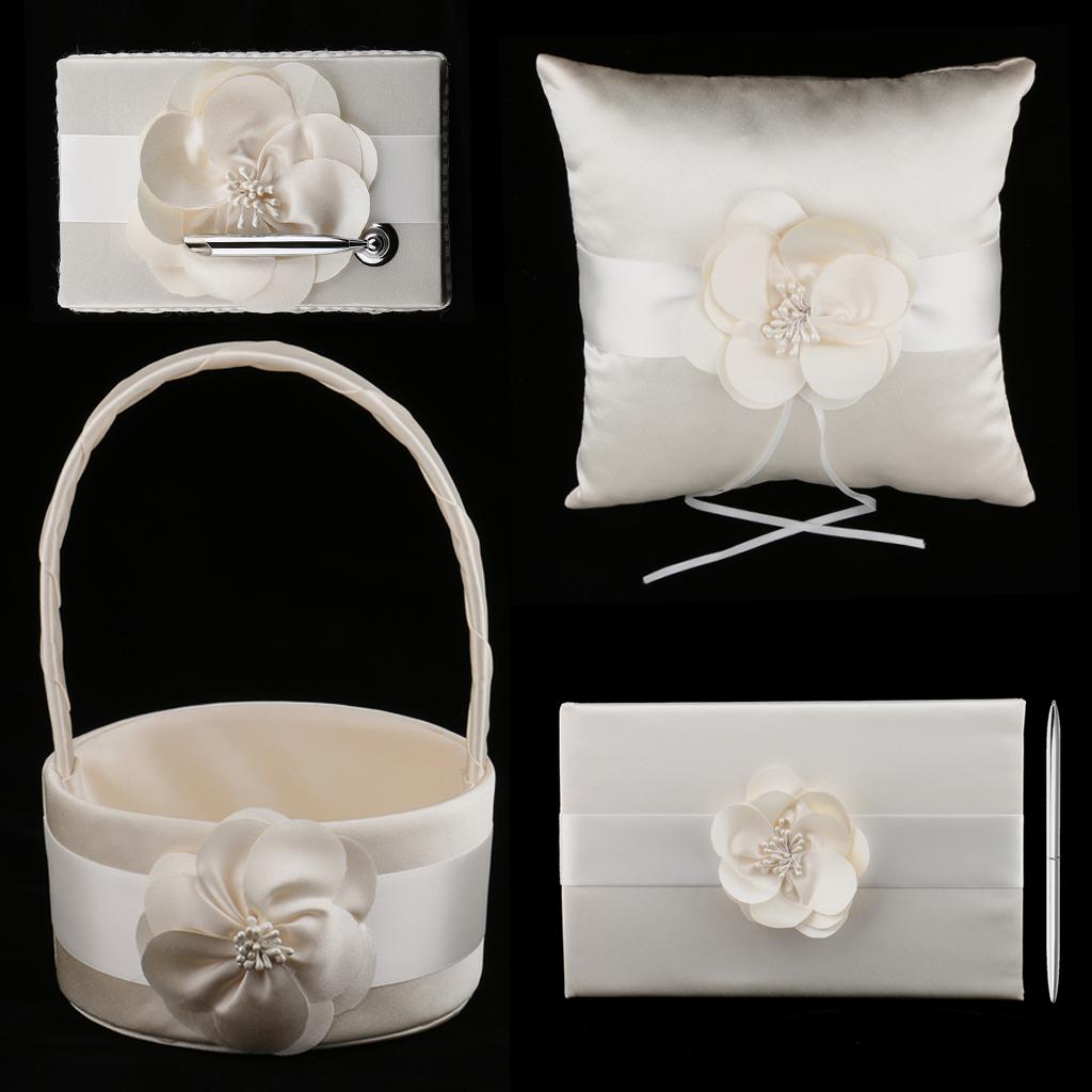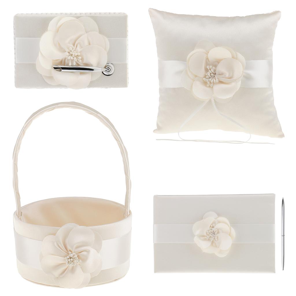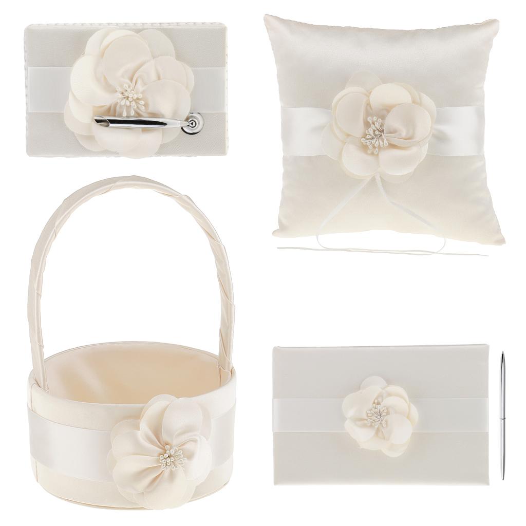 Set includes flower girl basket,ring pillow, guest book, pen holder,pen