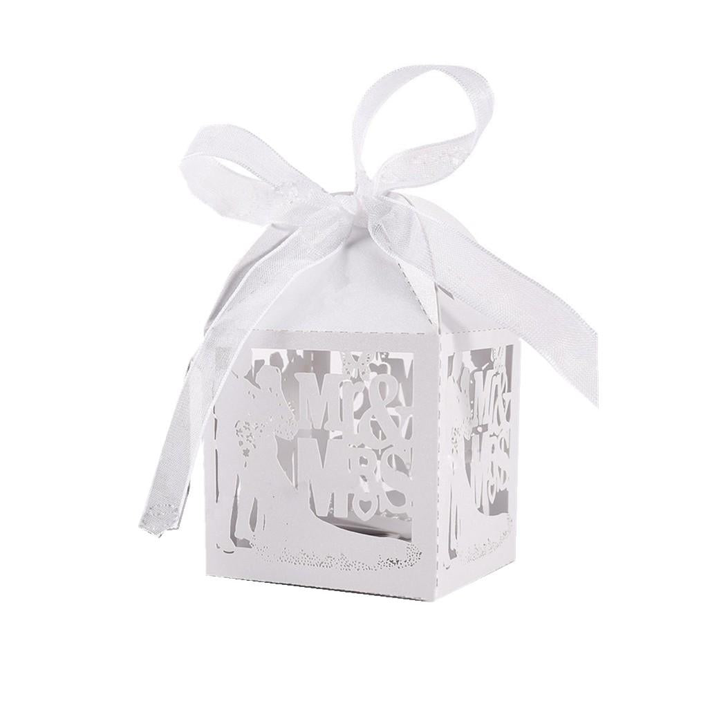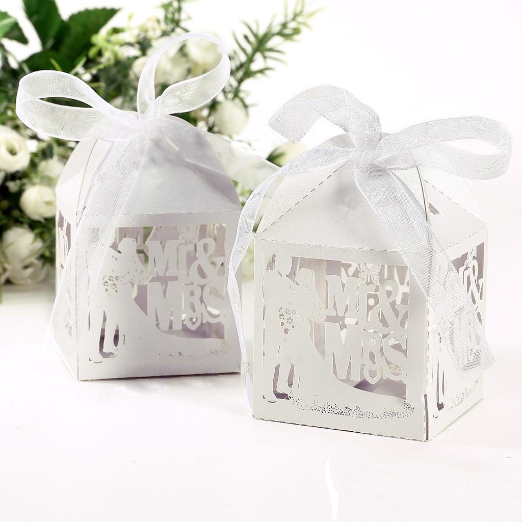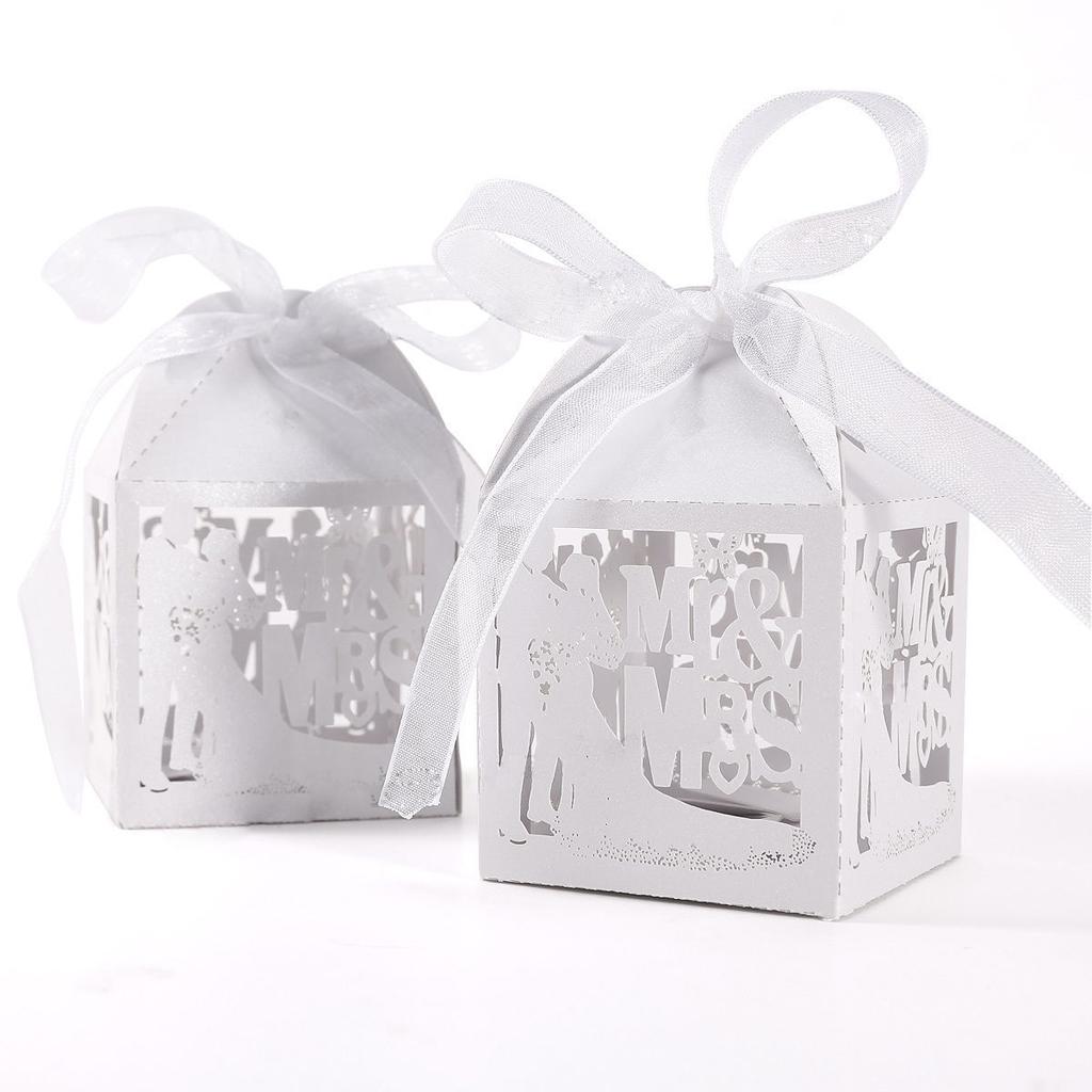 50pcs Bride Groom Laser Cut Gift Candy Boxes with Ribbon Wedding Party Favor