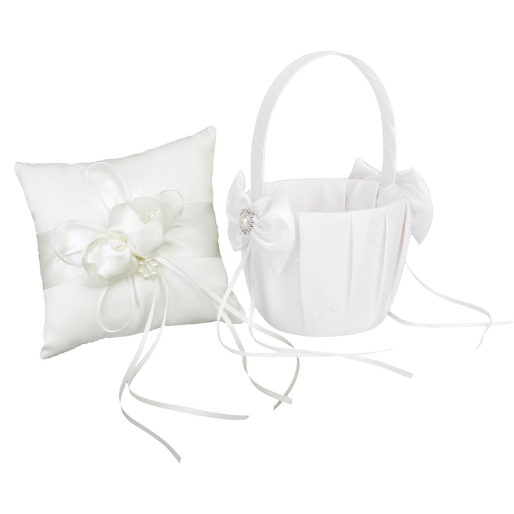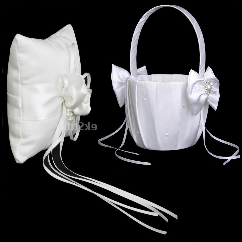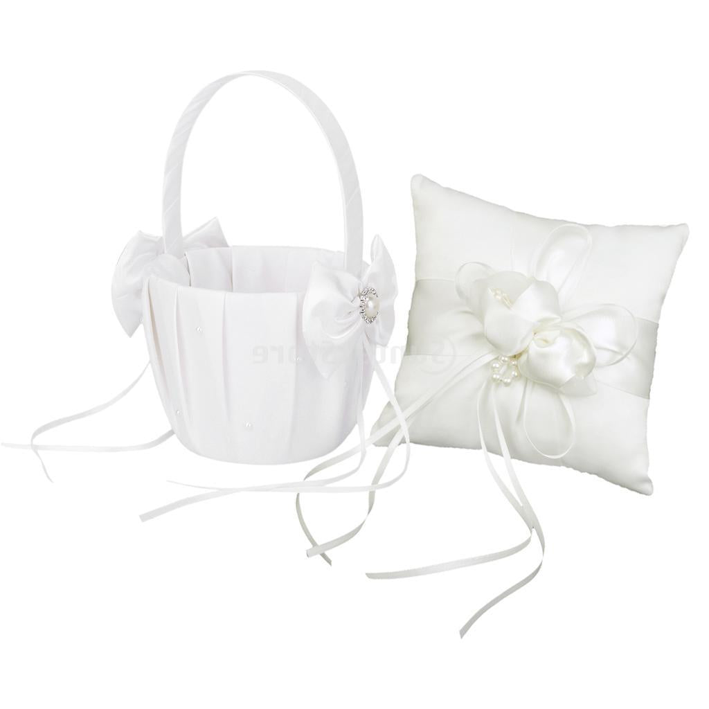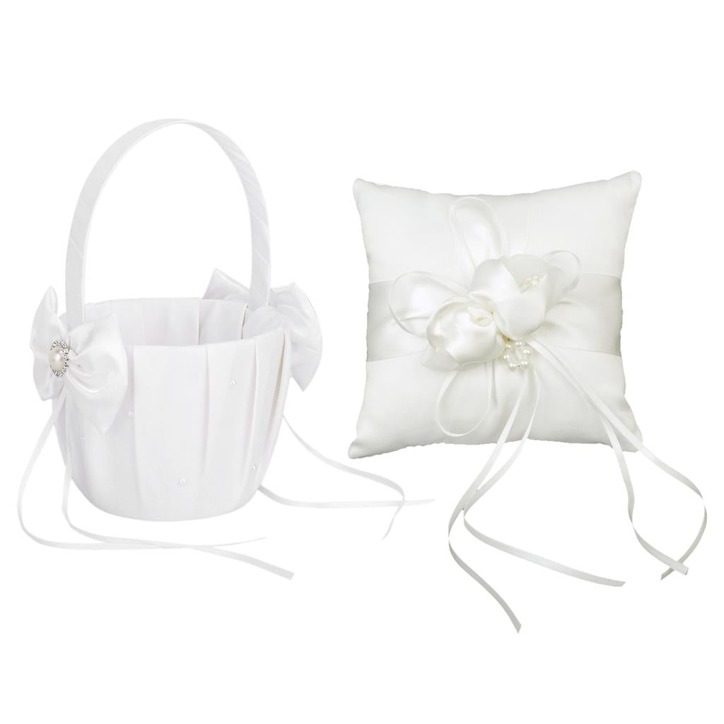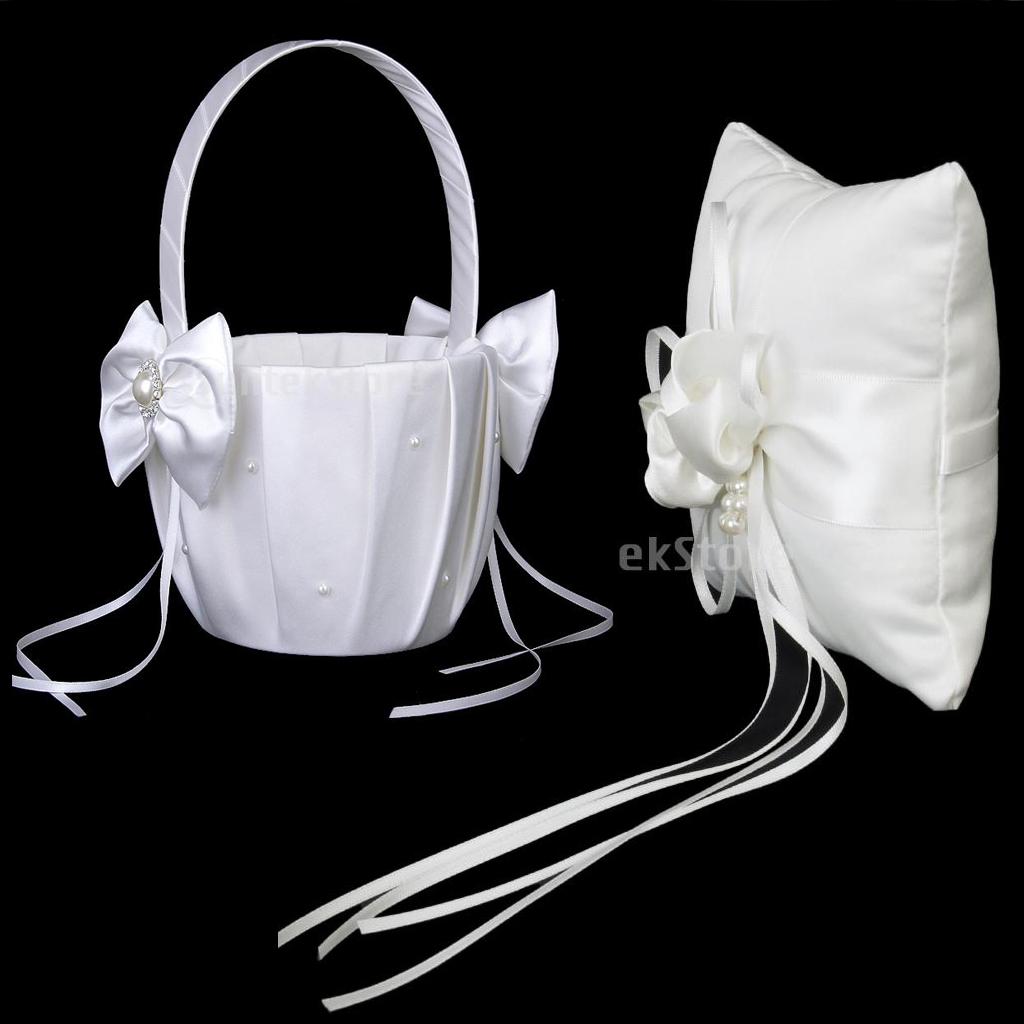 Beige Satin Bowknot Wedding Flower Girl Basket Ring Bearer Pillow Set Gift