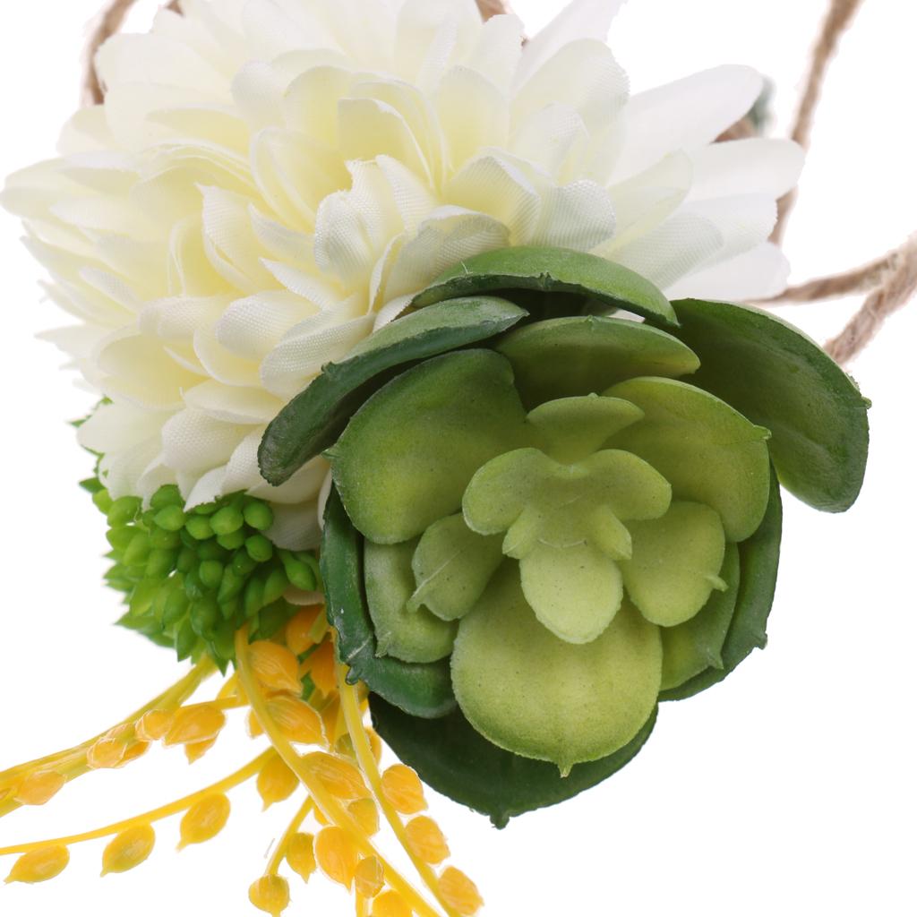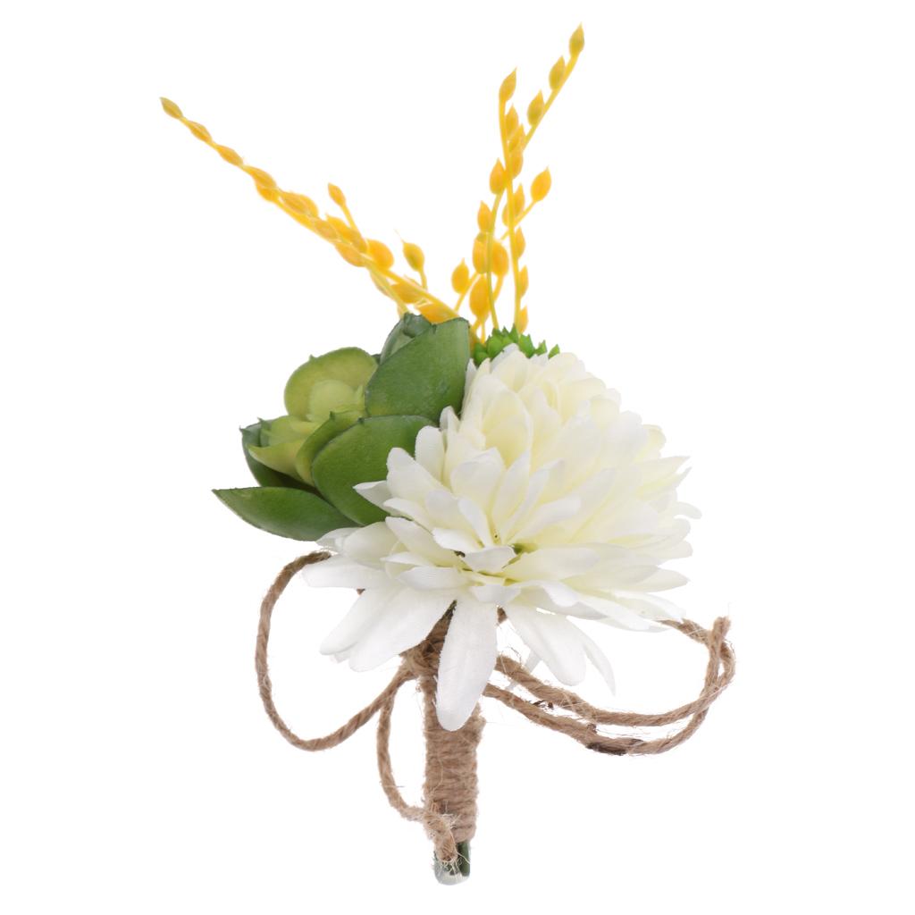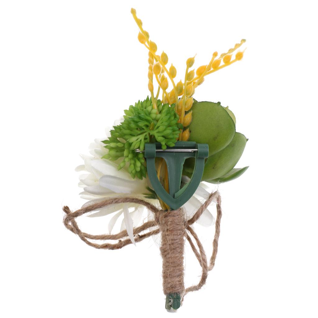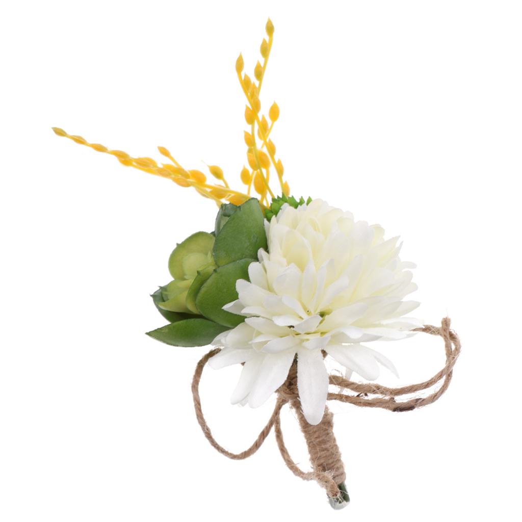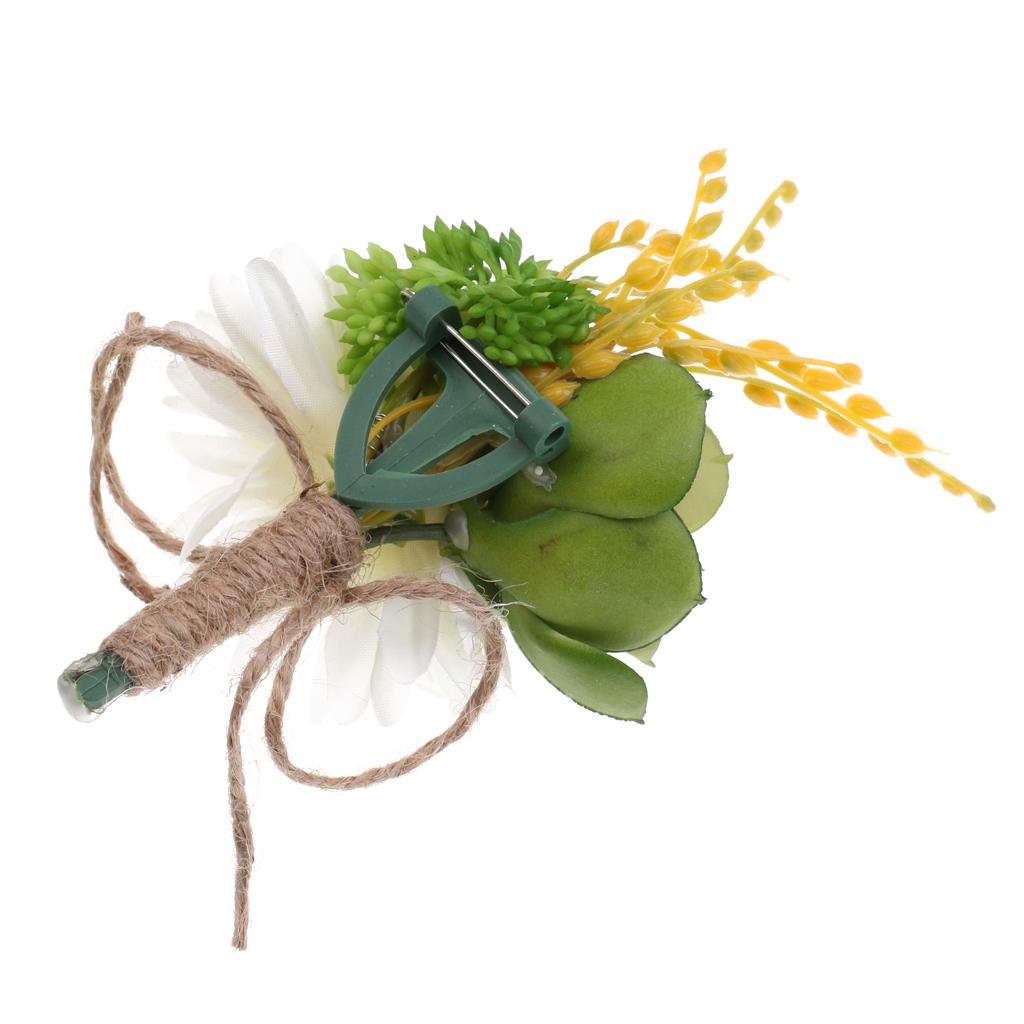 Artificial flower and leaf brooch corsage with twine rope decoration.