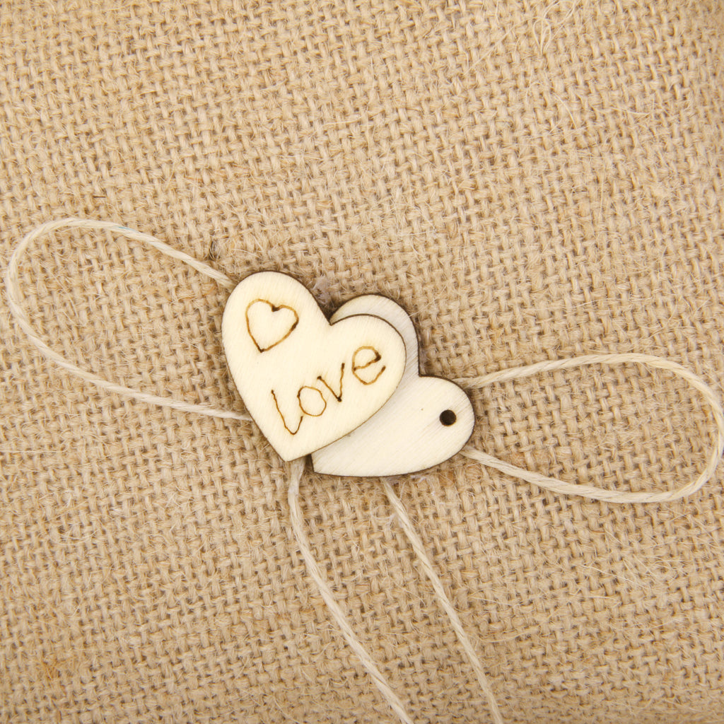 • Handmade burlap ring bearer pillow with  wooden hearts.