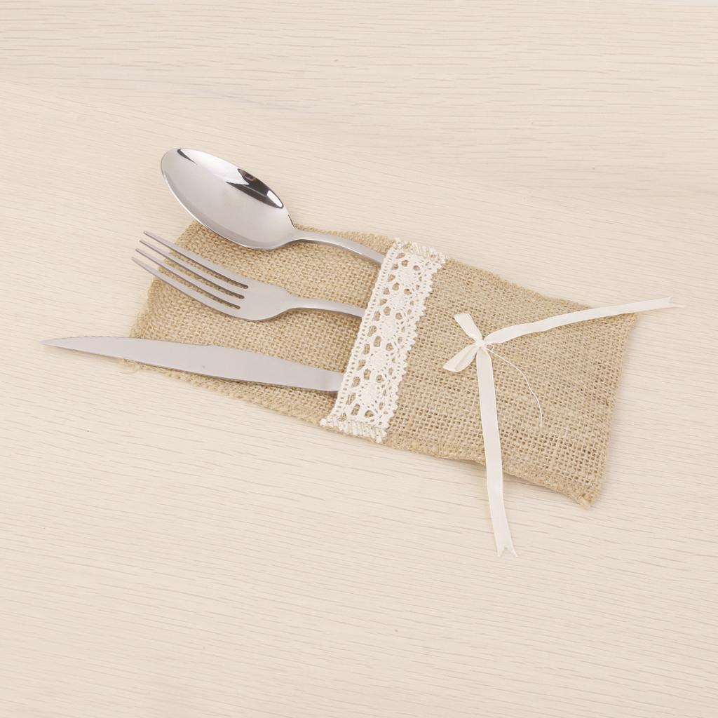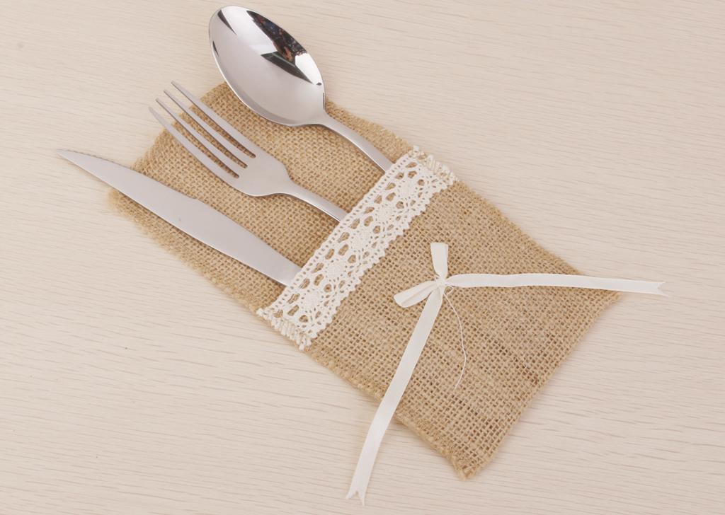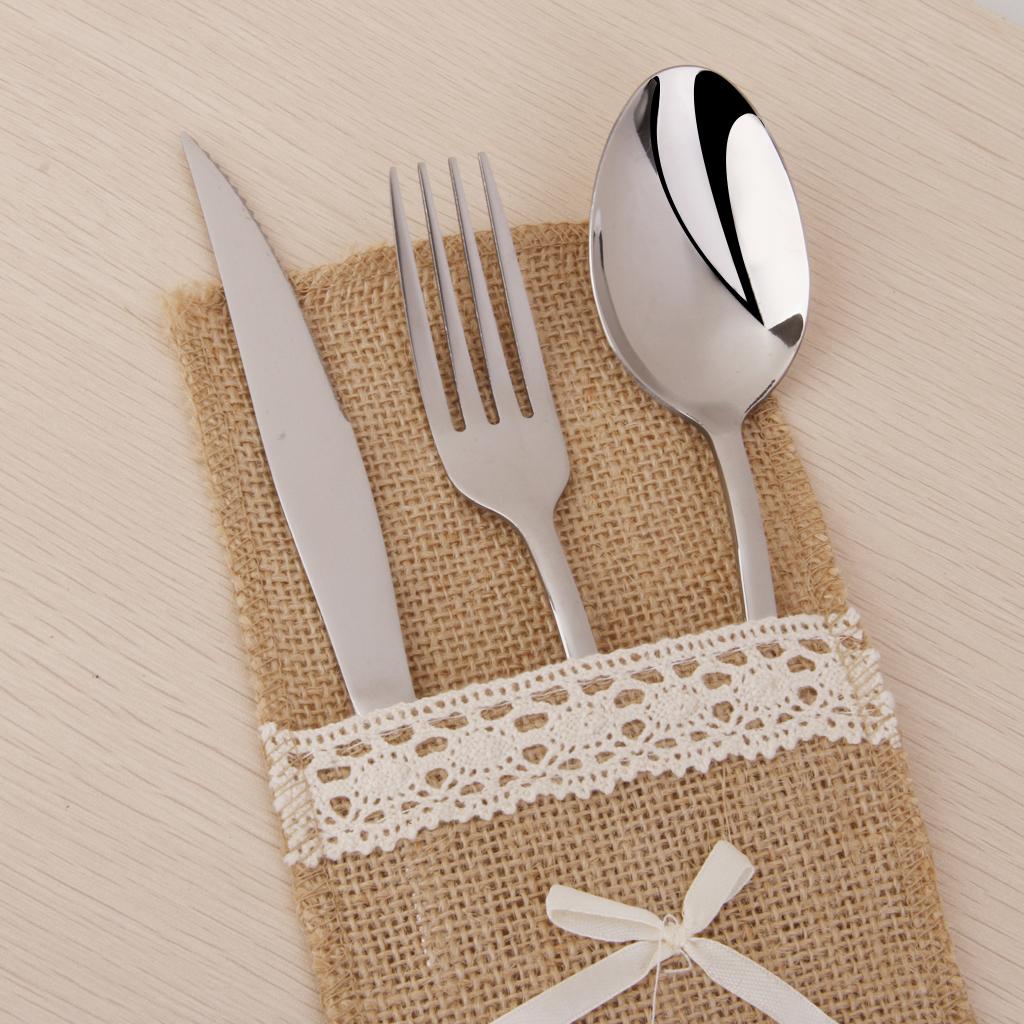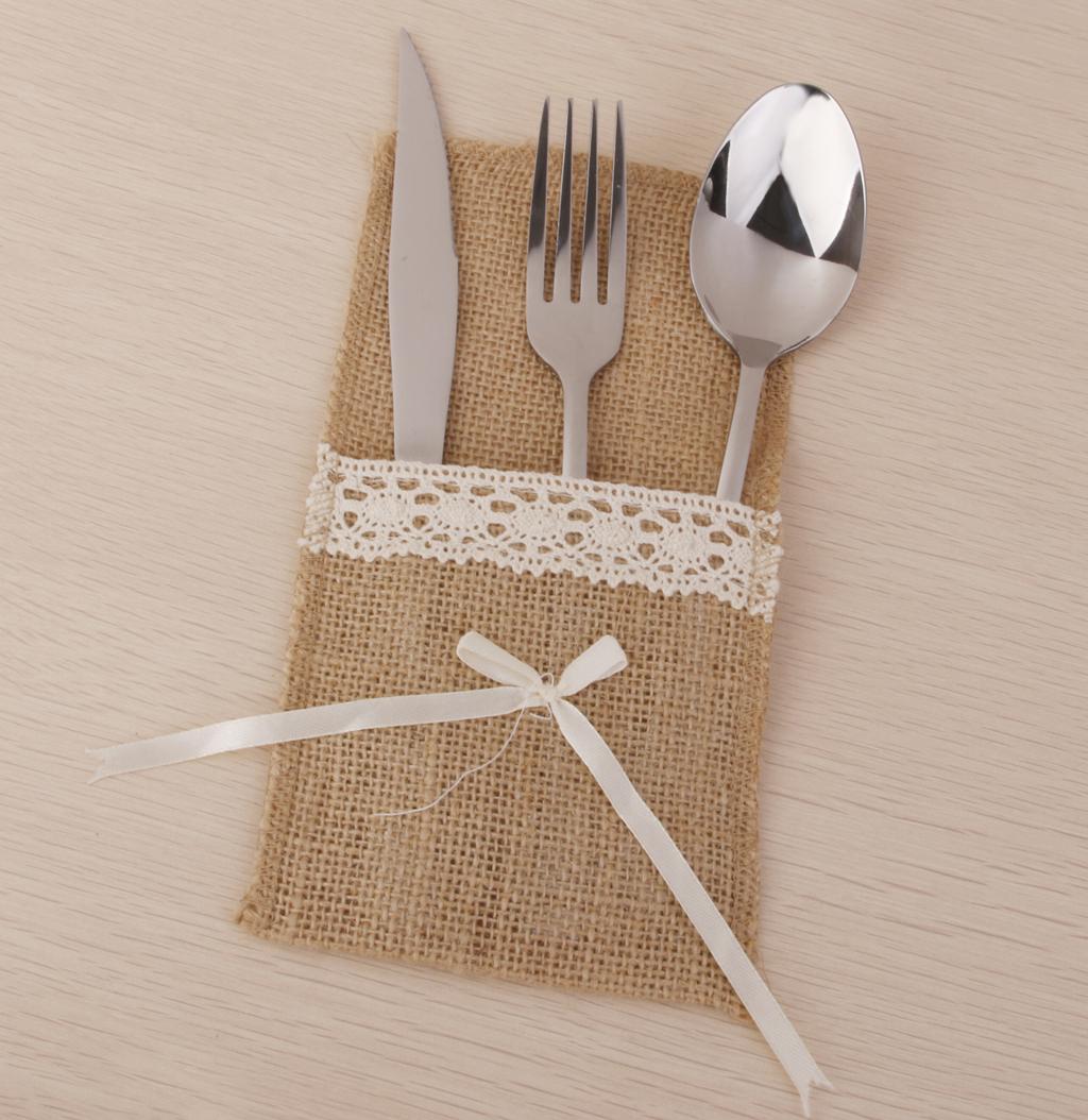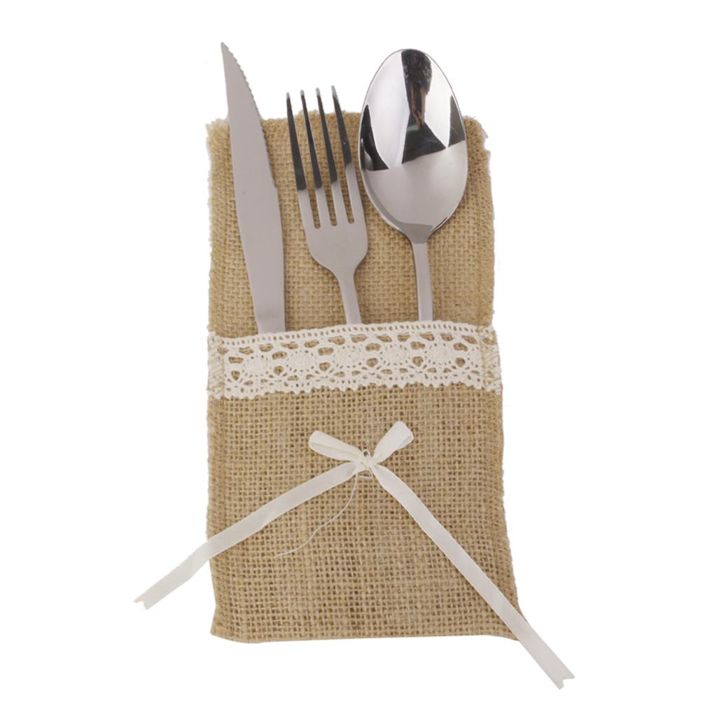 Hessian Rustic Burlap Cutlery Holder Silverware Holder w/ Bowknot Lace Decor