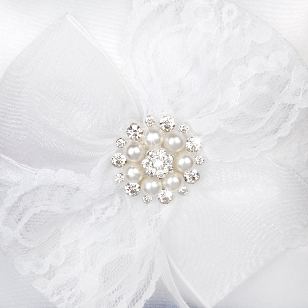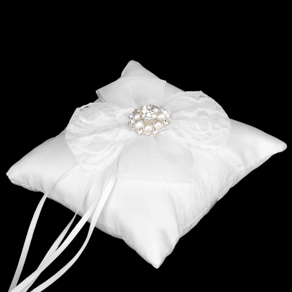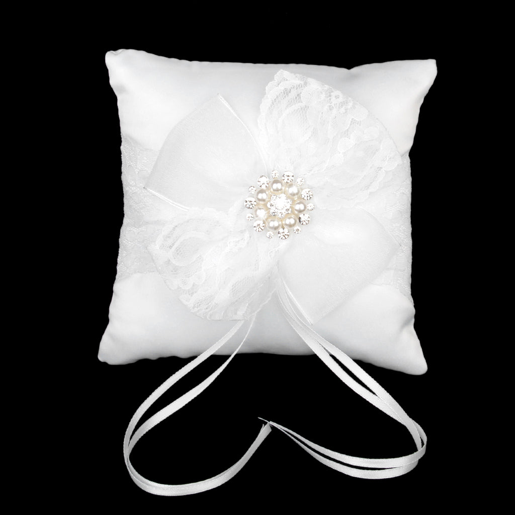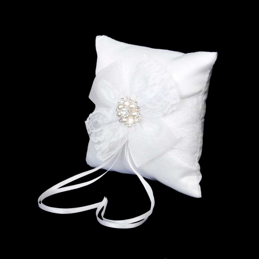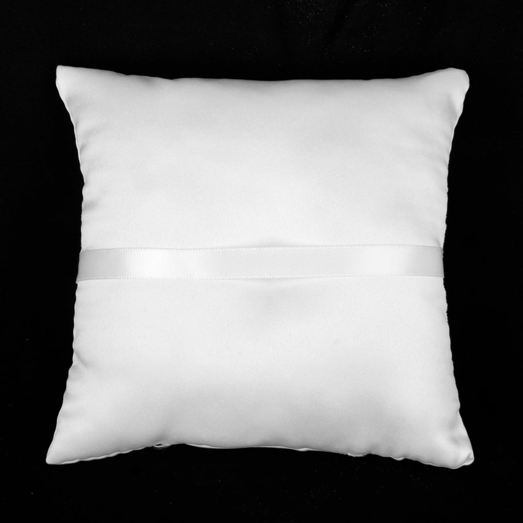 • White ring pillow decorated with satin ribbon and bow flower diamante buckle to tie the ring
